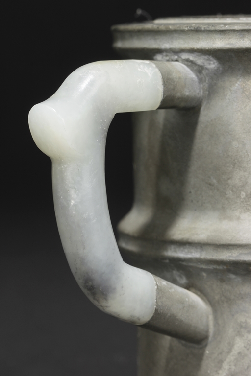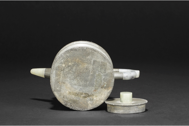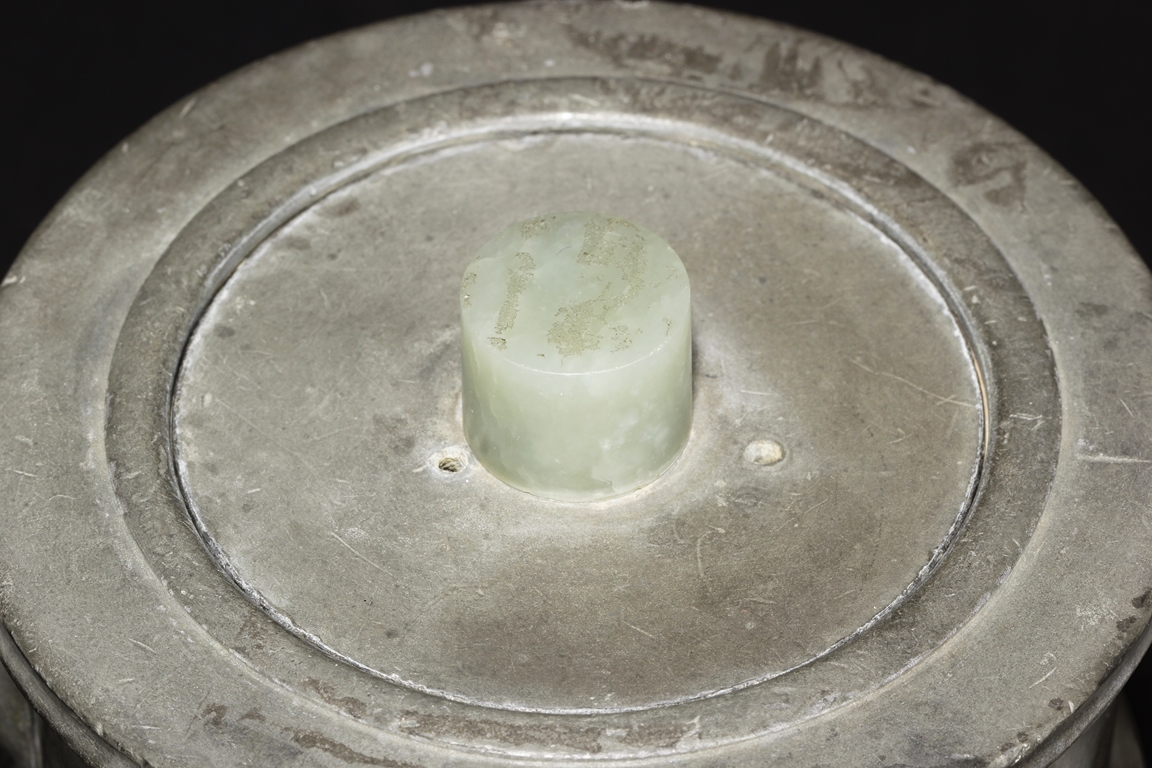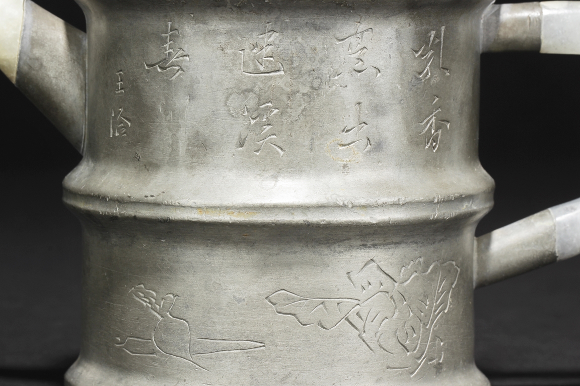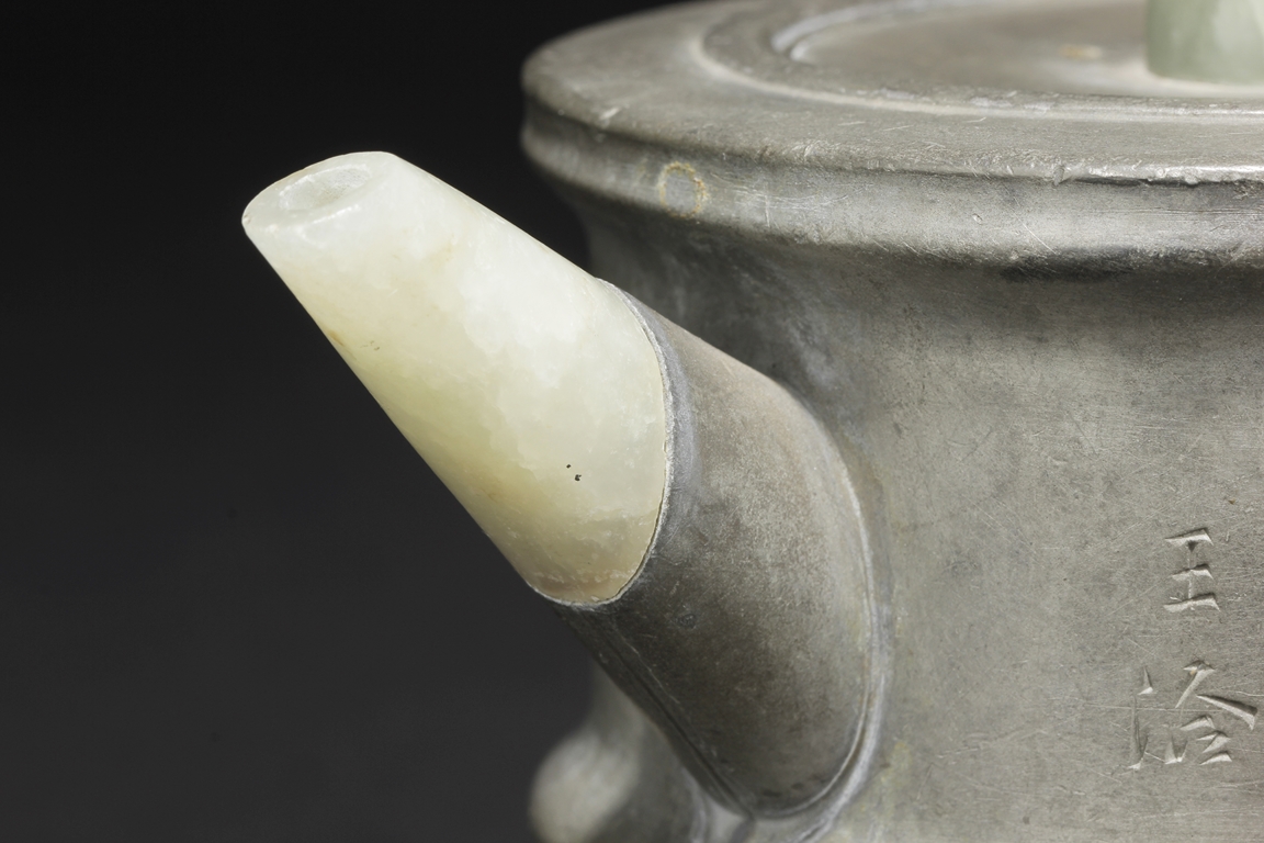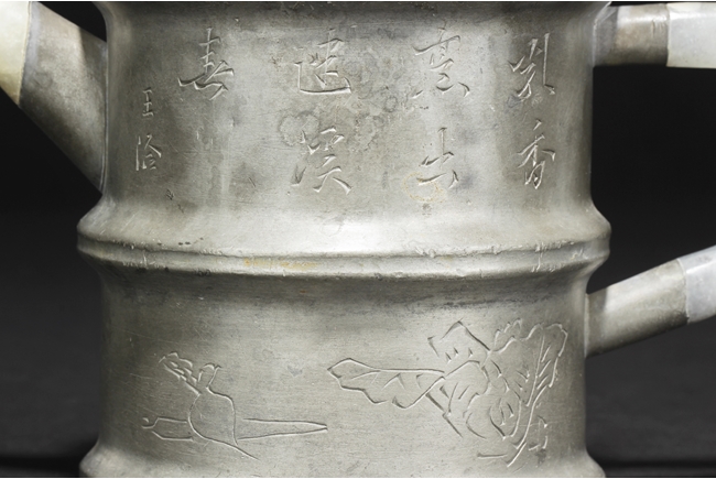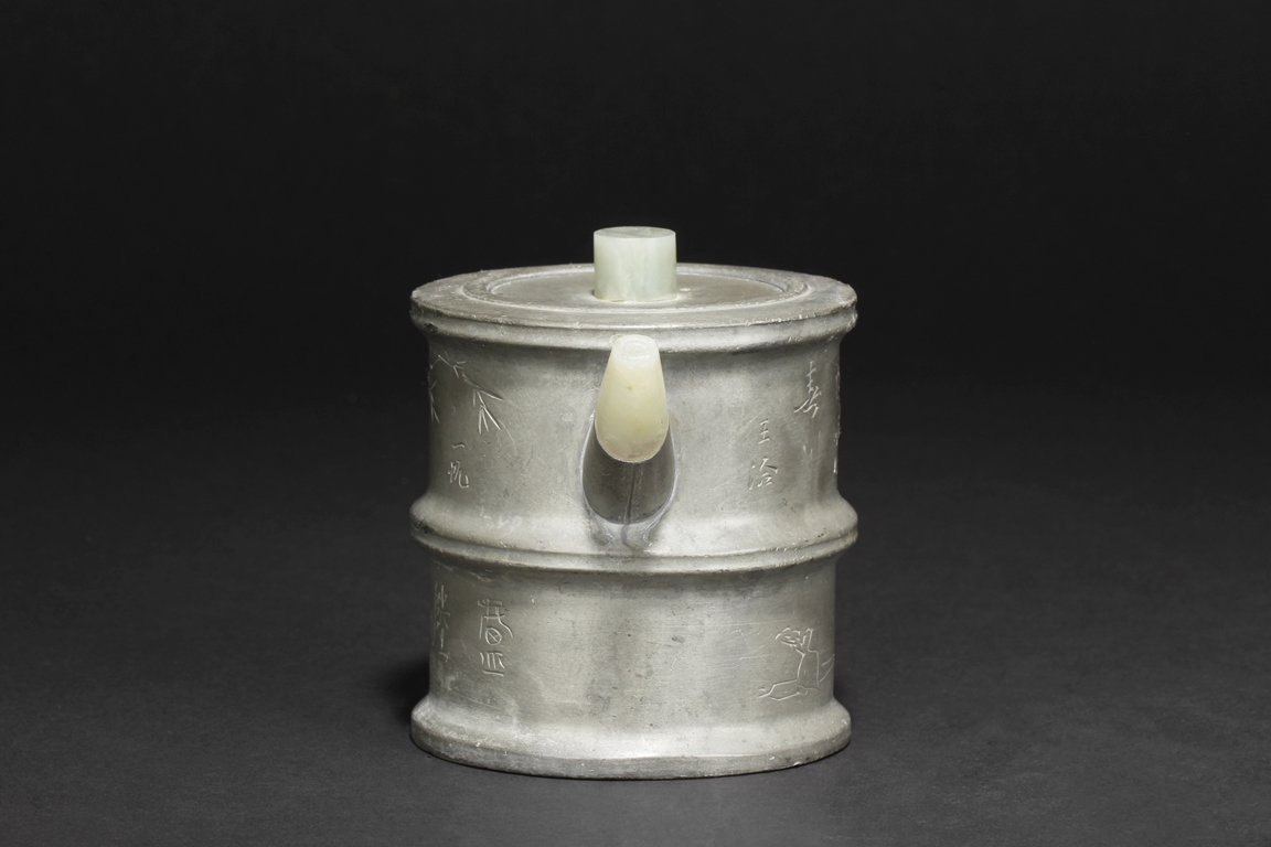 Of cylindrical bamboo sections form, with the exterior encased in pewter, incised with calligraphy, cabbage, radish, and bamboo. The handle, spout tip, and finial all made with jade, the lid with insertion design.