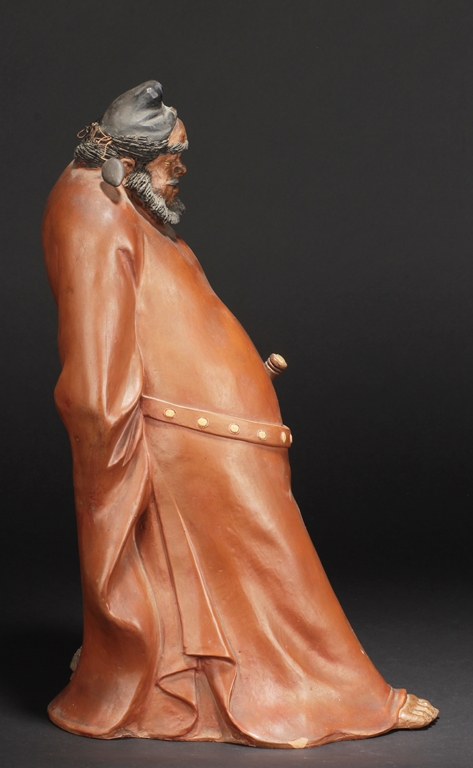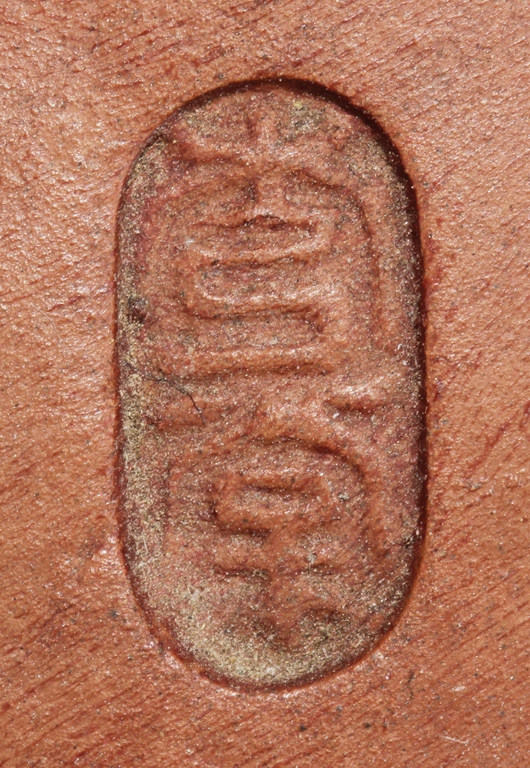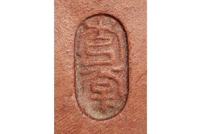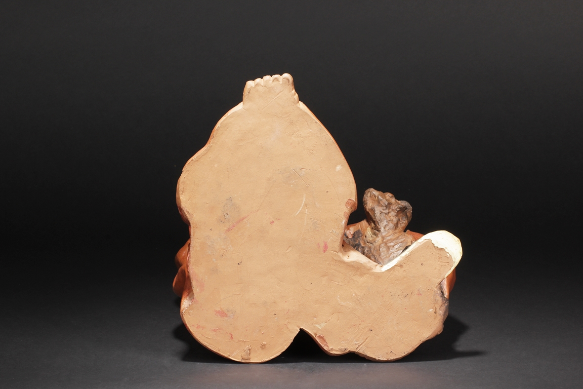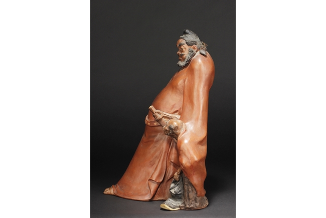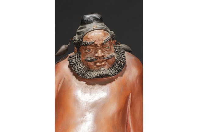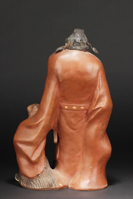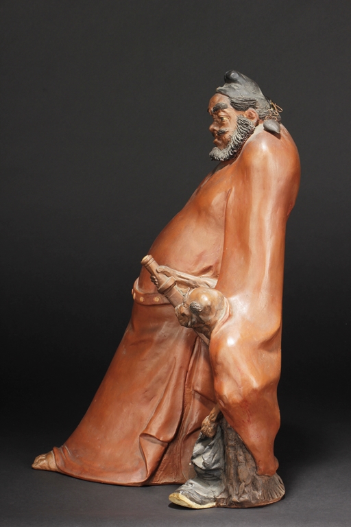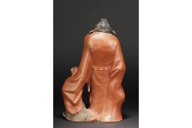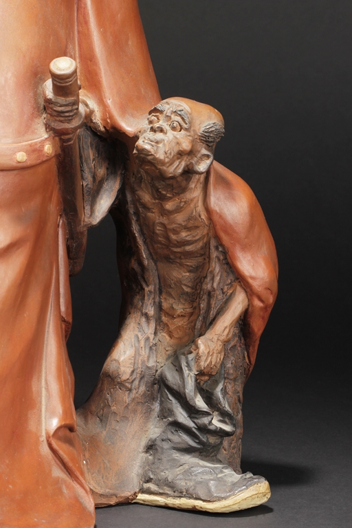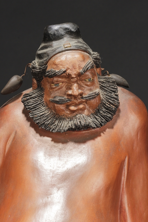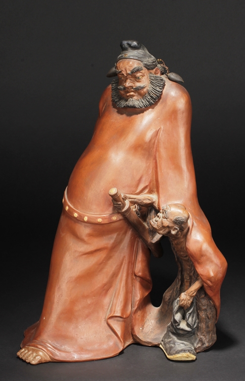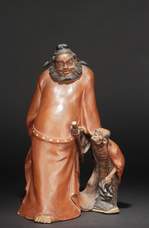 Based on Chinese folklore, the figural group depicts Zhong Kui, the vanquisher of evil and ghosts, dressed in long red official’s robe and hat, leading a ghost away in one hand, with serious and stern expressions. The ghost with playful expression, grabbing Zhong Kui’s sword on the belt. Two character mark "Xiu Tang" on the back. Xu Xiutang, born in December 1937, in a Yixing pottery family, is a renowned Yixing pottery maker with many titles. His famous works received numerous awards from both domestic and international competitions.