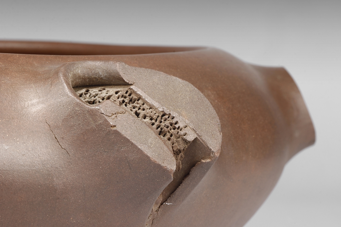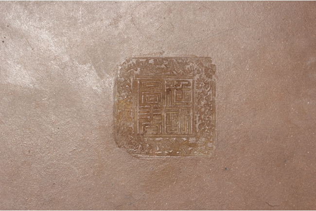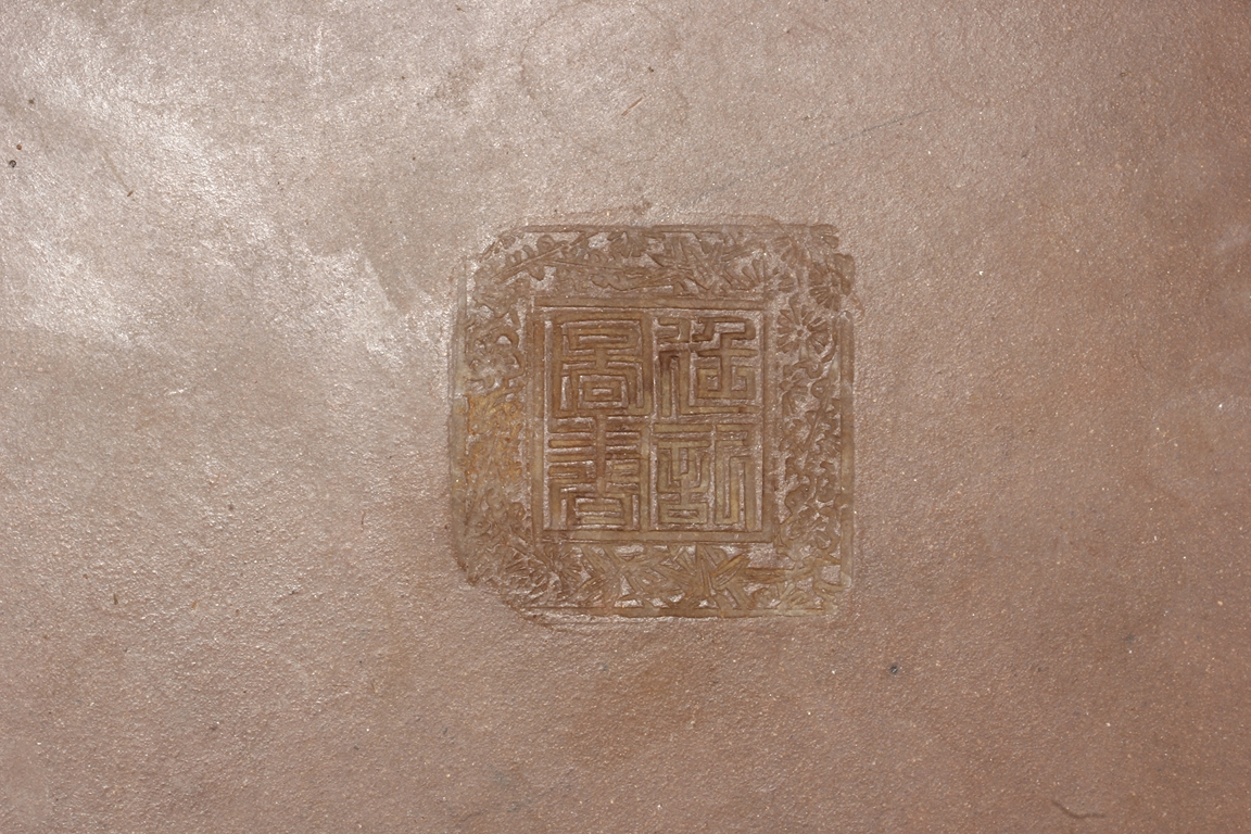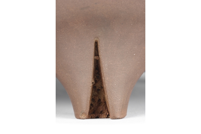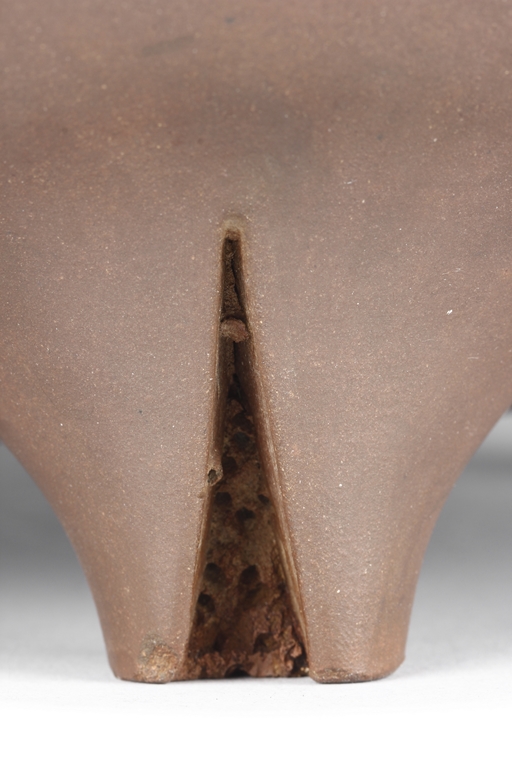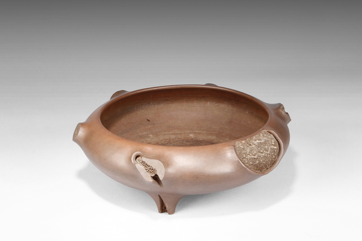 Of compressed ovoid form, the body in naturalistic tree stump form with remains of severed branches, supported by three tapering short feet with artistic cracks, all with orange-brown color. Bottom bears four character mark "Yanji Tushu", surrounded within a panel of floral patterns. Similar Yanji Tushu mark was seen on "Yangtong" teapot made by Wen Cai. Wen Cai was born during late Qing Dynasty period, and he a renowned potter known for "Yangtong" teapots.