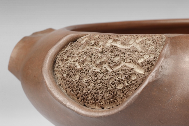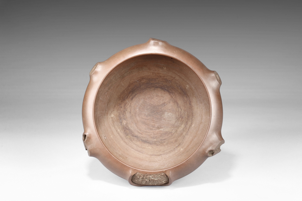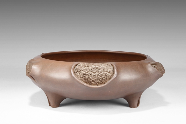 類似款式在聞才製洋桶壺上有見過,聞才為清末民初人,與儲銘齊名,其洋桶壺以大而精著名,當時的國良傳爐,以洋桶聞才衆所周知,更為藏家所求。此盆古雅質樸,書香味濃,書房擺設典雅溫馨,值得收藏。