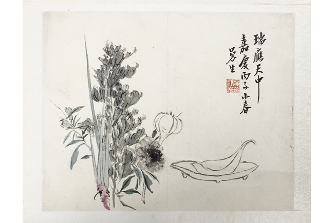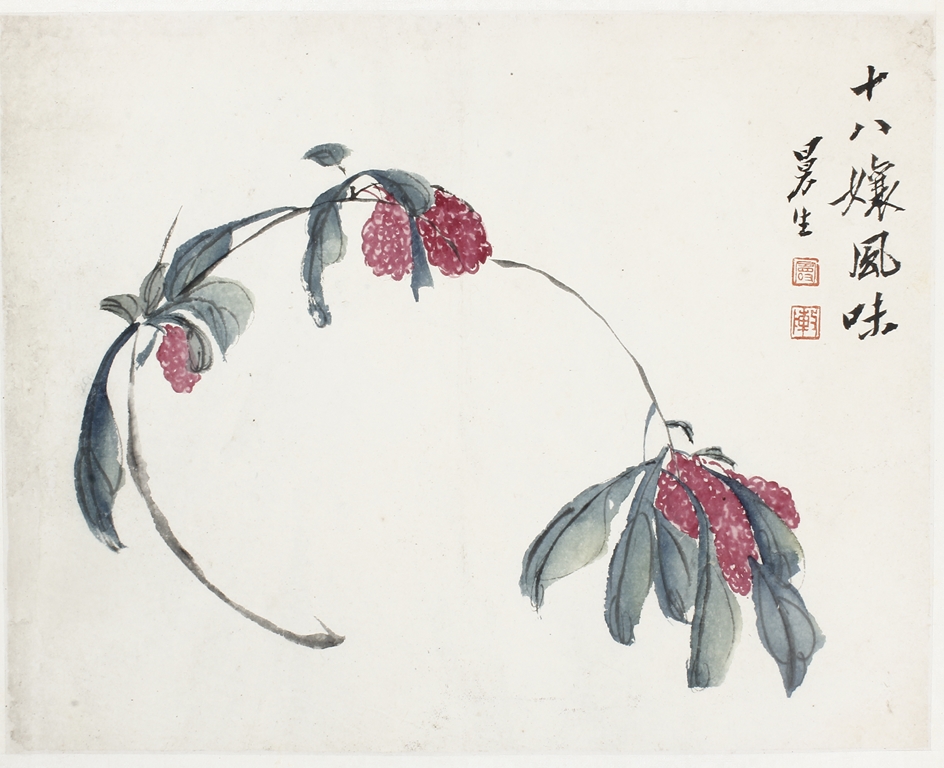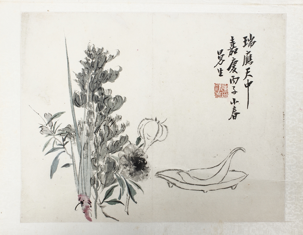 The booklet contains ten equal sized color and ink on paper paintings including a variety of flowers, vegetables, and plants, all with colophon, artist signature and mark "Chen Hongshou".