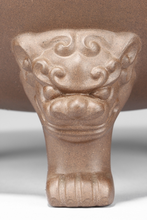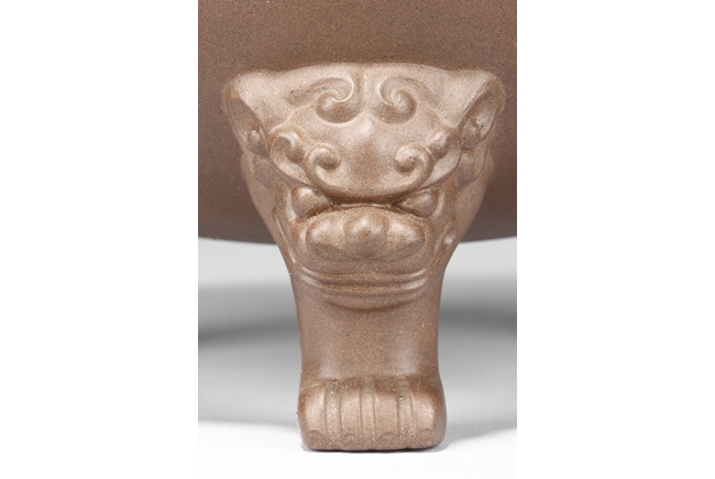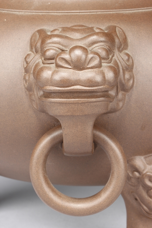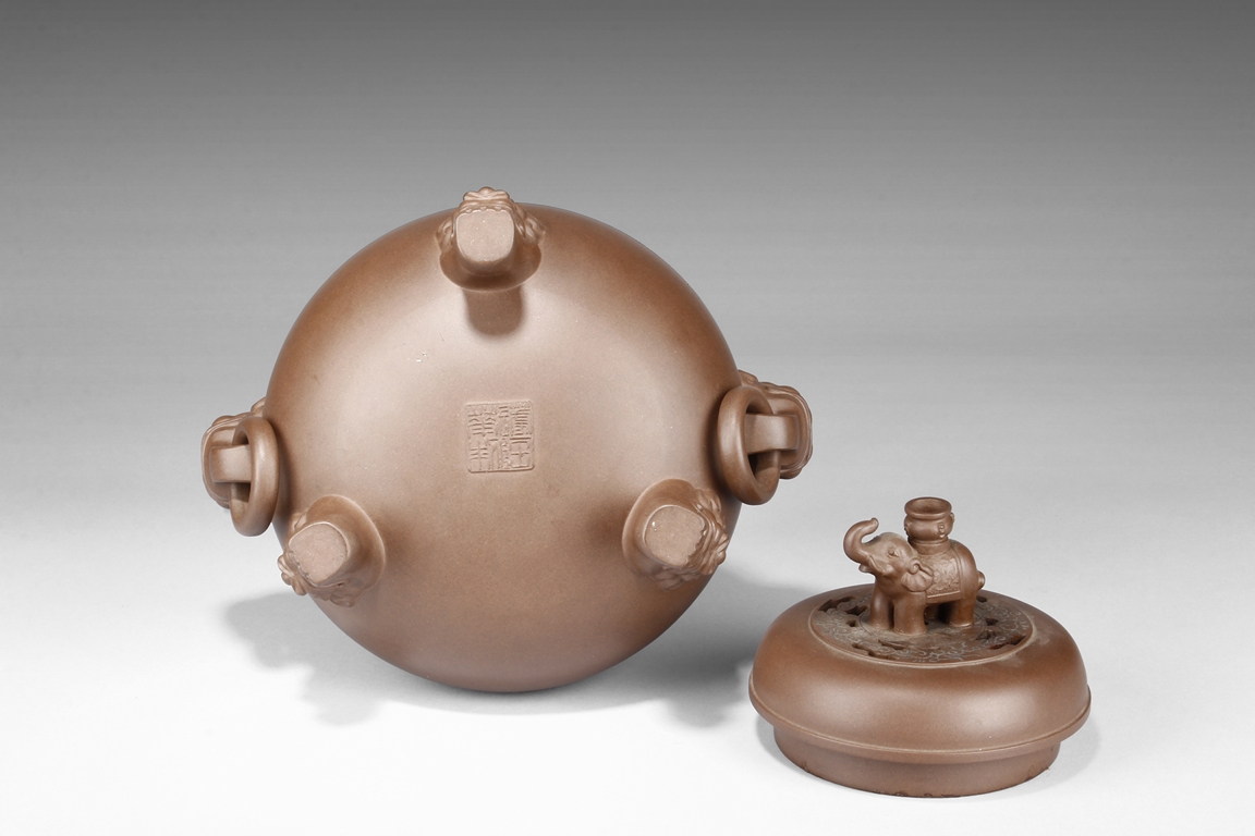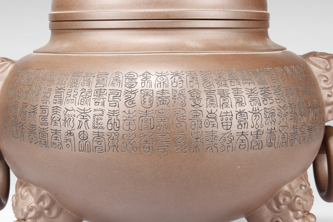 Of globular form, the jar with similar design to jade tripod censer, the body supported by three hoof legs extending from lion masks, one side of body incised with one hundred different iterations of Chinese character "Shou", the other side incised with one hundred different iteration of Chinese character "Fu", signifying longevity and prosperity, a pair of lion mask ring handles between the characters, the finial in the shape of elephant carrying a jardiniere, and bottom bears four character "Qu Hua Zhi Tao" mark. Shen Quhua, born in 1939 at Shu Shan city Chang An village, started studying pottery under Master Gu Jingzhou in 1955, and was named the national flag bearer for All-China Women’s Federation in 1983. She has won first place trophy in Germany’s Leipzig International Convention. Her signature Yixing clay works include bamboo tea set, Yaotiao teapot, small jade pillar teapot, and this Yixing tripod jar with cover.