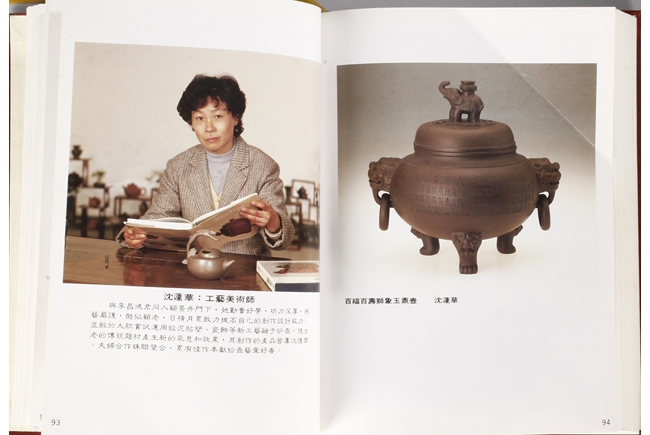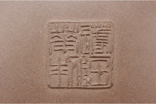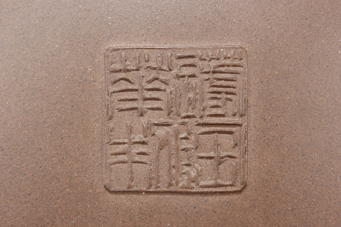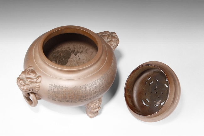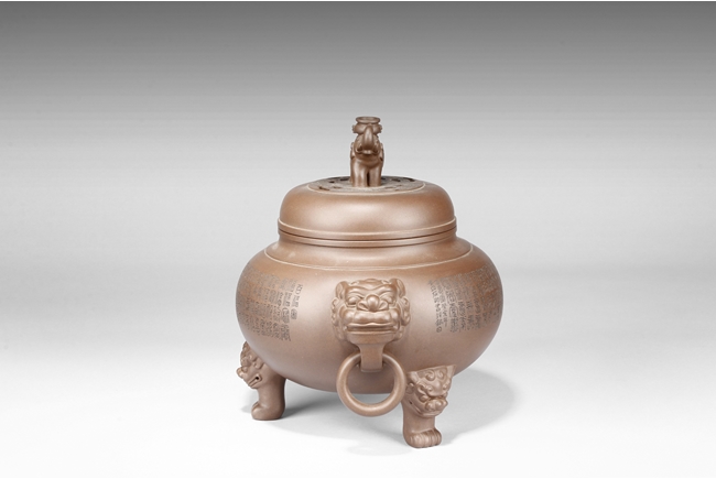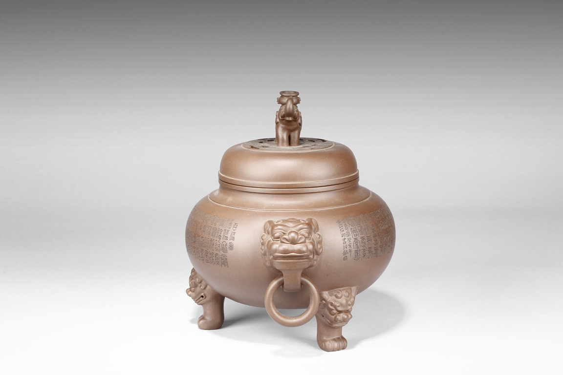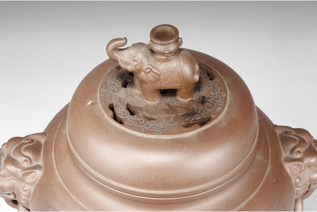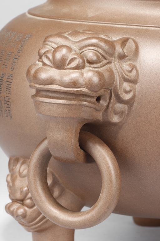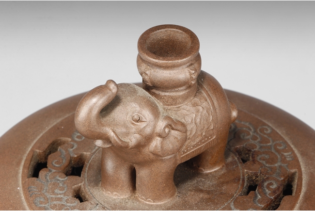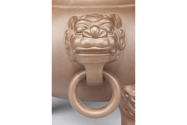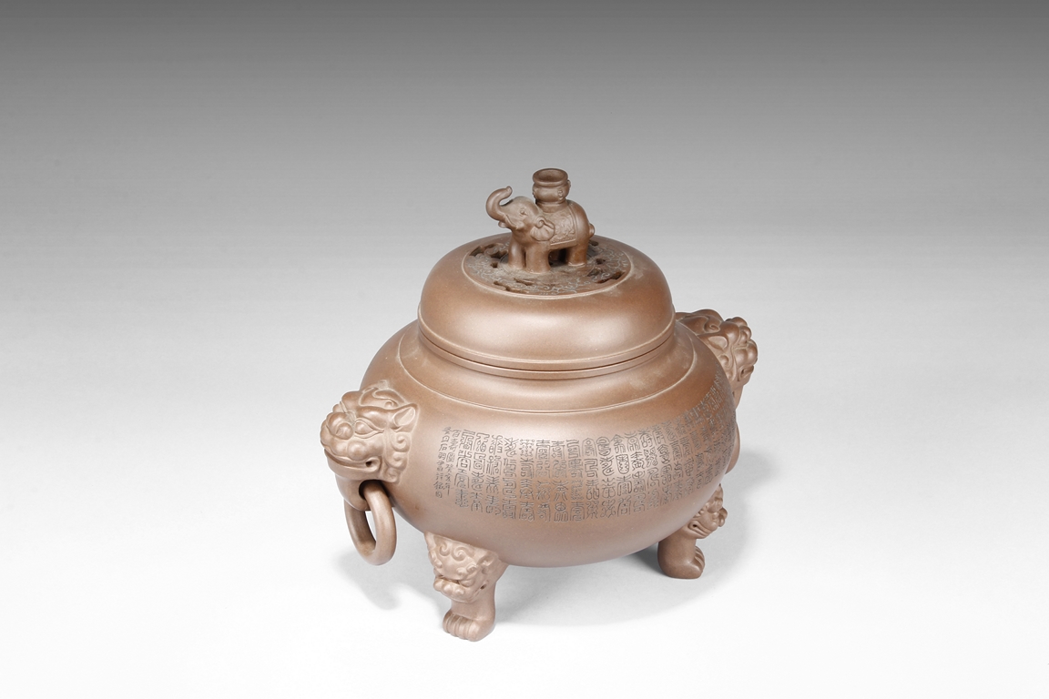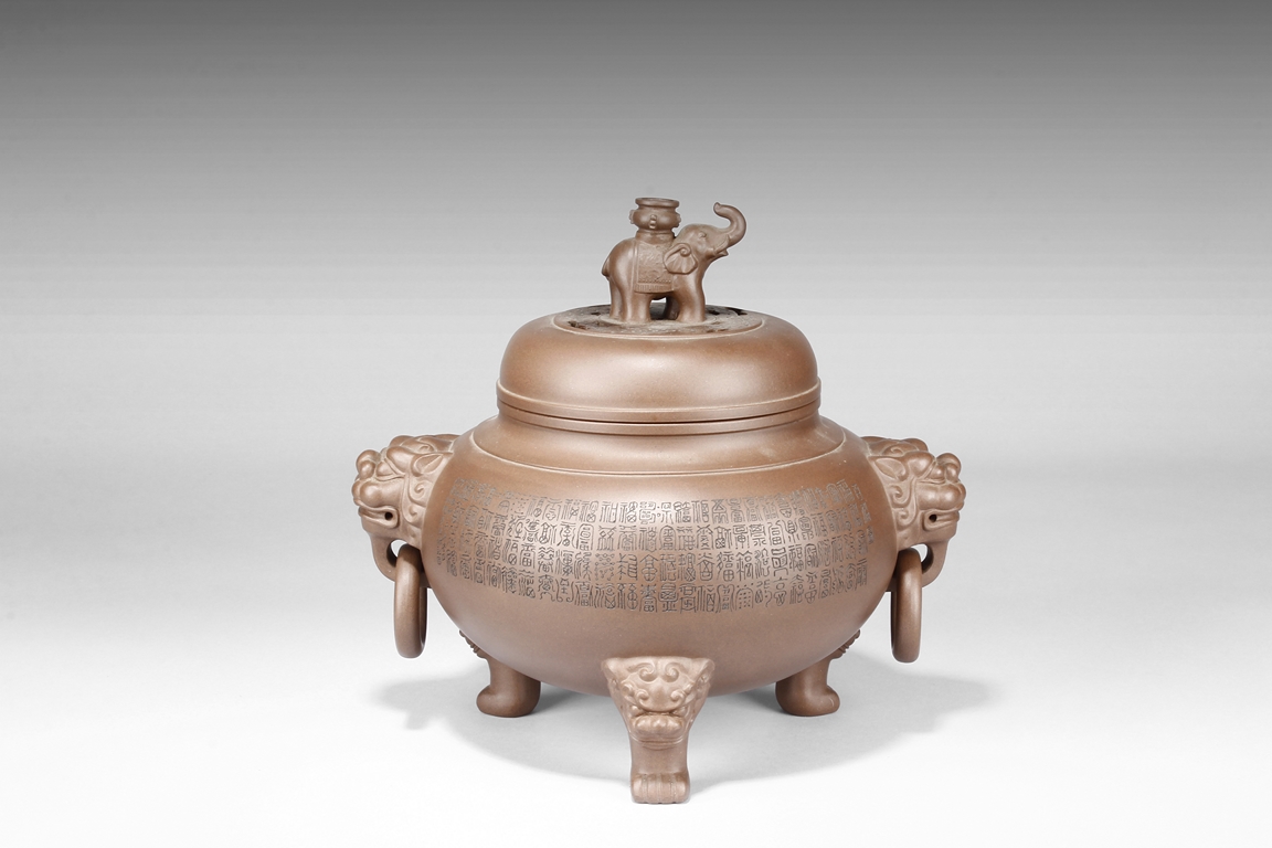 此仿玉香爐之鼎為圓腹,雙獅耳,帶環,一面有石羽刻之百壽圖,另一面有漢生銘刻之百福圖。三獅足,蓋上飾有一小象,惟妙惟肖,手法生動細膩,鼎底有一方"蘧華製陶"浮印。沈蘧華,1939年生於蜀山常安村,1955年隨大師顧景舟學藝,勤奮好學,工作認真負責,1983年被全國婦聯會命名為全國三八紅旗手。所製作的五頭竹簡茶具榮獲1984年德國萊比錫國際博覽會金獎。其代表作品有:竹簡茶具,窈窕壺,小玉柱壺,欽和壺,及百福百壽獅象鼎等。