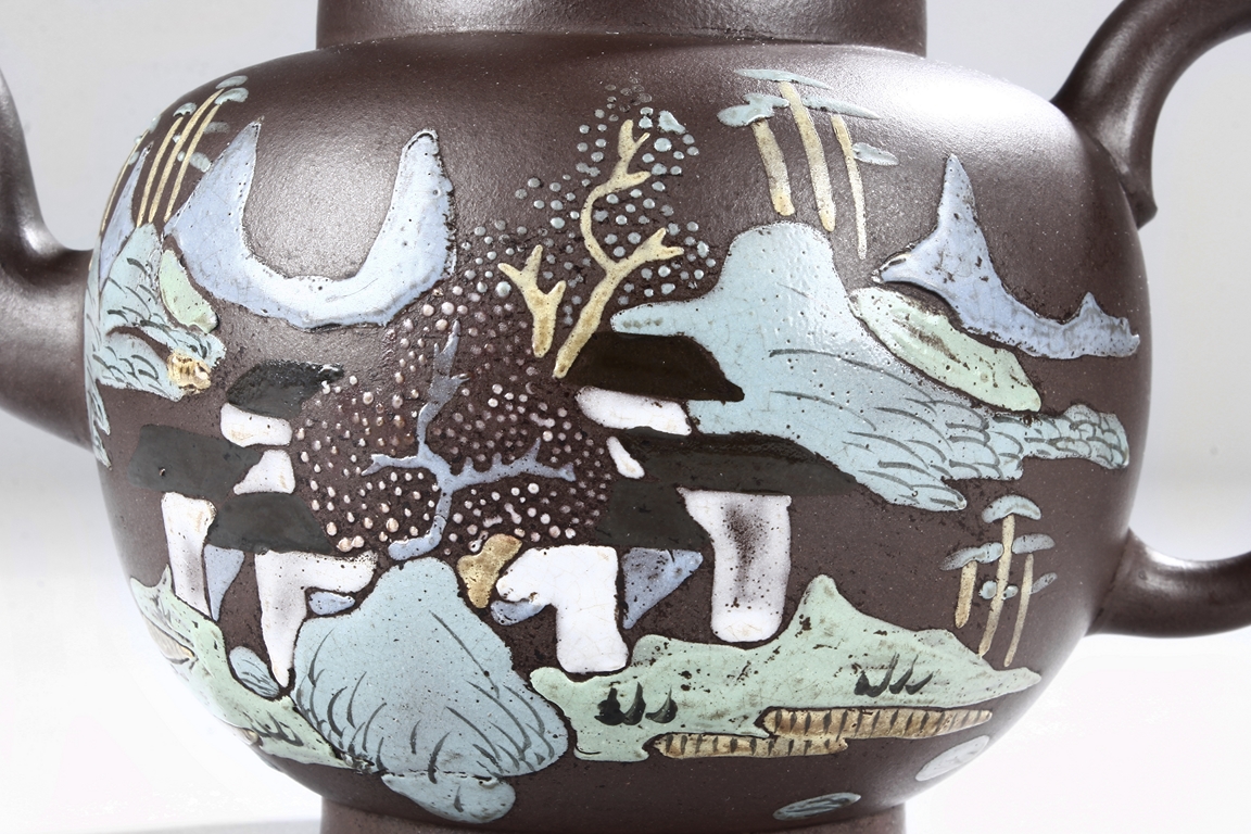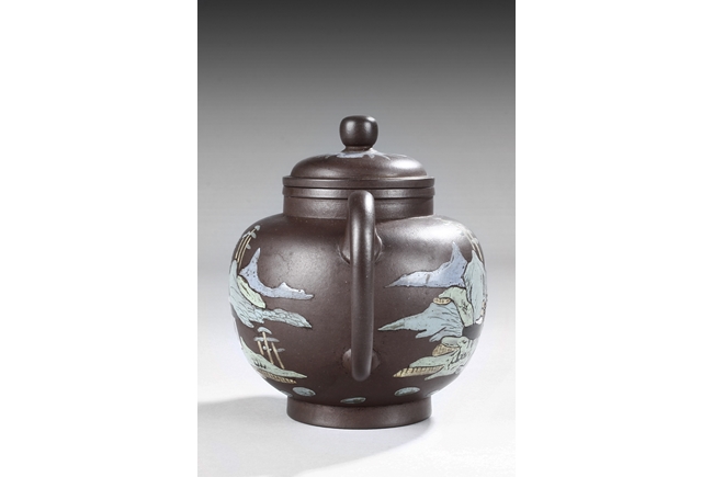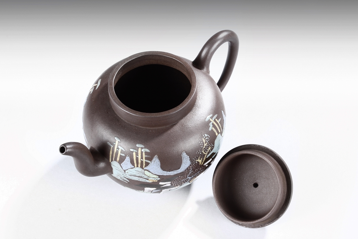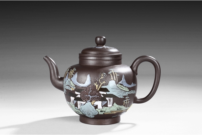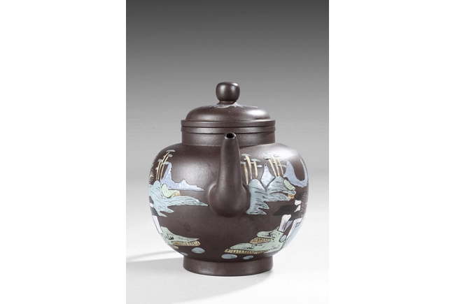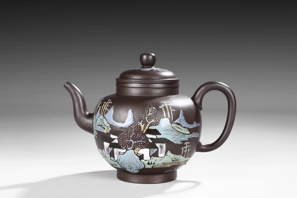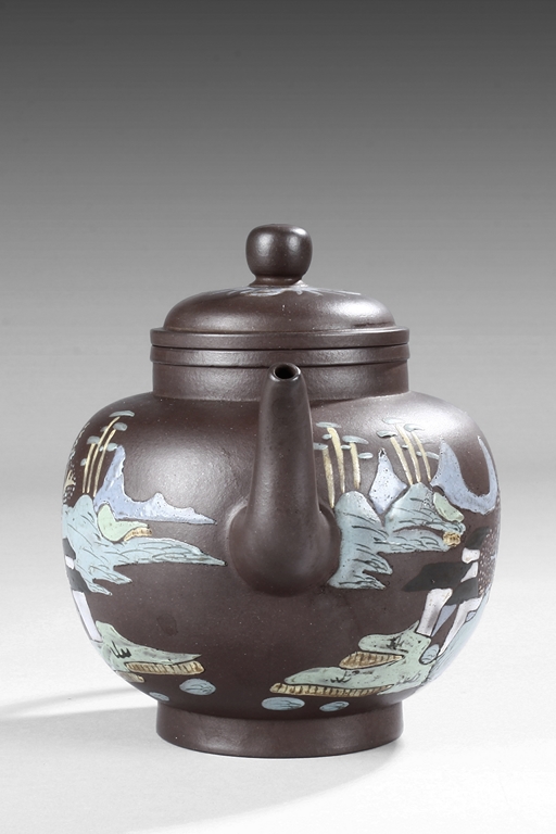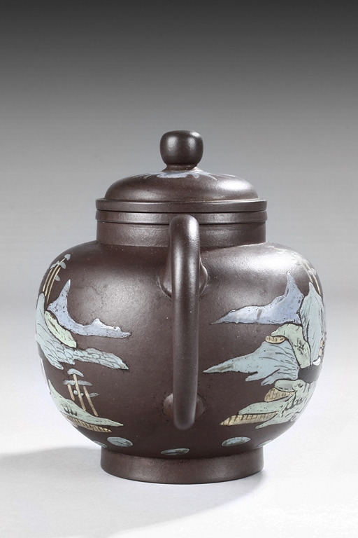 Of tall lantern design, the globular body supported by slightly splayed round foot ring, the sides painted with village, river, flowers, and mountain landscape on top of purple color body, the thick spout tapers to small but elegant opening, the ear-shaped handle curved upwards, and rounded square bead finial situated on top of painted flowers. Bottom bears four character "Wang Nanlin" mark. Mid Qing Dynasty period. Wang Nanlin was a famous teapot maker during Qing Qianlong Dynasty period, and he was self-proclaimed to be the descendant of "Master of Tea" Lu Yu from the Tang Dynasty period. His teapots were purposely made to resemble older styles, similar in design to ancient bronze wares from Shang, Zhou, Qin, and Han Dynasty periods. He preferred to use Tuan clay for making teapots, and he made teapots for the Imperial Court.