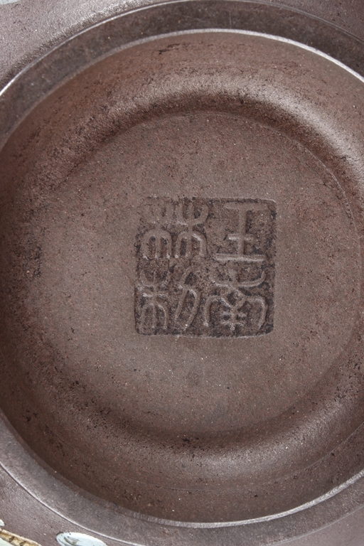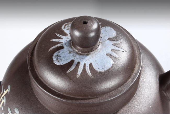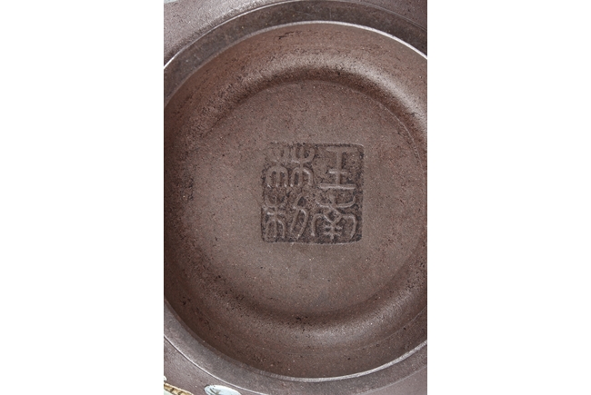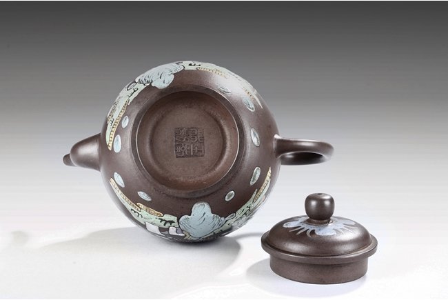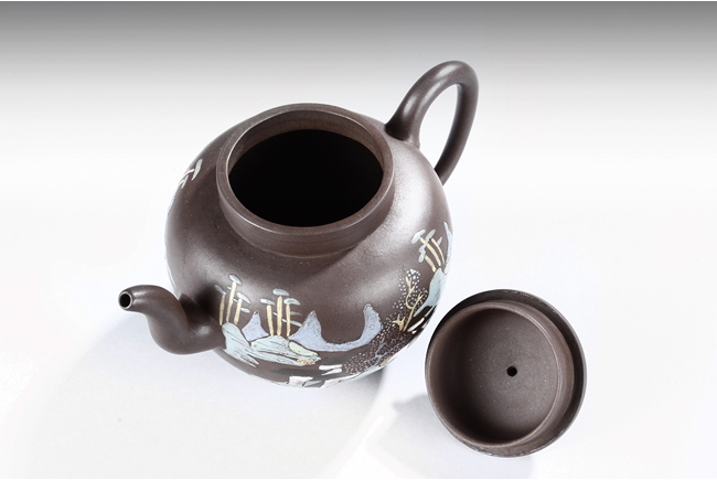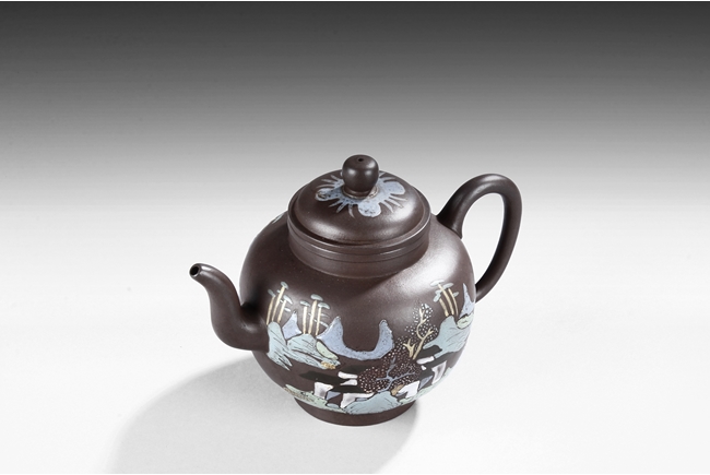 此壺高燈狀,圓鼓腹,三彎流,大耳型執把,壺身兩邊與壺蓋均彩繪山水花朵,壺底有王南林製方陽印。王南林,清乾隆年間著名製壺名家,有"素身圓清壺"傳世,號南林,家羽後身,即自詡為唐代茶聖陸羽的後裔。著名紫砂大師,造型刻意仿古,以商周秦漢青銅器為藍本,鐫刻古雅精美,喜用團泥製作,曾為宮廷製壺,頗負盛名。