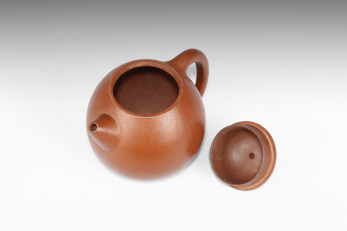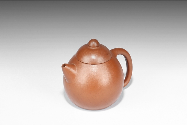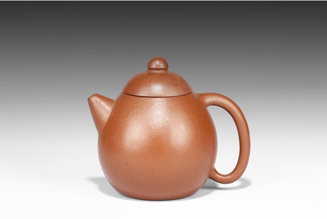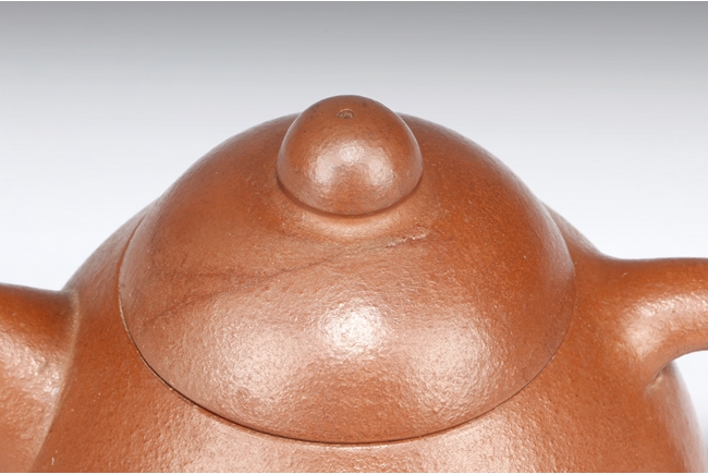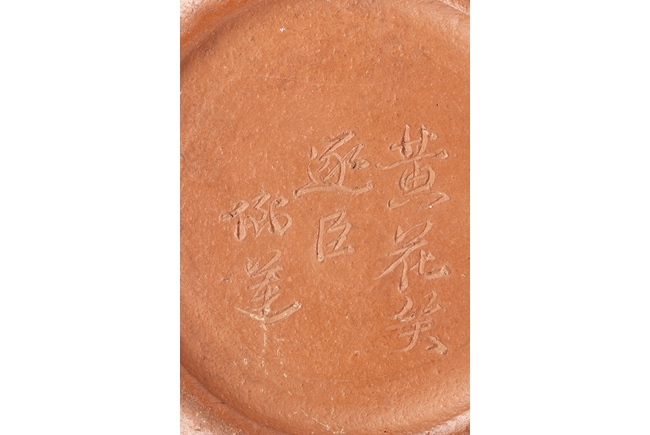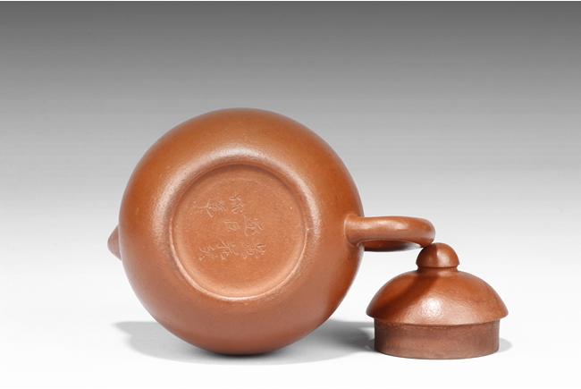 清初朱泥龍旦壺,此壺錐狀流,耳狀柄,壺蓋鈕似菇,整體觀之圓渾質樸,敦實素雅,朱泥調砂色澤圓潤,壺身則隱約可見拍打製作的痕跡。底部刻有黃花笑逐臣,署名難以辨認。此壺應為清初之作品。