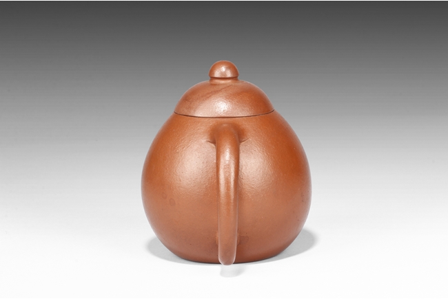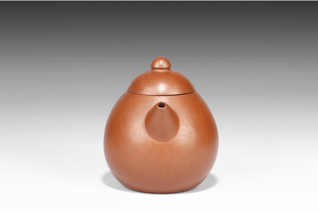 Of pear form, the teapot has a very short tapering conical spout raising upwards, reverse-ear shaped handle, and mushroom-shaped finial, the clay of orange-red color, bottom bears colophon and artist signature. Early Qing Dynasty period.