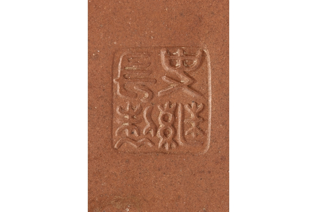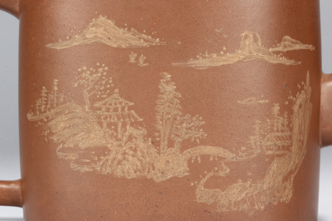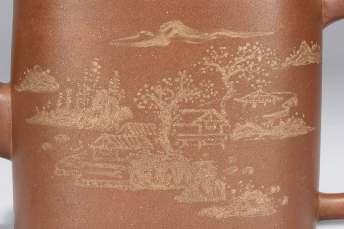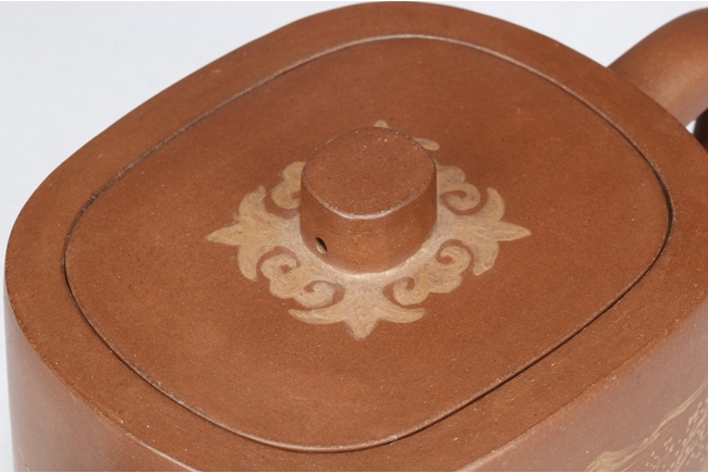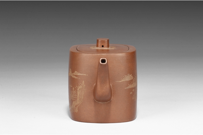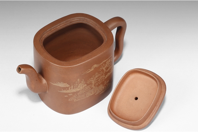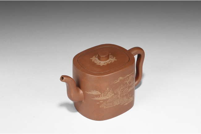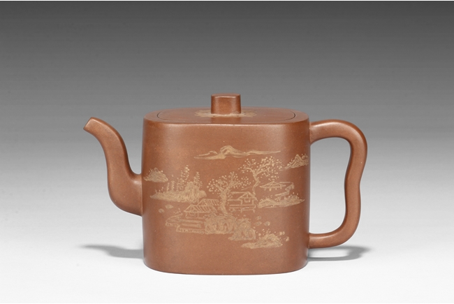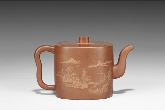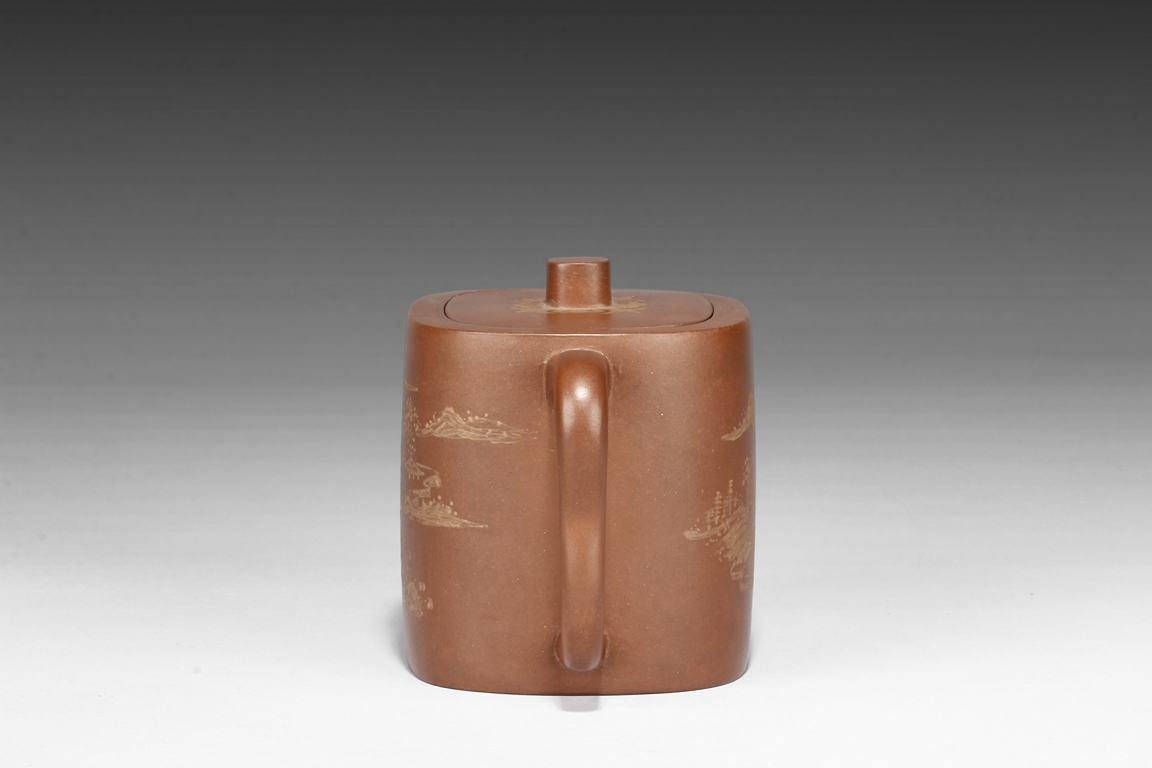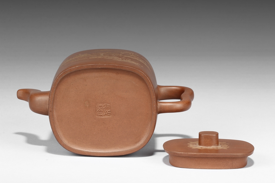 Of rounded rectangular form, the teapot’s body depict village, mountains, river, and trees on both sides against reddish-orange clay, the handle of ear shape with lobe, and the finial also of rounded rectangular form, on top of stylized ruyi patterns. Bottom bears four character "Shi Jichang" mark. Shi Jichang, born during Qing Kangxi Dynasty period, was often praised for his masterful pottery making skill, combined exceptionally well with calligraphy incision and painting.
