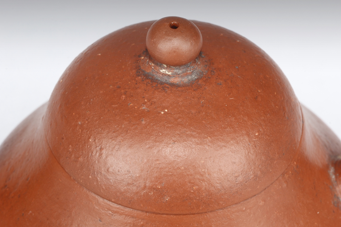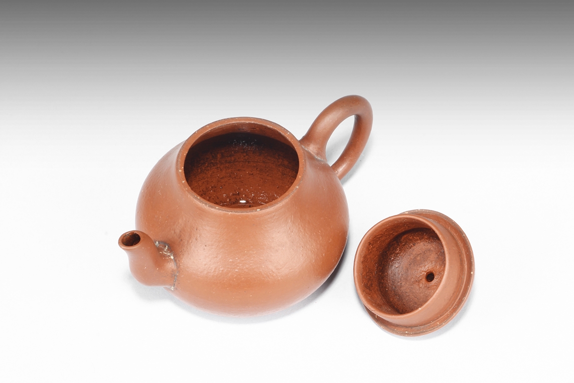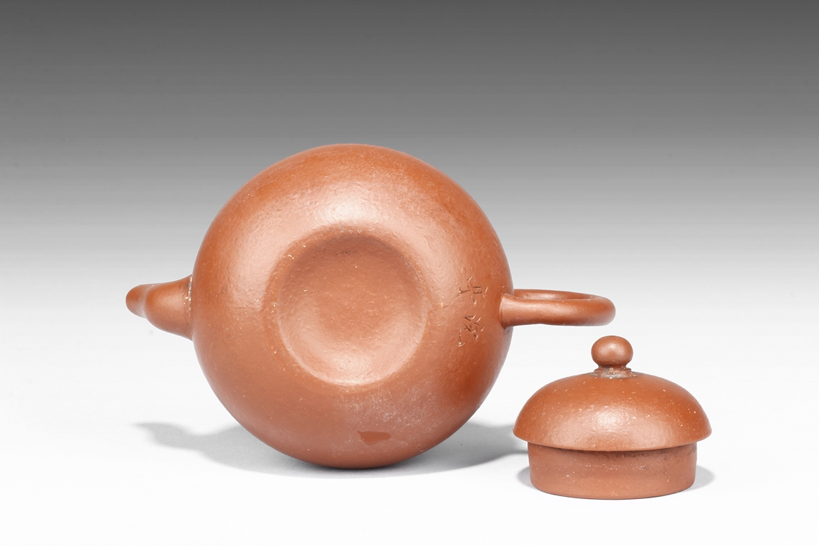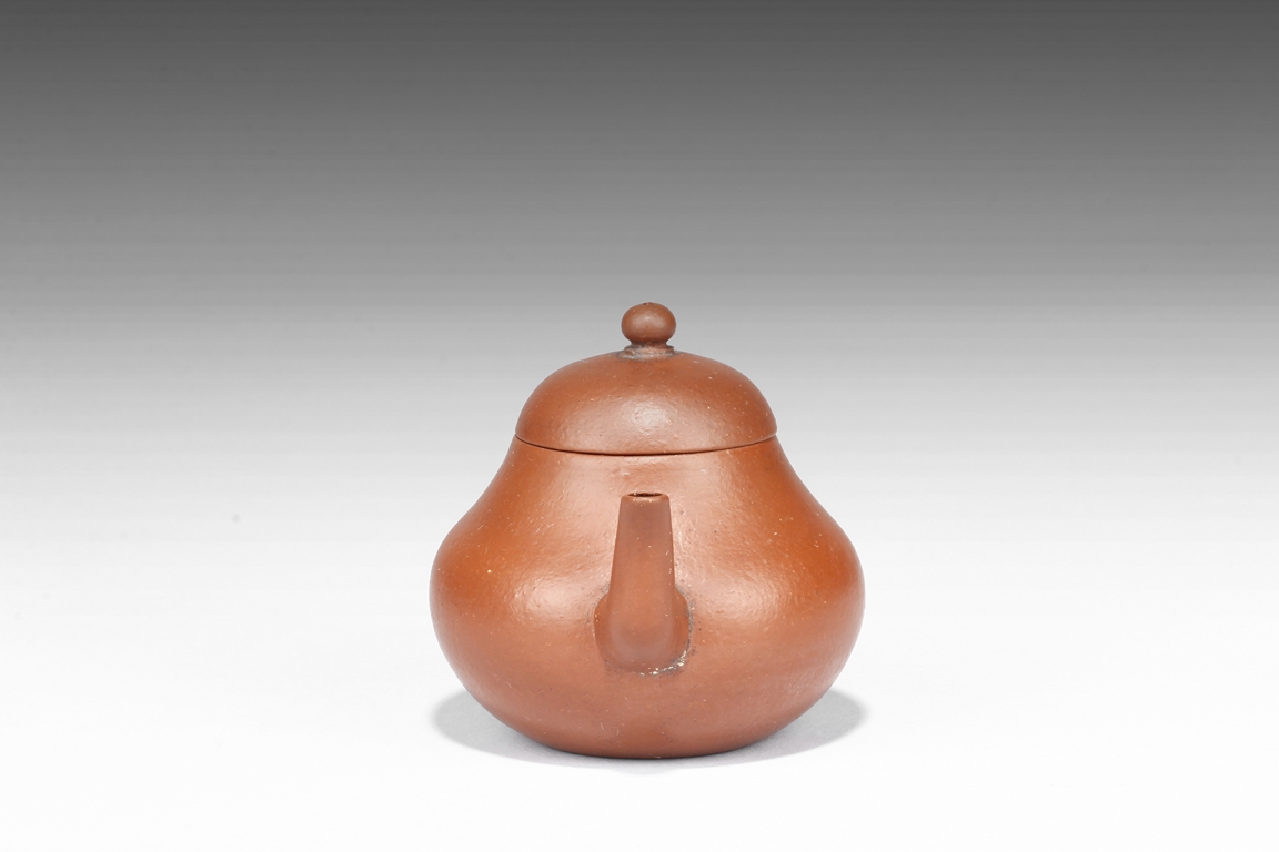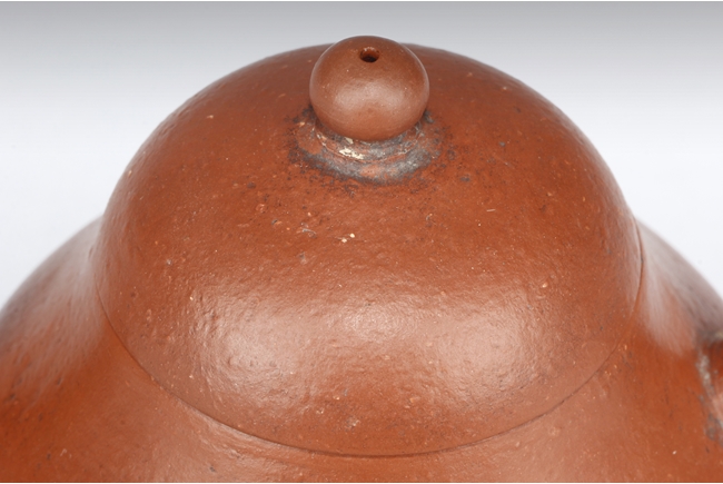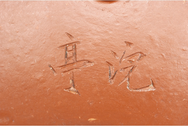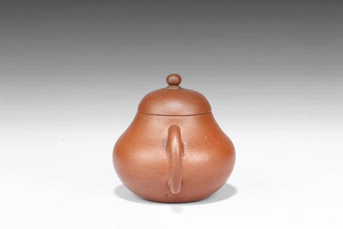 此壺朱泥調砂,色澤圓潤,三彎流,流口向上,壺蓋上塑一粒圓珠,耳朵把手,把手下署浣亭款。此壺泥料堅實油潤,調砂如繁星點點,線條佈局合理流暢,顯非一般工匠能及之。浣亭款作者已無從考究,殊為遺憾。