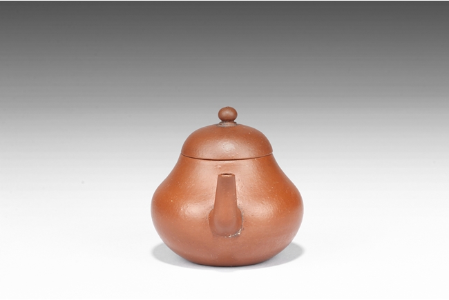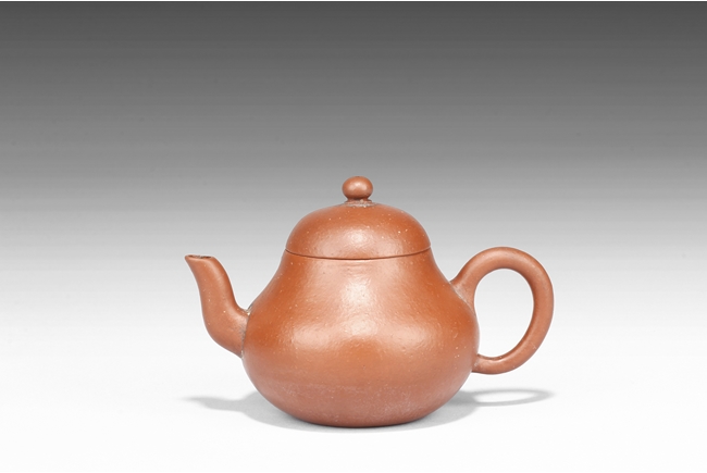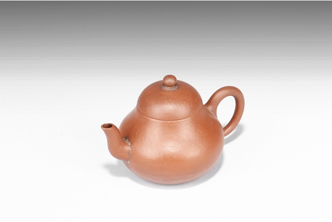 Of pear form, the teapot with orange-red color with visible elegant sand grains on the exterior, the spout raises upwards, the finial in form of round bead, and handle in well-proportioned ear shape. Two character mark "Huan Ting" below the handle.