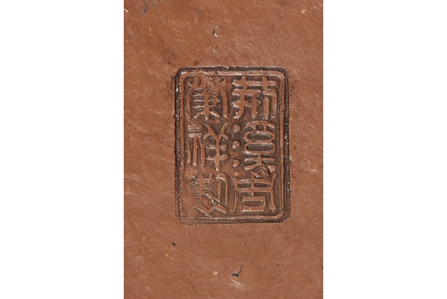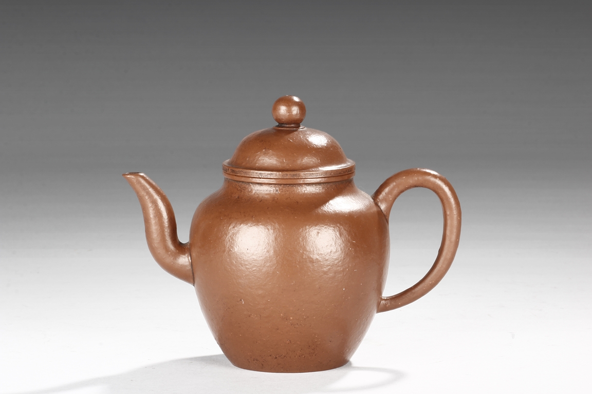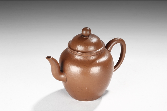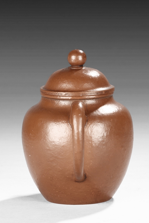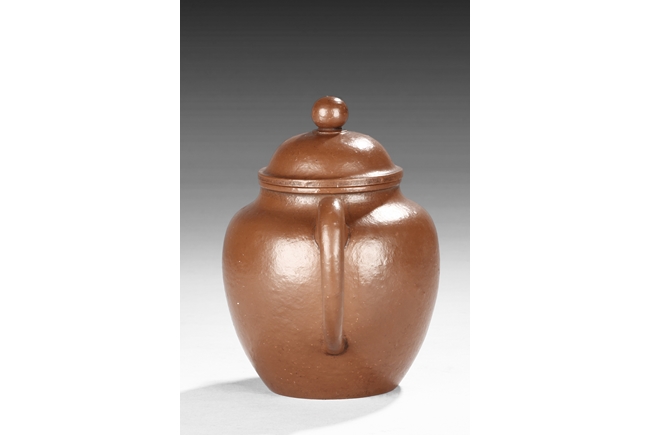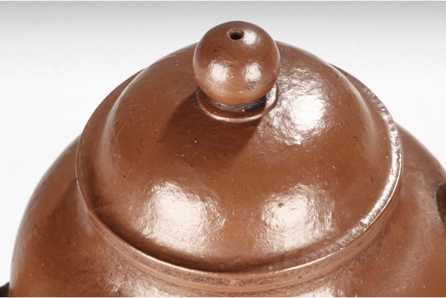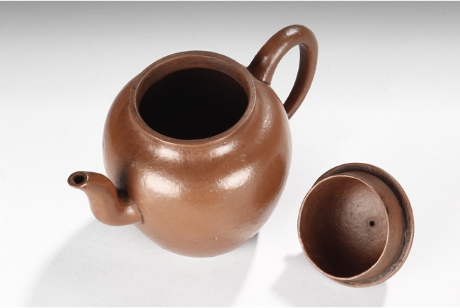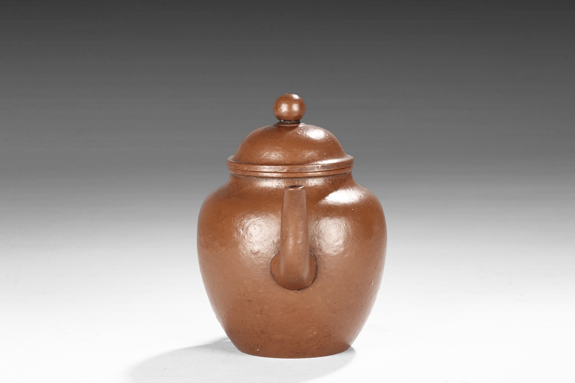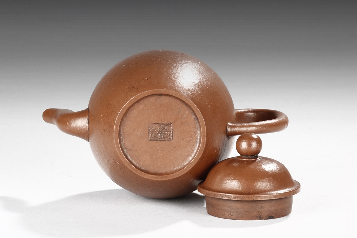 Of tall globular form, the teapot’s exterior in reddish-brown color, the spout curves and tapers slightly, the lid similar to straw hat with bead finial, the body’s surface slightly bumpy in the design of orange peel. Bottom with six character "Zhou Bingrong" mark.