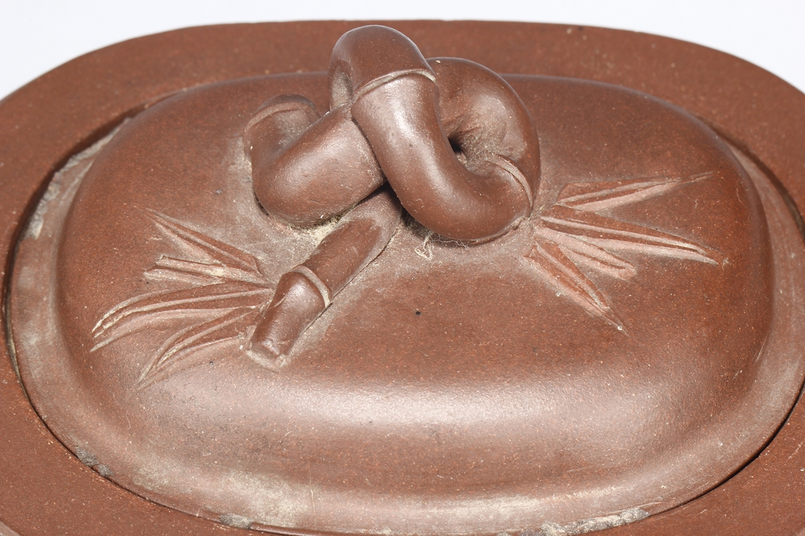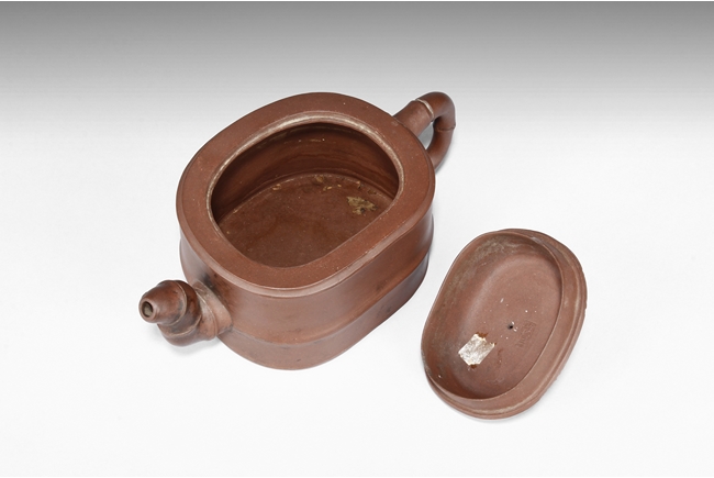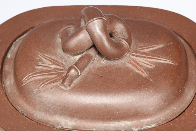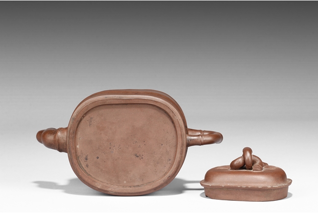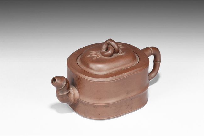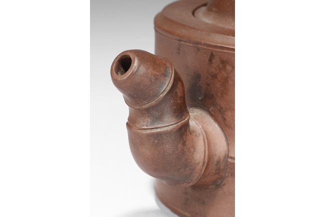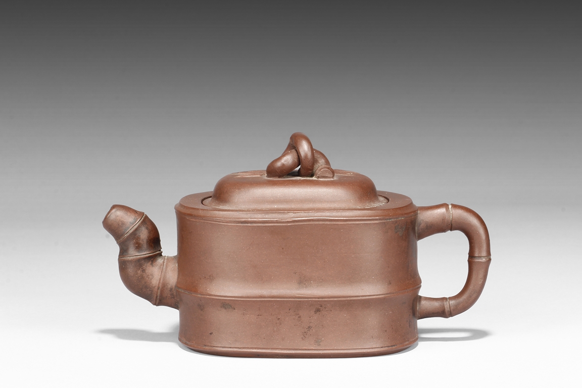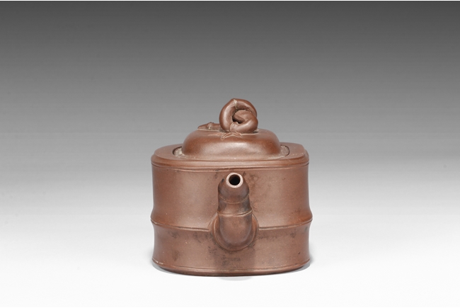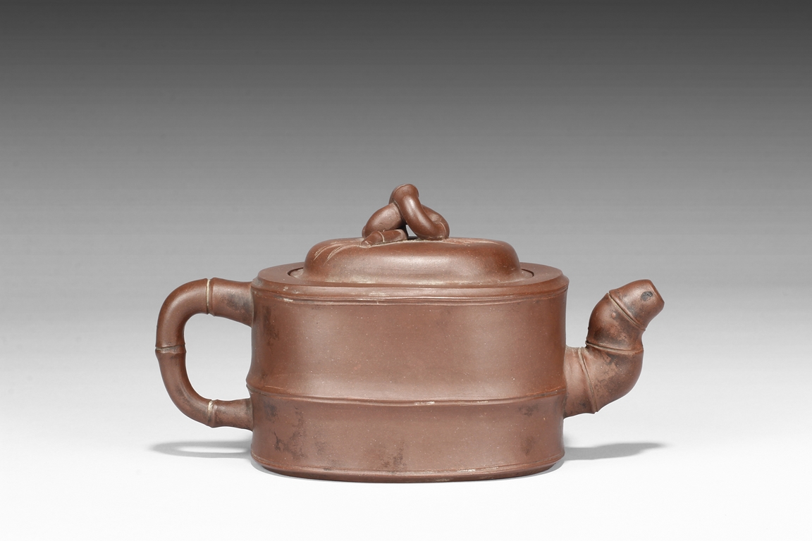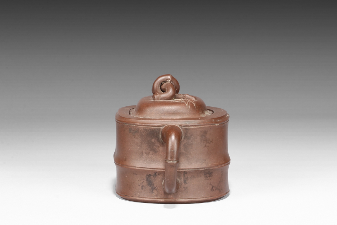 Of compressed cylindrical form depicting bamboo sections, the teapot’s thick spout, handle, and twisted finial also in smaller bamboo section shapes, the lid decorated with a few bamboo leaves. Two character mark "Mao Dan" beneath the lid. Mao Dan, a member of the Shao family, probably made this teapot during late Qing Dynasty period.