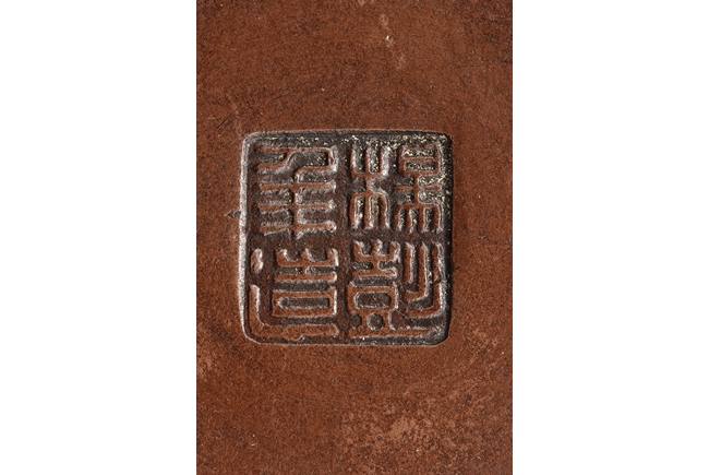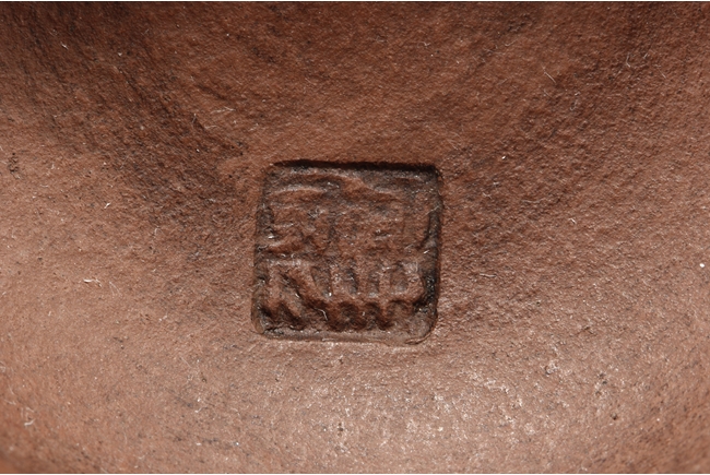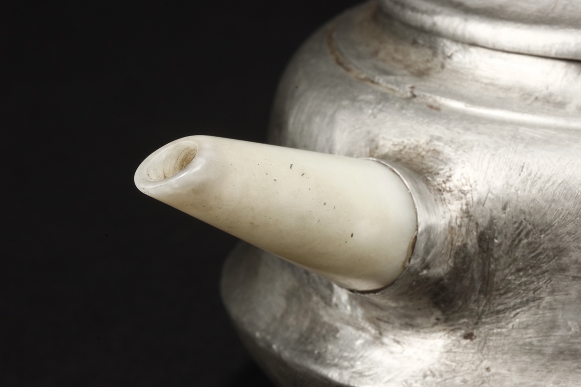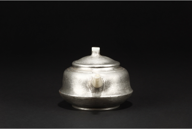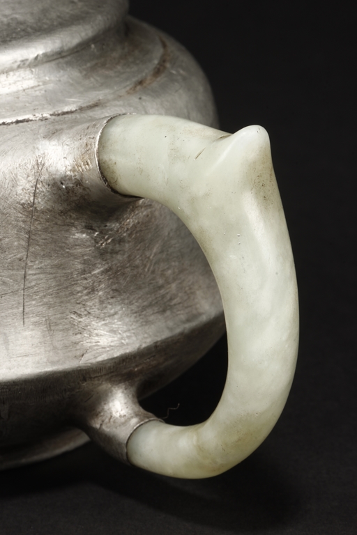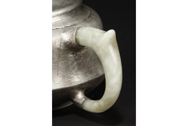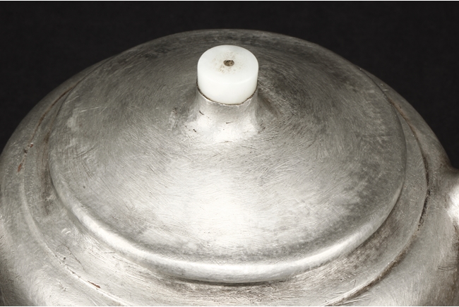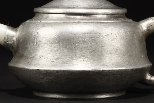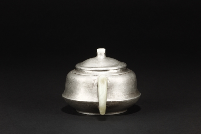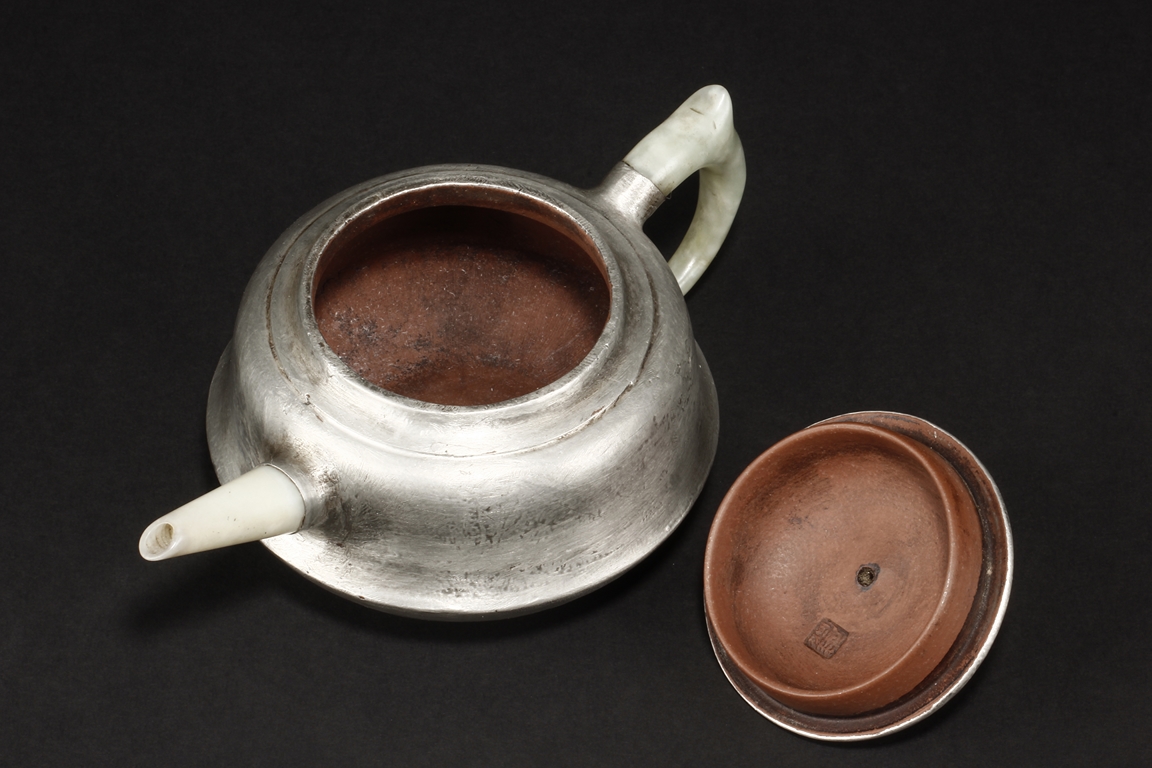 Of bell form with curved bottom beneath the waist, the teapot’s body covered with a layer of pewter, the handle, spout, and finial made from jade, with straight, round, and elegant design. The bottom with four character "Yang Pengnian" mark, and beneath the lid with two character "Pengnian" mark.