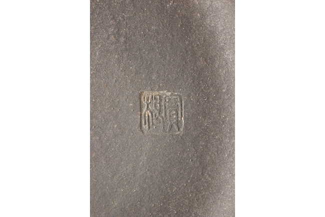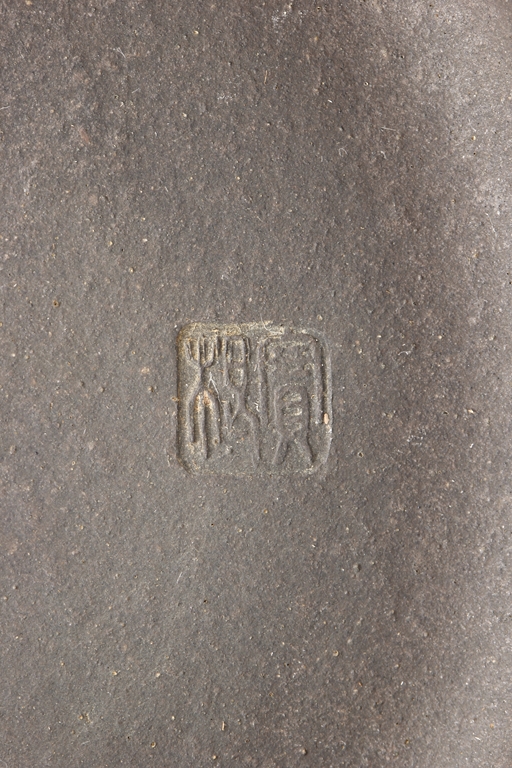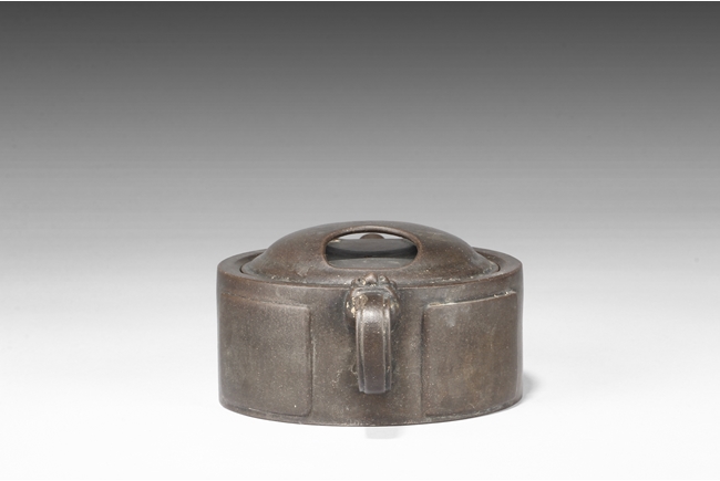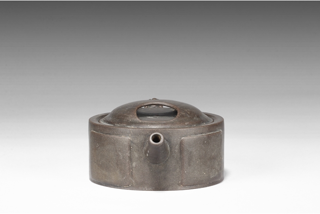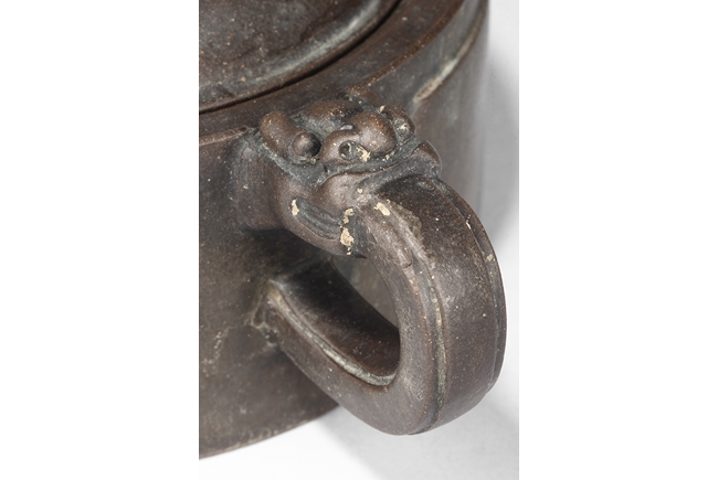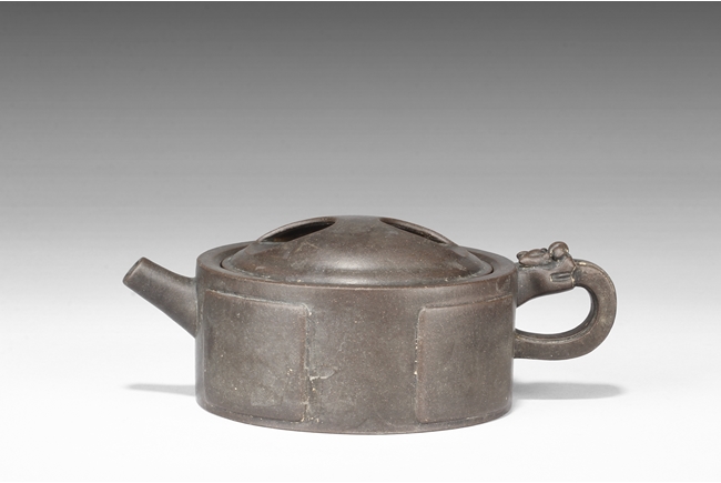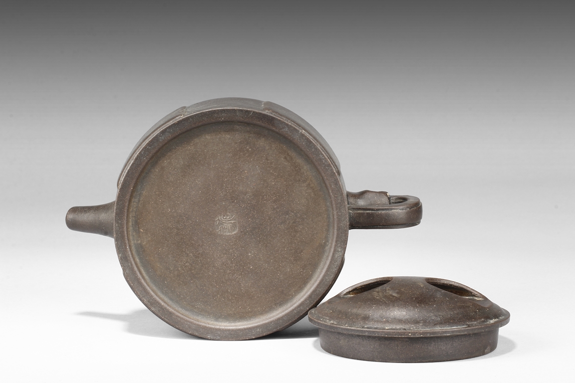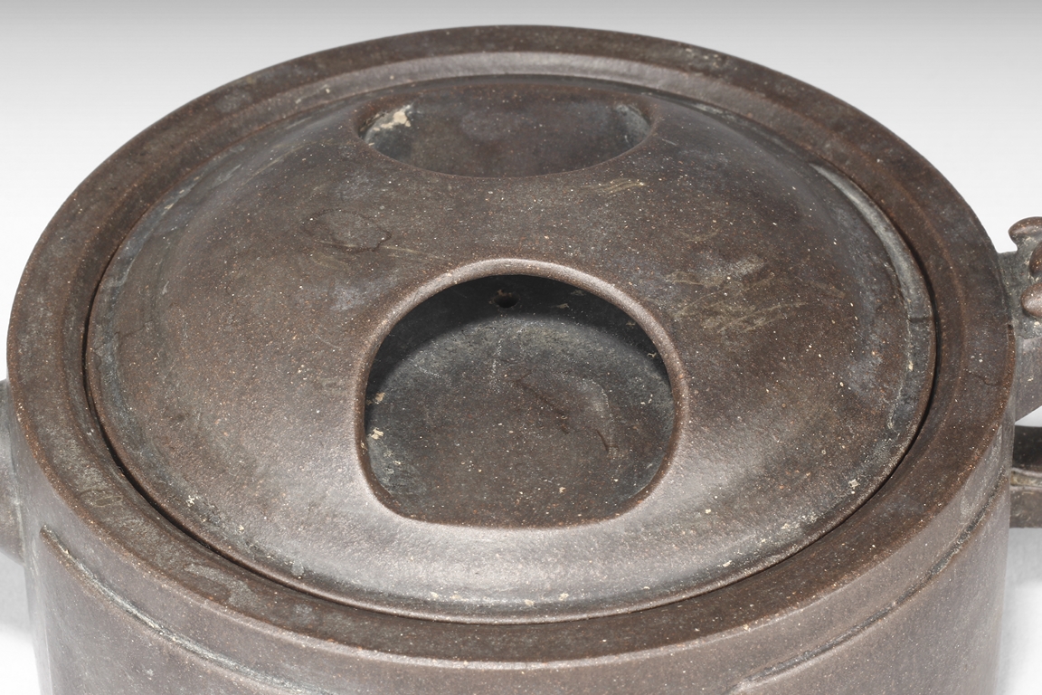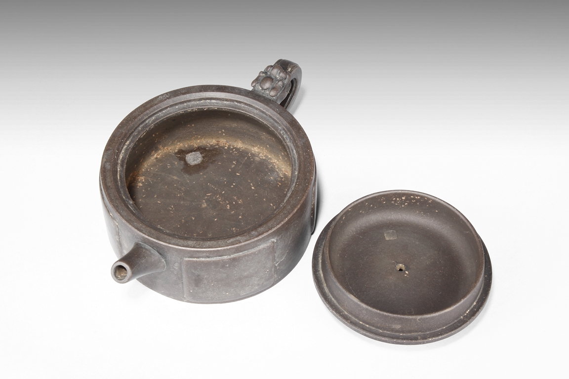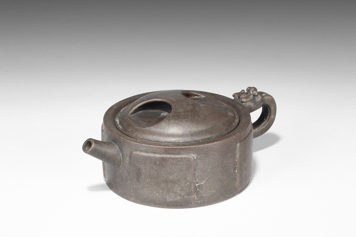 Of compressed cylindrical form, a mythical beast mask extending from the body to form the handle, the spout of round and straight form, the lid and finial in the theme of water buffalo nose, the body with four square panels extrude slightly on the side. One character "Wang" mark beneath the lid, and two character "Xu Zhai" mark on the bottom.