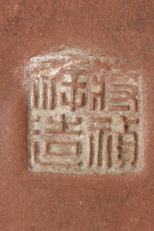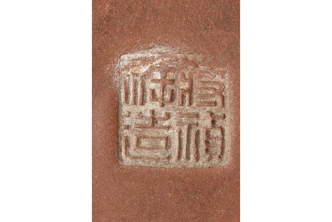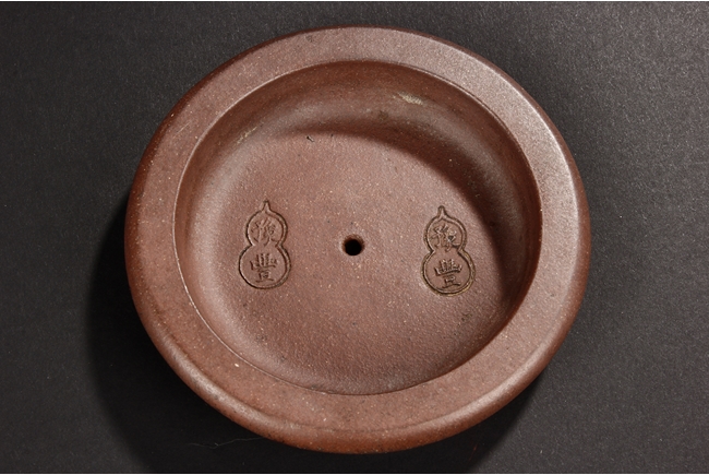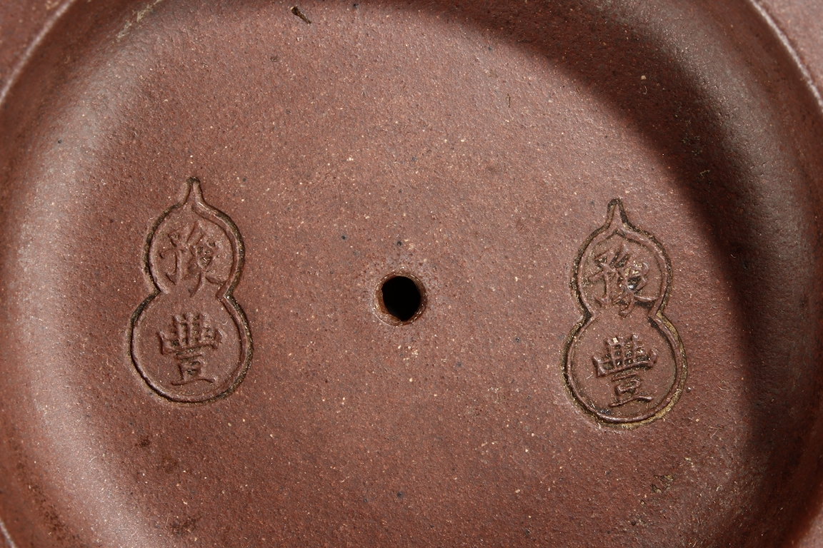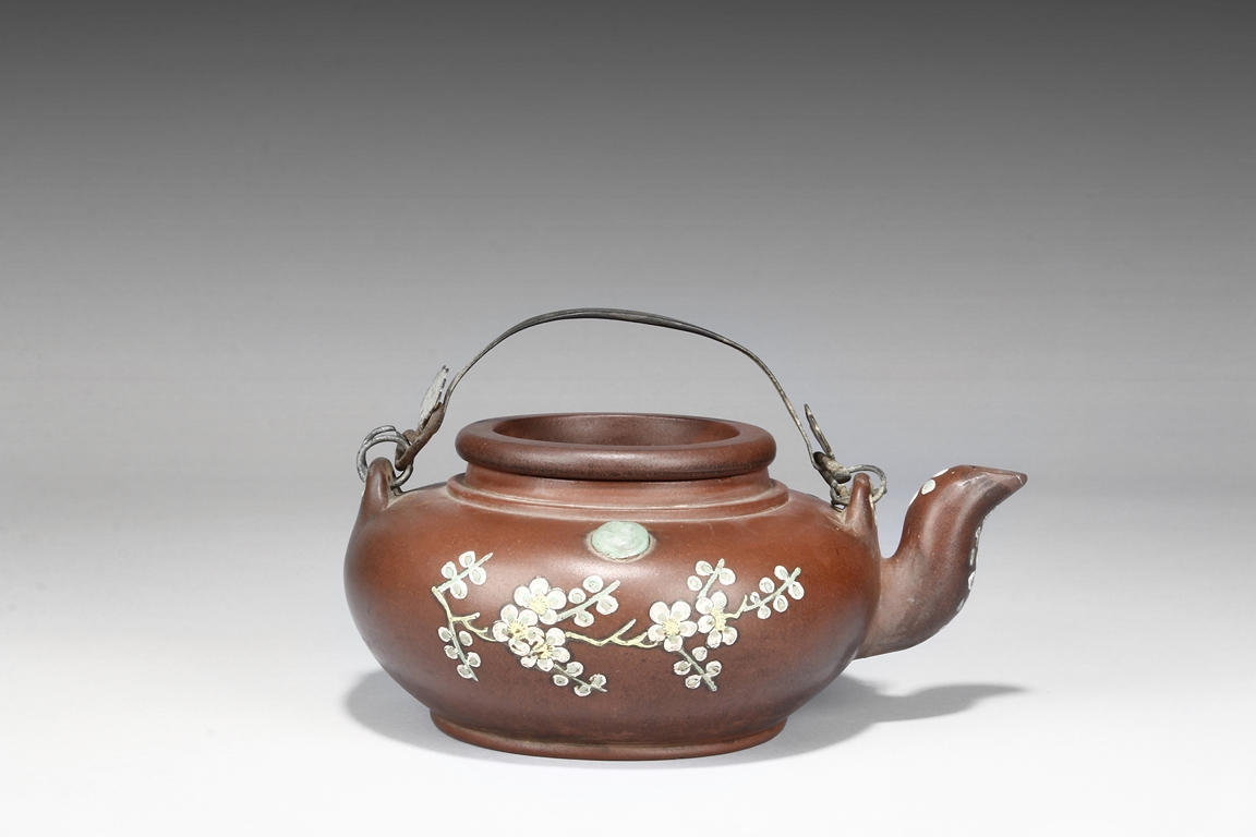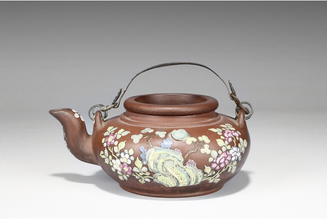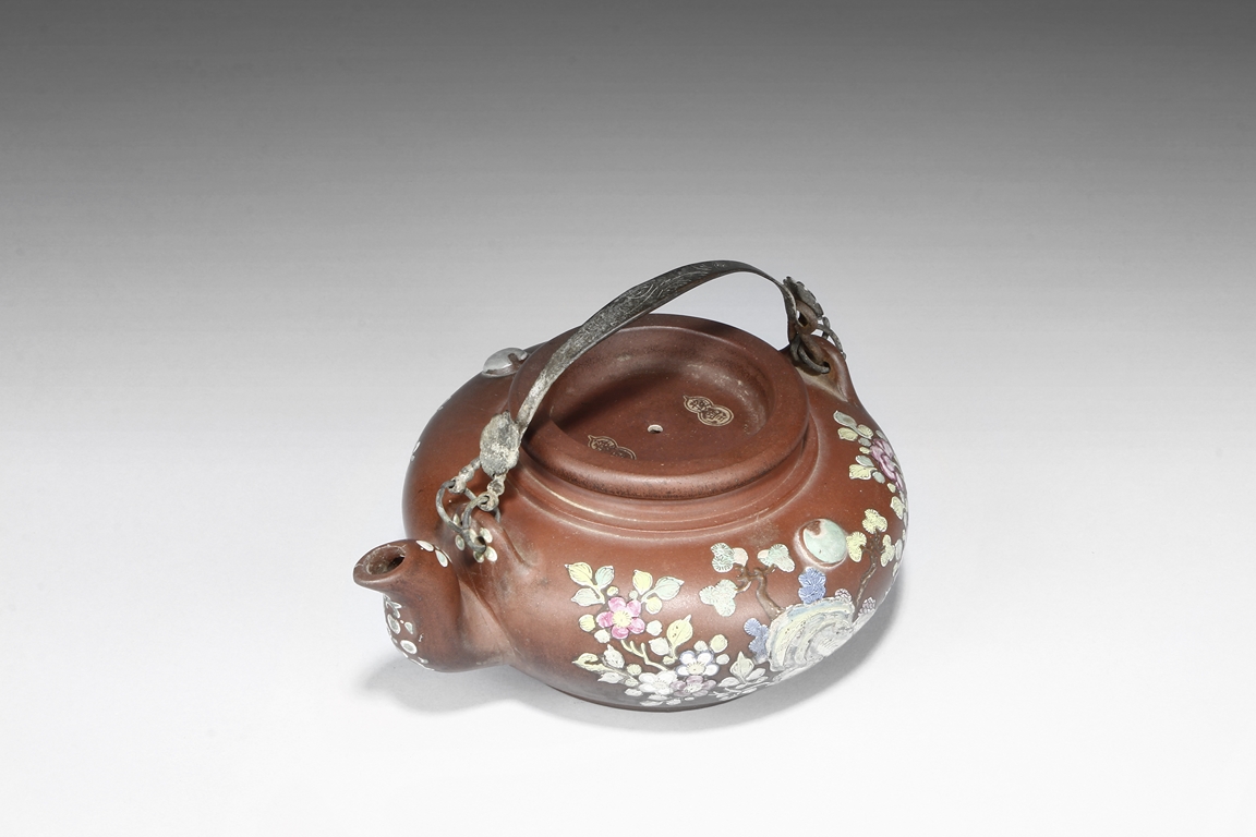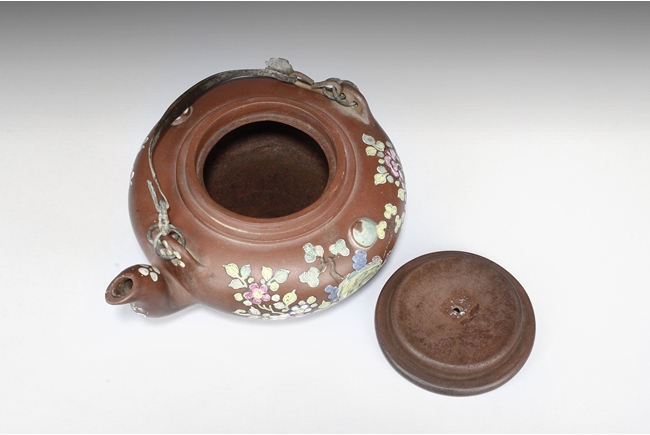 Of compressed globular form, the teapot’s exterior decorated with colorful plum trees, flowers, and viewing rocks, the arched double metal handle extends over the top of teapot, the thick spout raises upwards, the lid has a bowl-like caved-in design without finials, bottom bears four character mark, two character "Yu Feng" mark within gourd on the lid. The brand "Yu Feng" was created by father and son, Wu Tongjun and Wu Qinan. It was as famous as the teapot brand "Fu Kang Ji", established by famous pottery maker Xu Hantang’s grandfather Xu Jinseng and father Xu Zuchun. This particular style was very popular among the civilians.