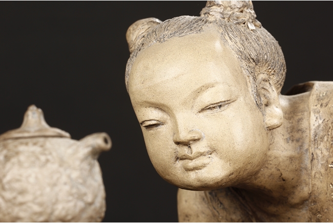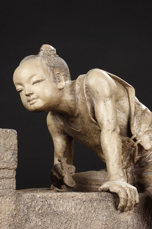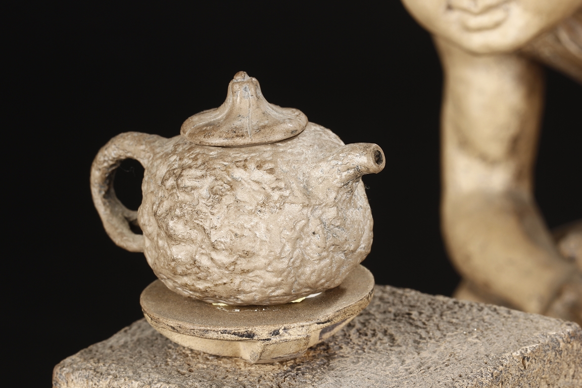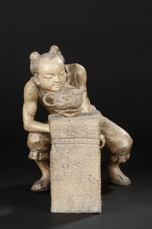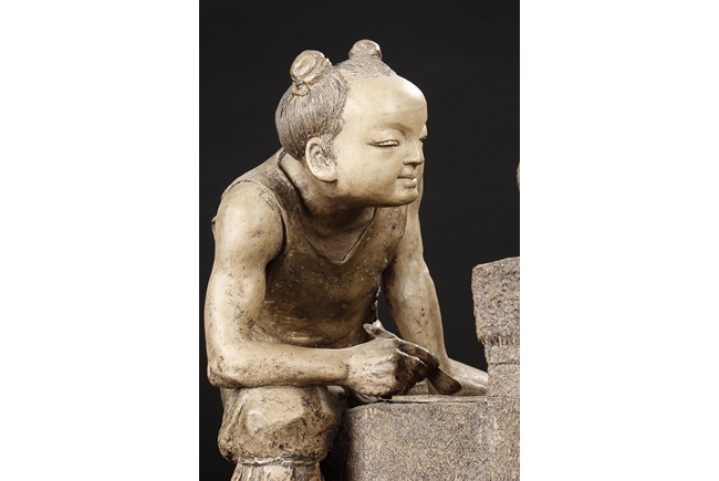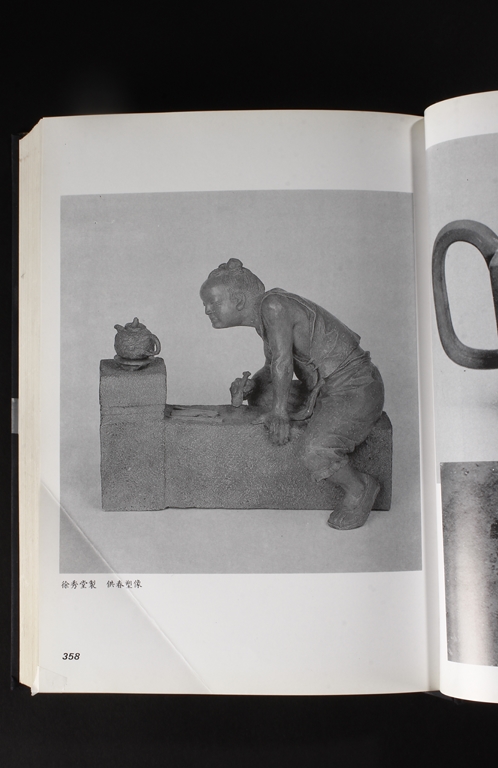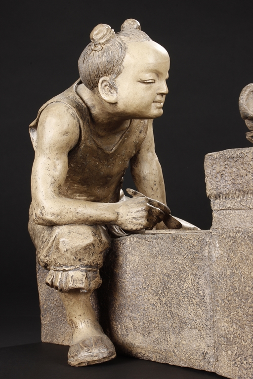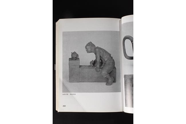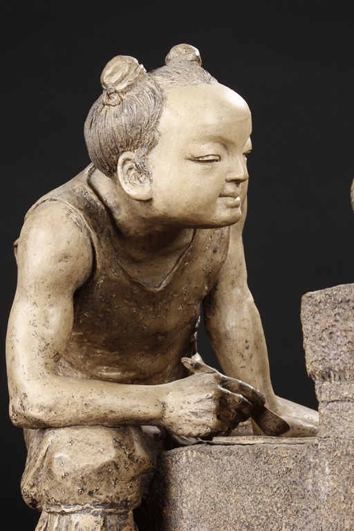 The detailed statue depicts a young child, dressed in working clothes, seated on a long rectangular brick, studying Gongchun teapot placed on top of a stand, with right hand holding a scooper, and left hand supporting his leaning body. The back end of brick with artist signature and mark "Xu Xiutang". The statue was seen on page 358 of the book "Yi Tao Zhi Lu", published by Li You Ren Tao Yi Company, publish date Republic of China calendar year 84, June 1st.