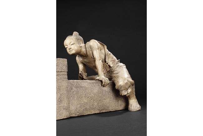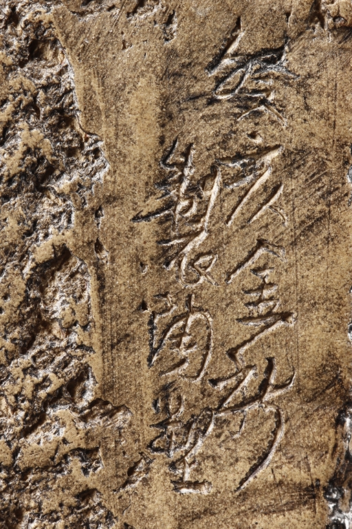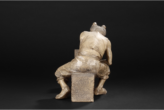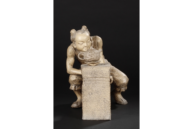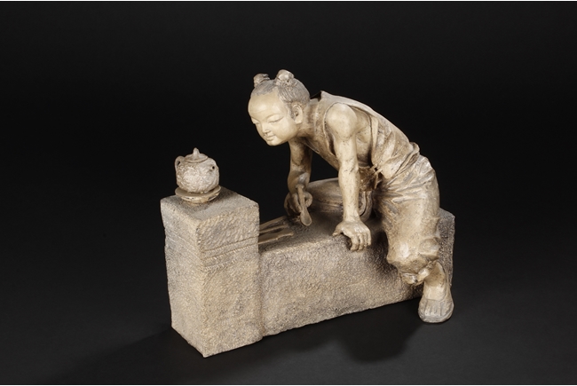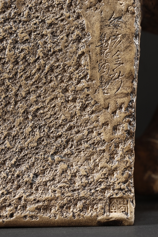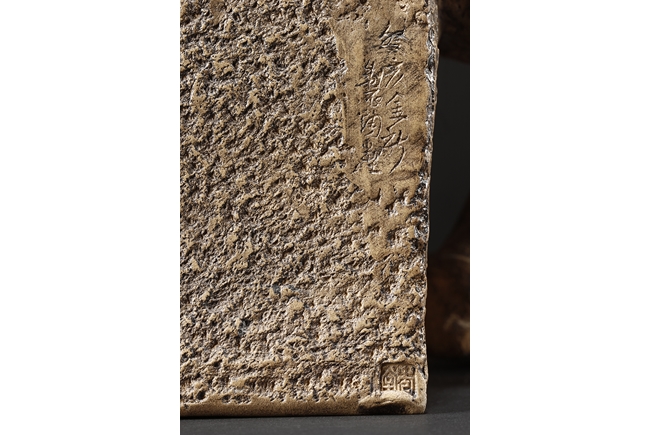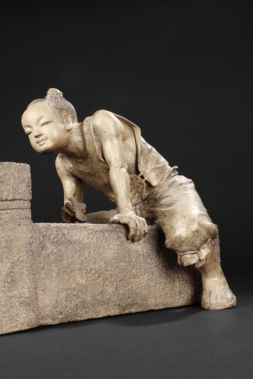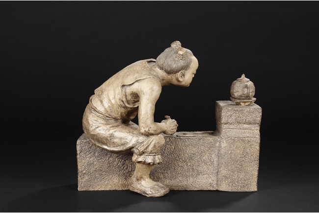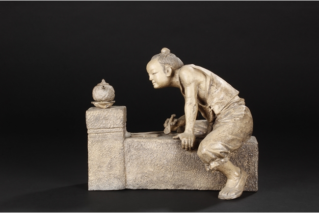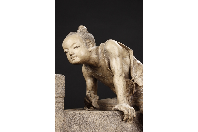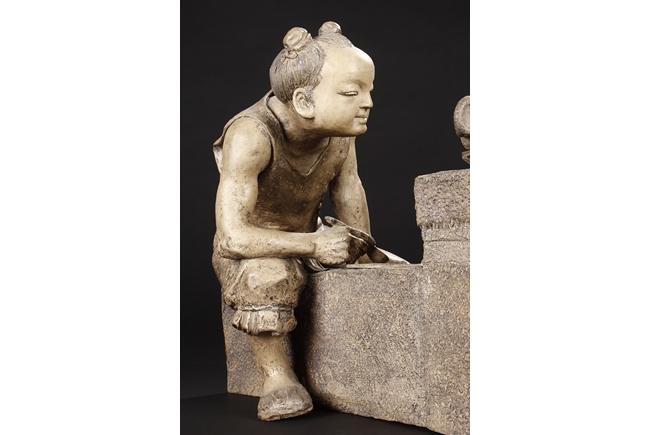 The detailed statue depicts a young child, dressed in working clothes, seated on a long rectangular brick, studying Gongchun teapot placed on top of a stand, with right hand holding a scooper, and left hand supporting his leaning body. The back end of brick with artist signature and mark "Xu Xiutang". The statue was seen on page 358 of the book "Yi Tao Zhi Lu", published by Li You Ren Tao Yi Company, publish date Republic of China calendar year 84, June 1st.