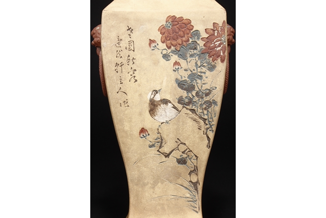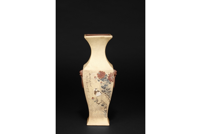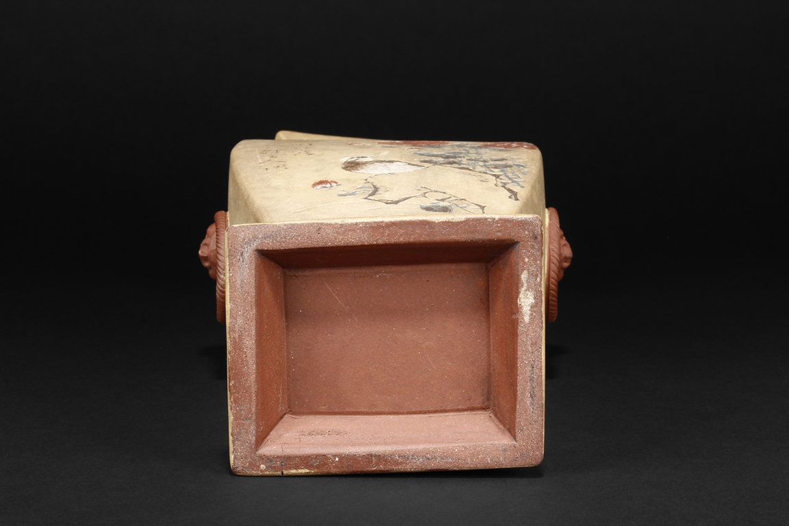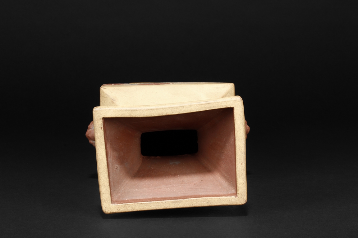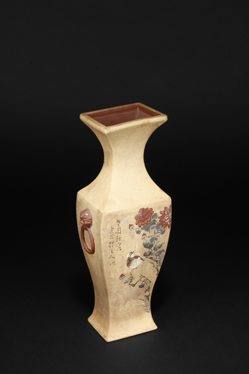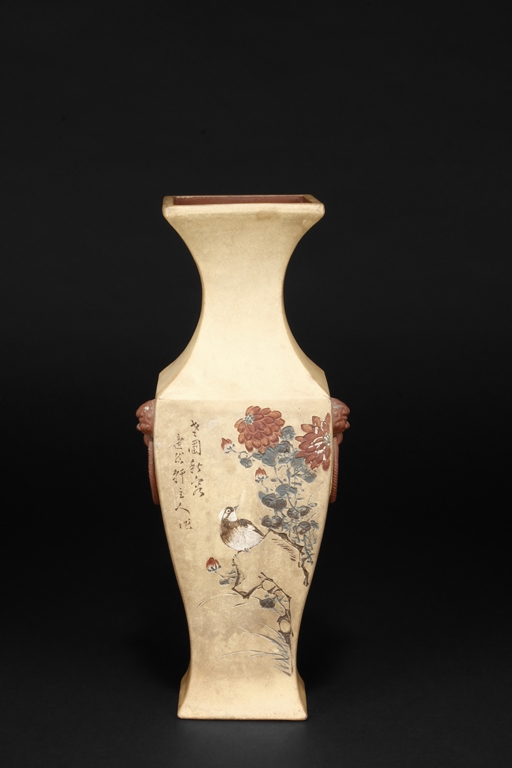 Of curved rectangular design, the vase curves elegantly at the neck and waist, with rectangular rim, body, and foot, the body painted in colors with flowers, birds, and calligraphy, with a pair of beast mask loop ring handles on the side, the exterior in yellowish-brown color, and interior in reddish-orange color. Republic period.