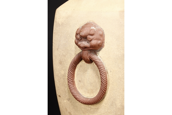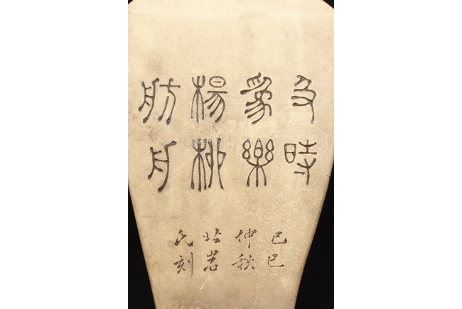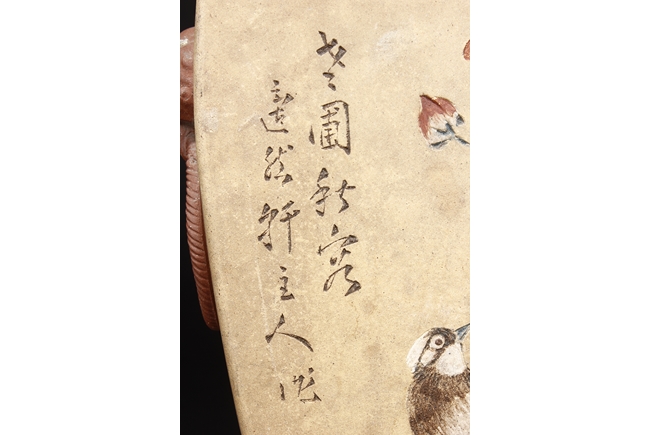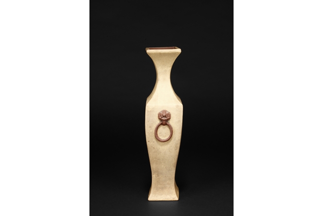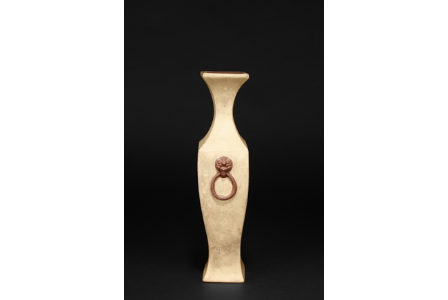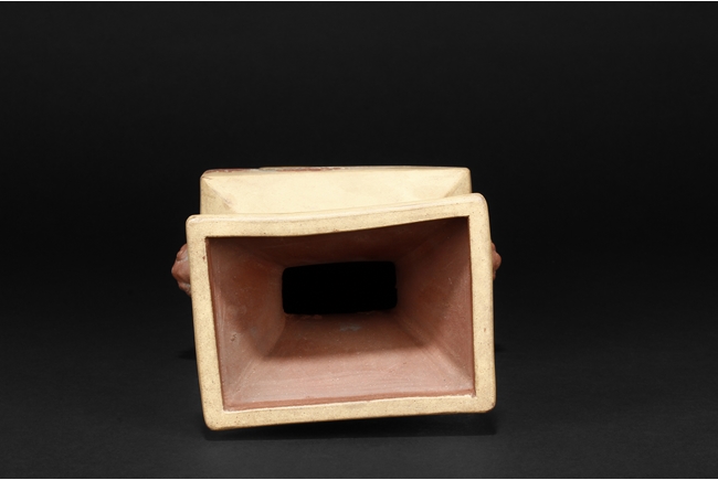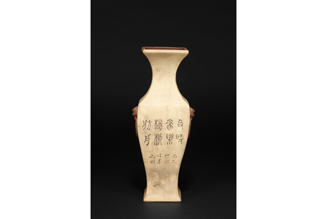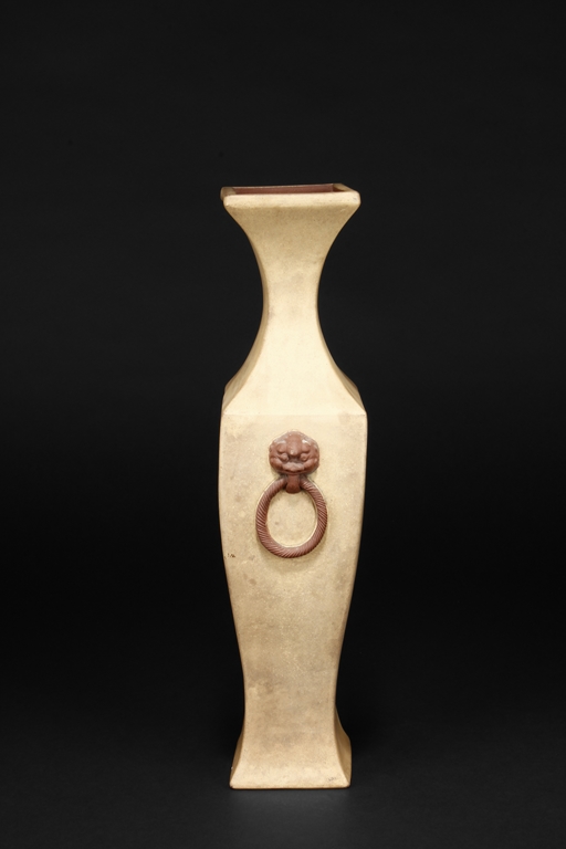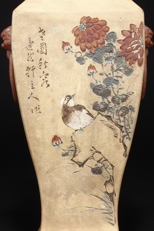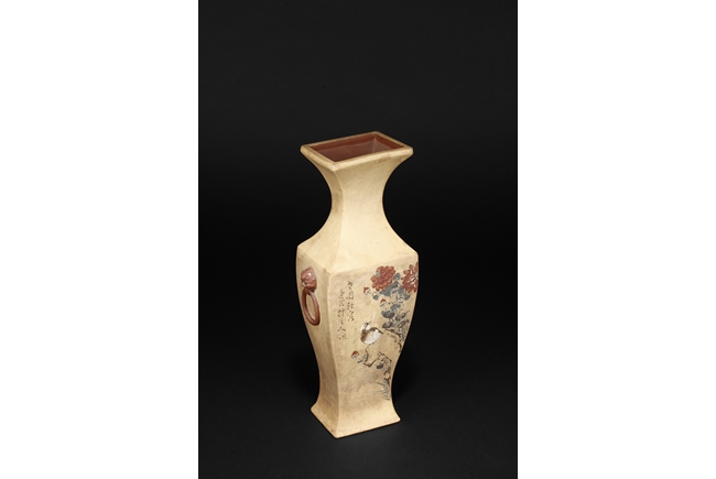 Of curved rectangular design, the vase curves elegantly at the neck and waist, with rectangular rim, body, and foot, the body painted in colors with flowers, birds, and calligraphy, with a pair of beast mask loop ring handles on the side, the exterior in yellowish-brown color, and interior in reddish-orange color. Republic period.