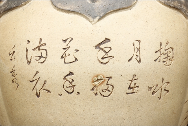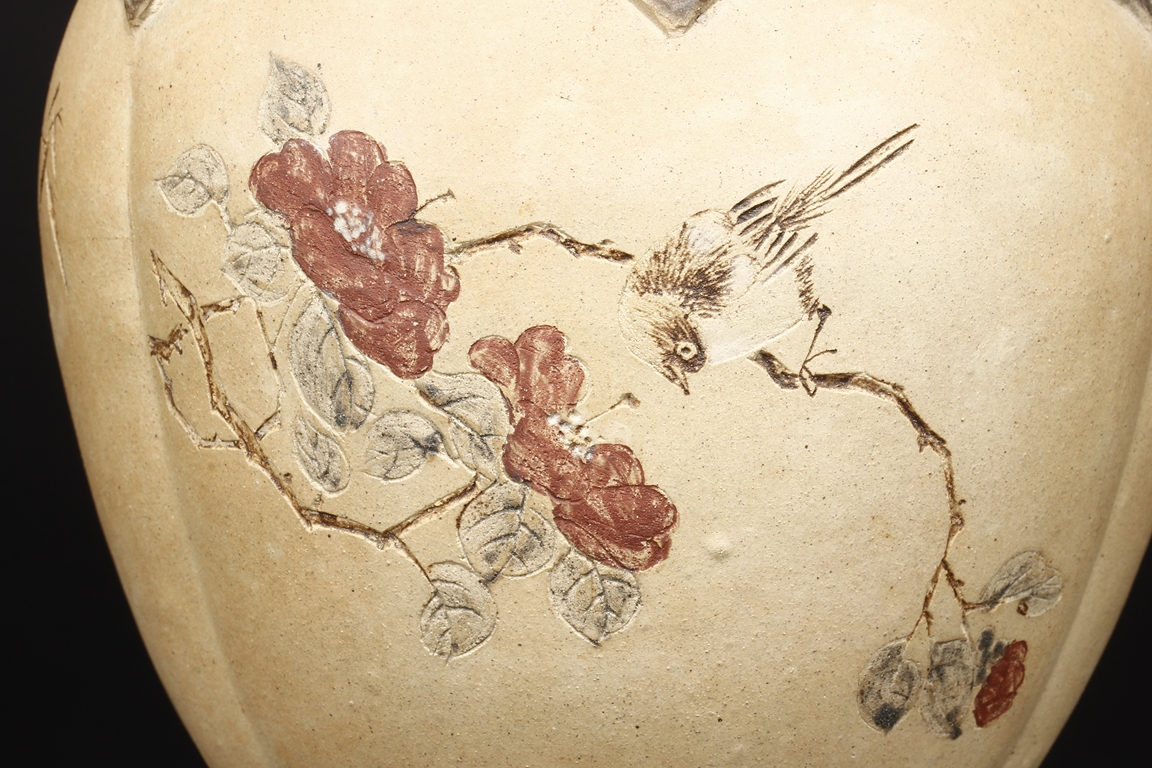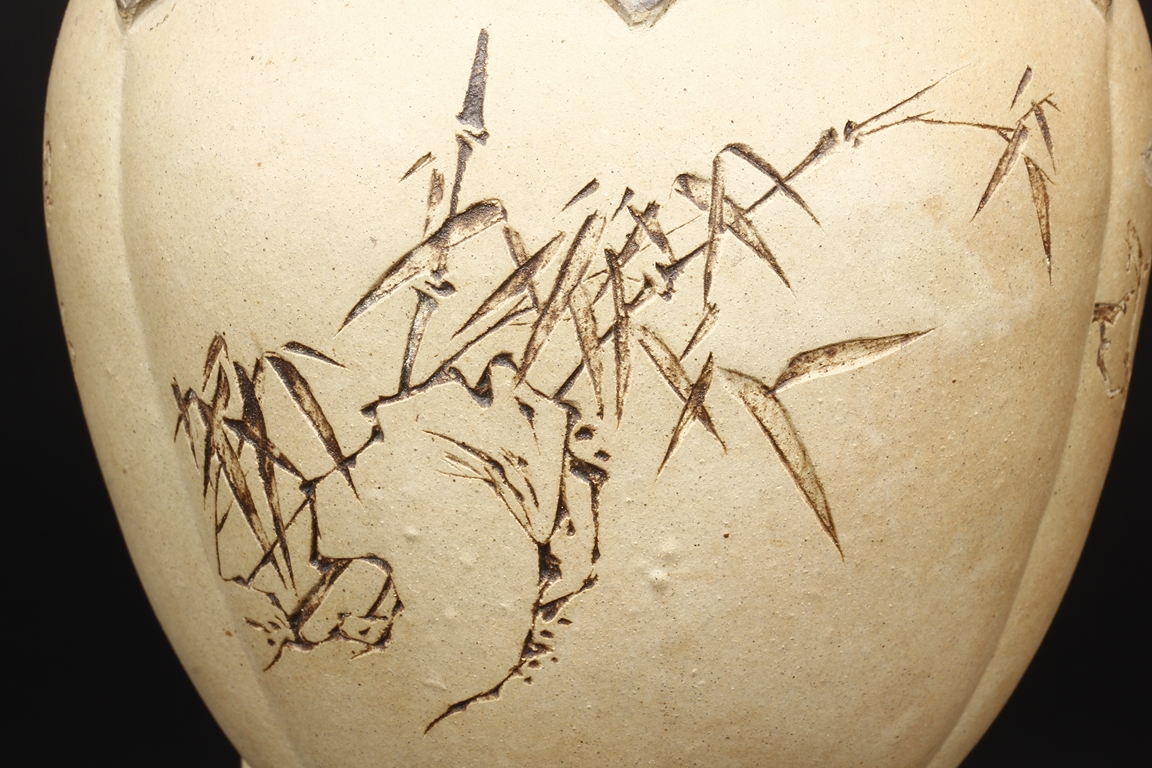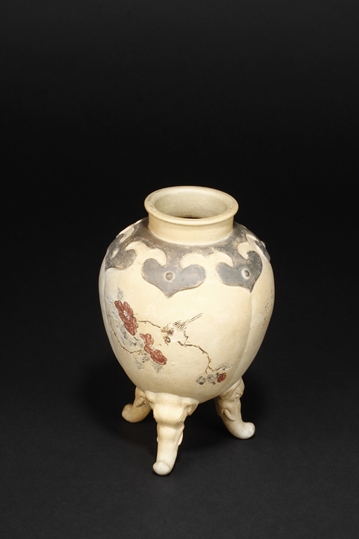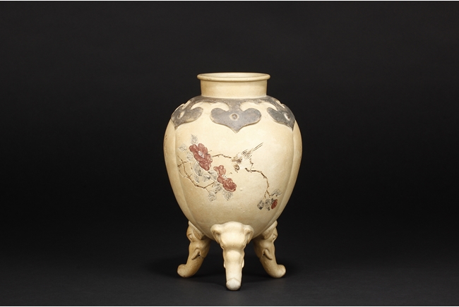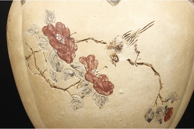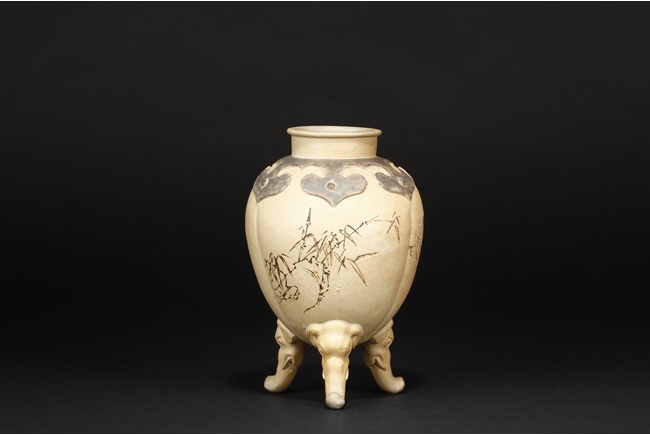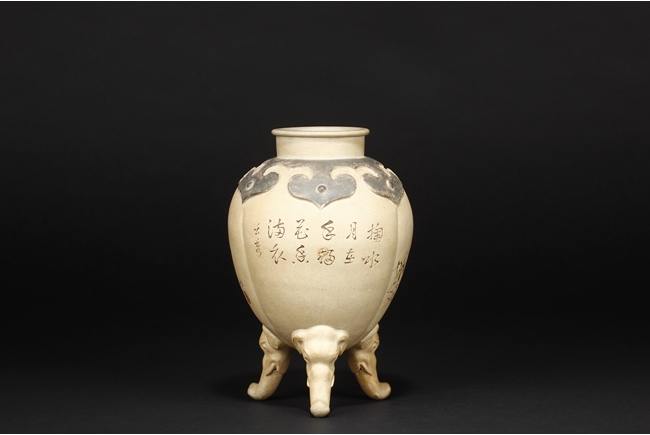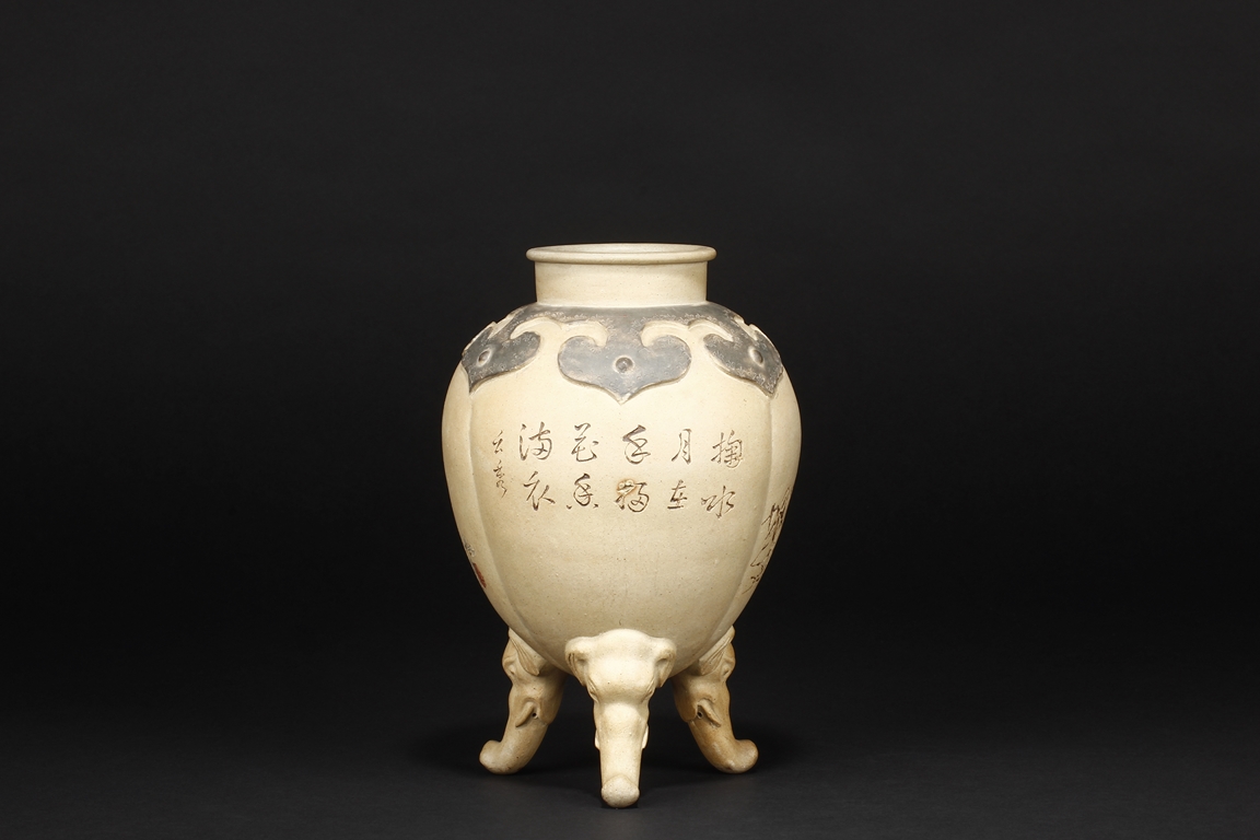 卷沿束頸,圓肩,腹為三瓜菱型,鼓圓腹上刻詩文,竹,及彩繪花鳥,三足飾以象鼻,肩部飾以如意雲肩紋。此瓶應是晚清民國時期作品。
