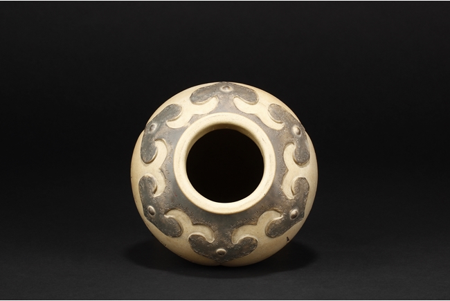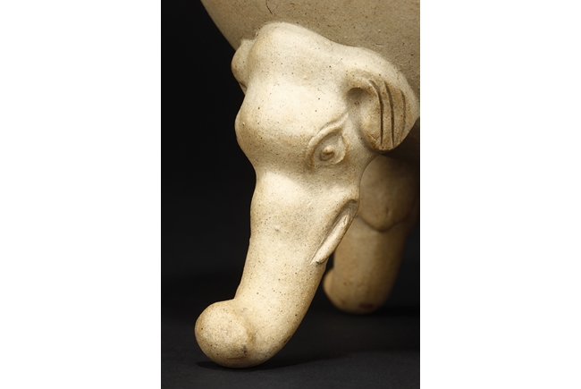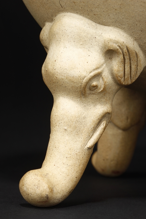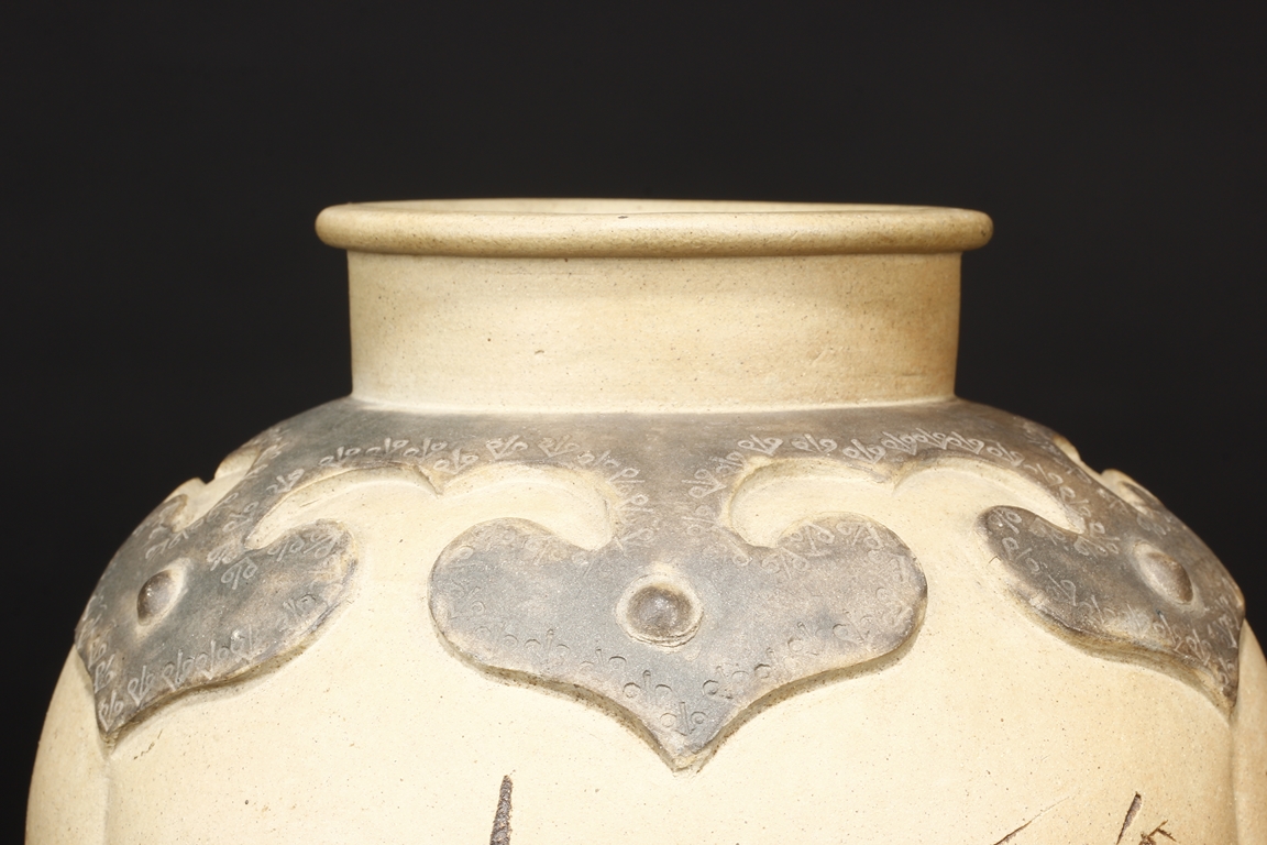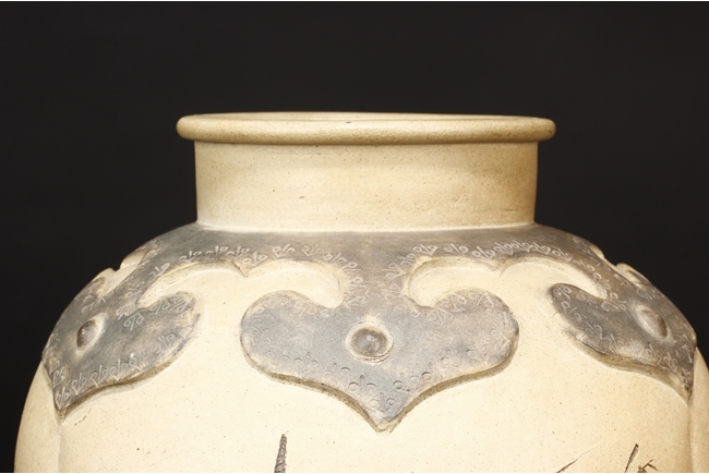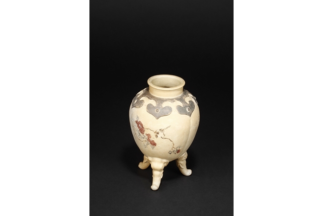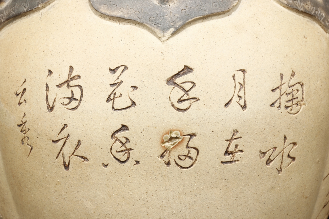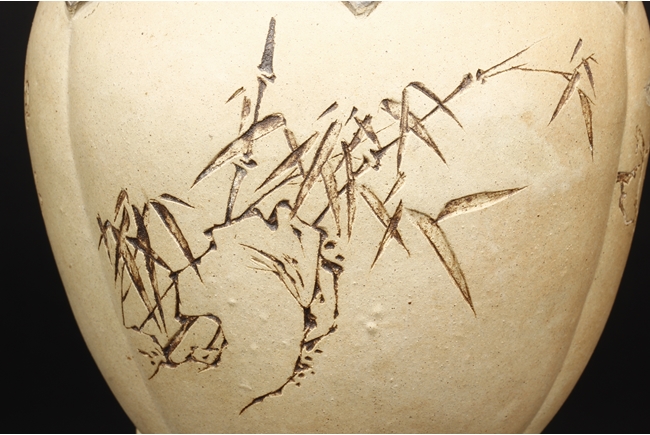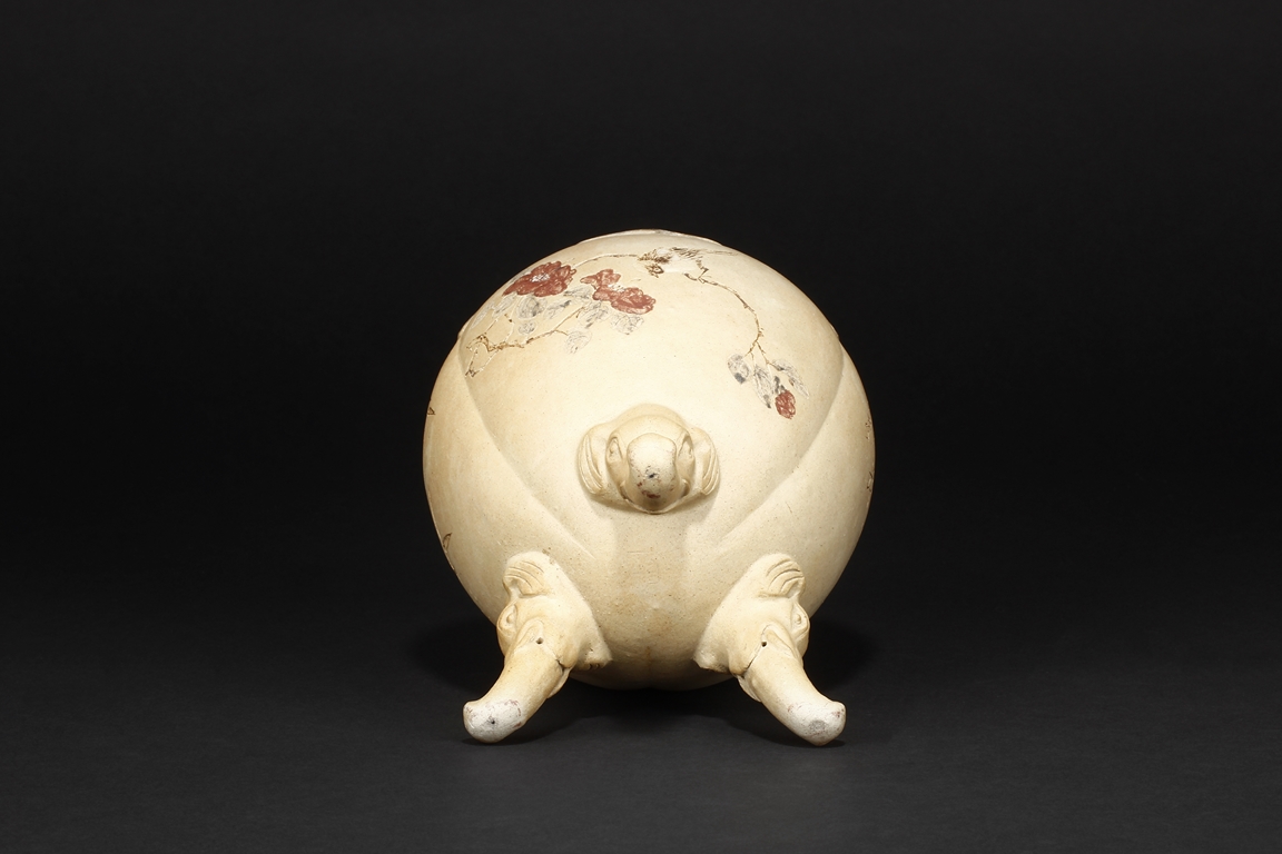 卷沿束頸,圓肩,腹為三瓜菱型,鼓圓腹上刻詩文,竹,及彩繪花鳥,三足飾以象鼻,肩部飾以如意雲肩紋。此瓶應是晚清民國時期作品。