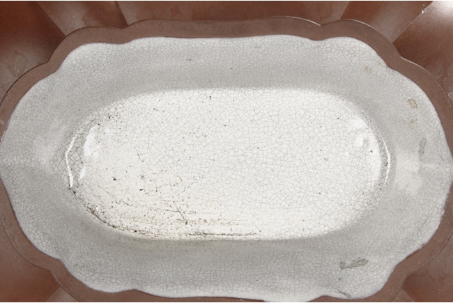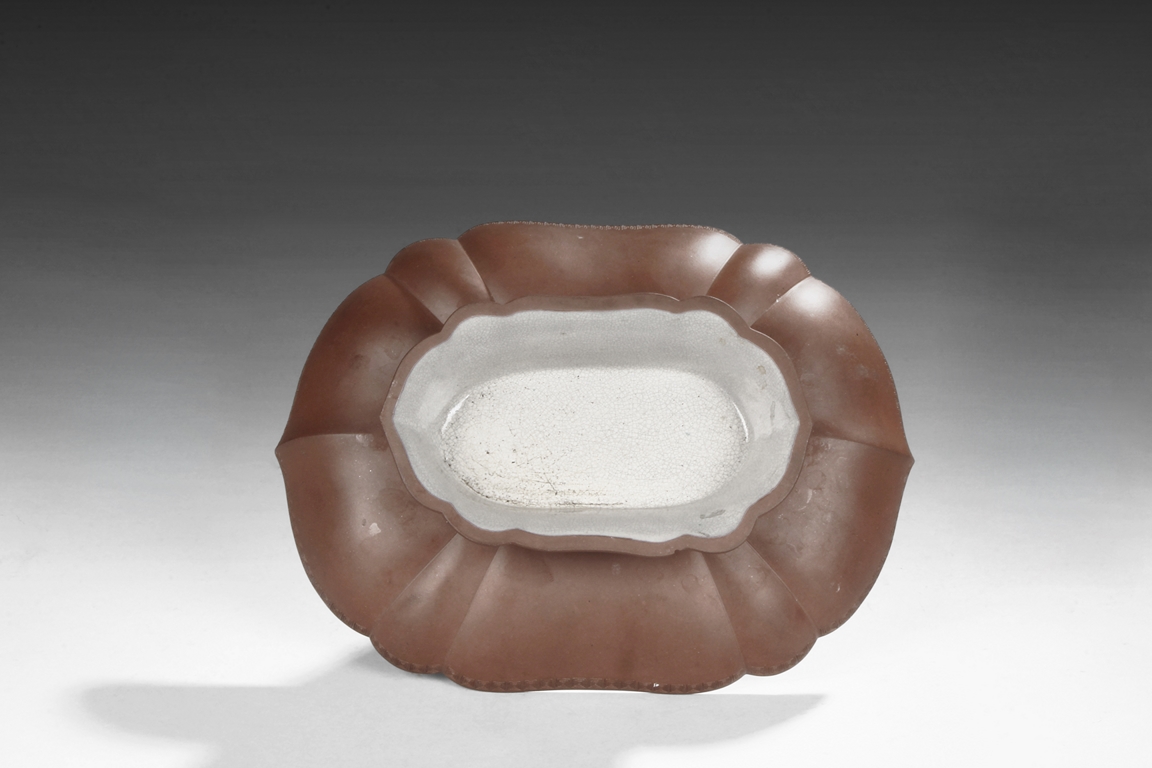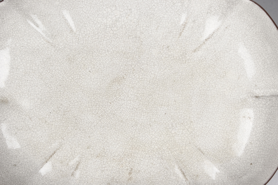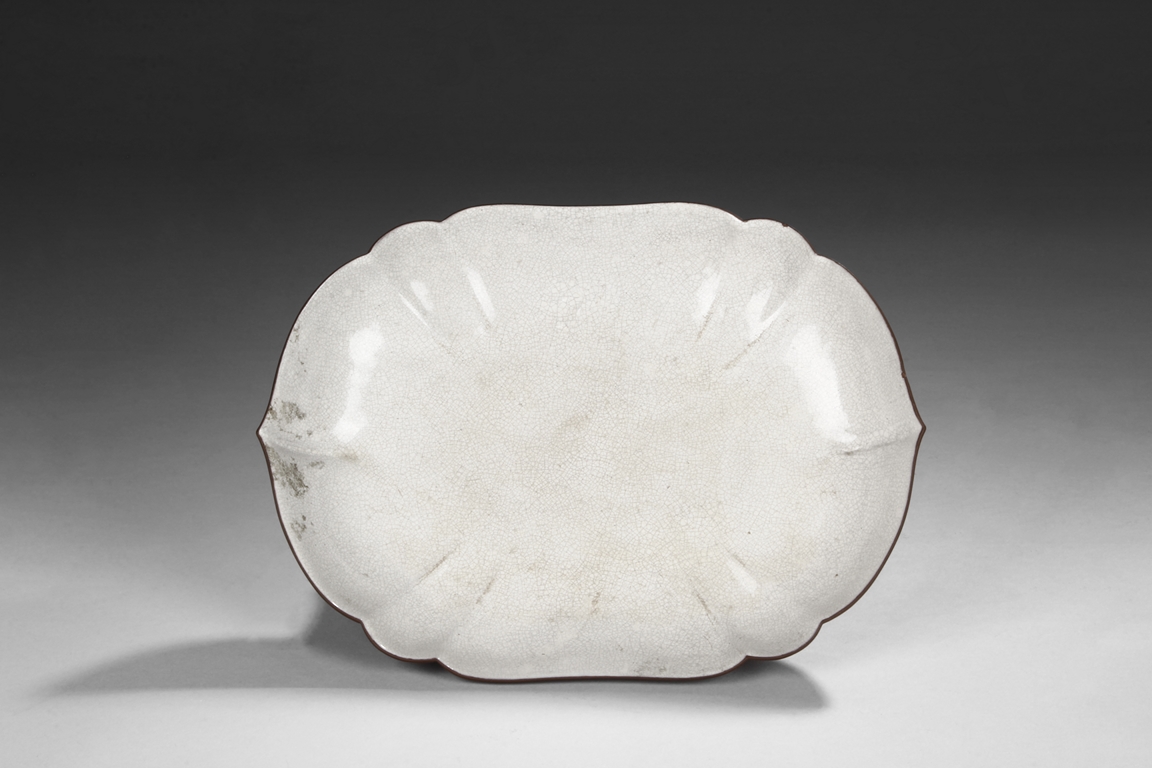 此盤海棠式,弧形璧,豐滿圓腴,底平坦,盤內、足內均飾有白釉,開片細密,似魚子狀,盤口飾有一周回紋,器型典雅,賞、用兩相宜。類似製品故宮有收藏。