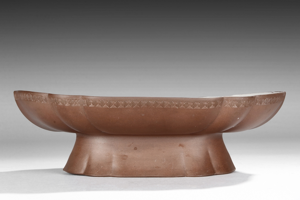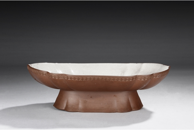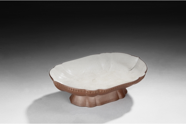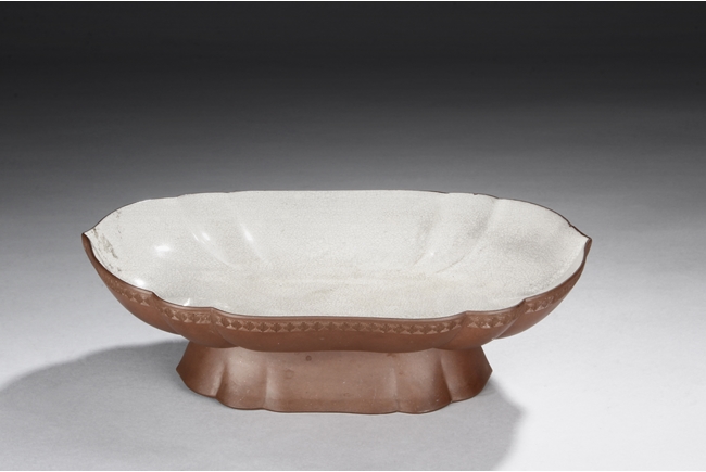The plate shaped in floriform, similar to Haitang flowers, with key-fret patterns on the rim edge, exterior in brown color, interior and bottom with crackle patterns on top of white glaze, supported by a high reversed floriform feet. Similar plate can be seen in National Palace Museum in China.