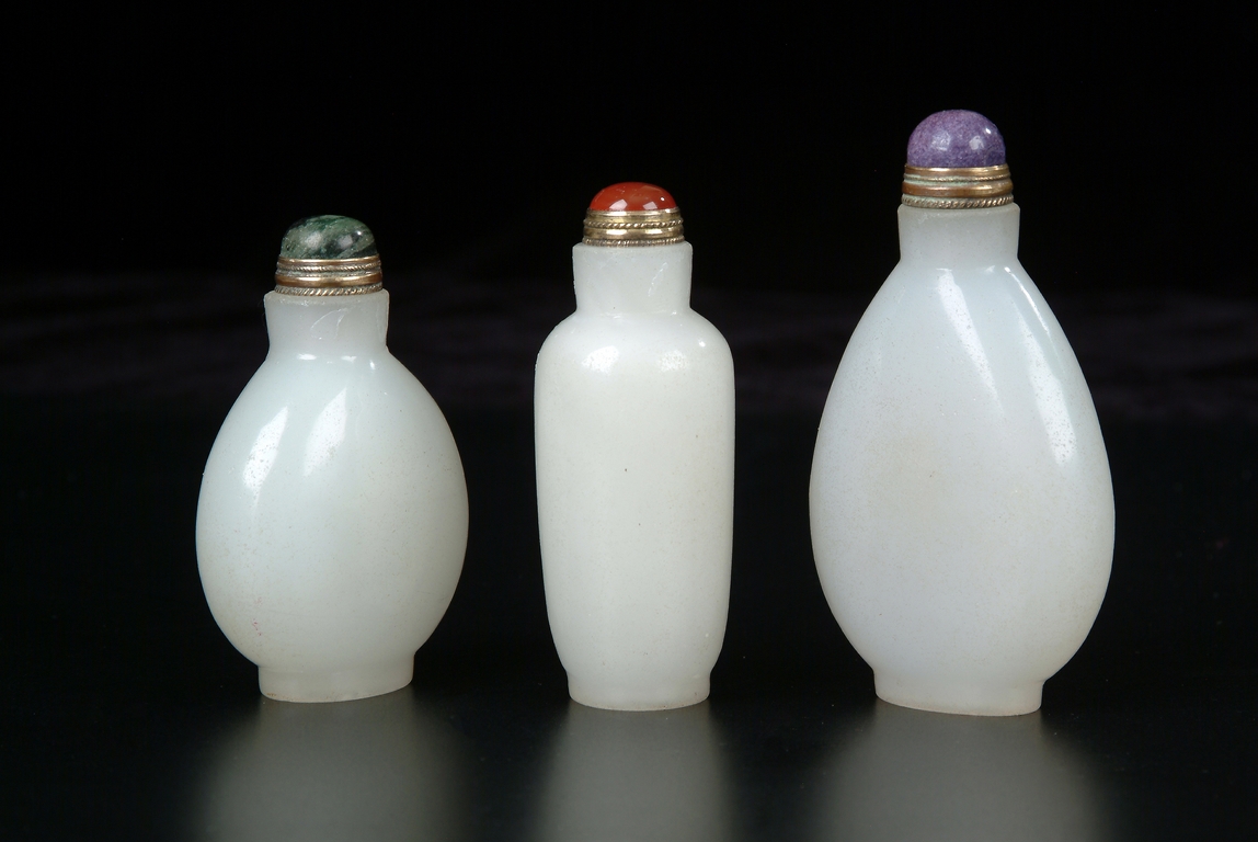 The group comprises three translucent white glass snuff bottles of different shape, one in flattened ovoid form, one in high-shouldered cylindrical form, and the other one in pear shape, and all raised on a short oval foot rim. Each snuff bottle is capped off with a glass stopper. Republic Period.