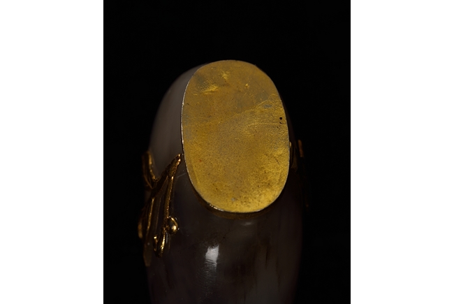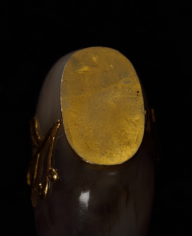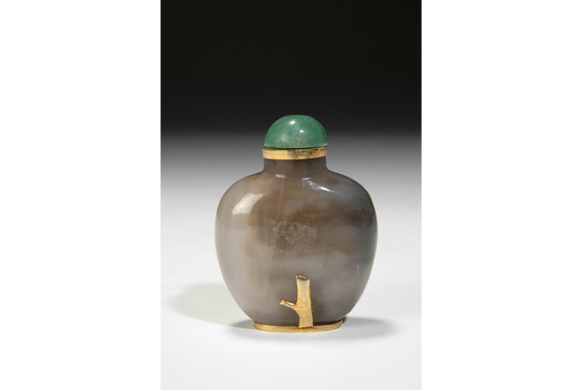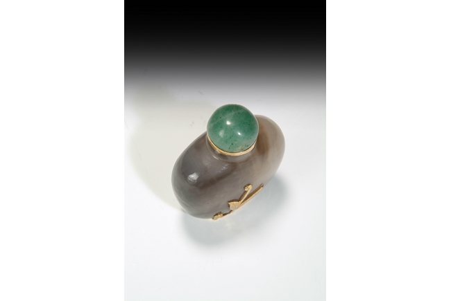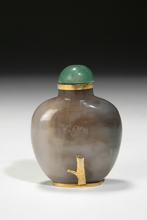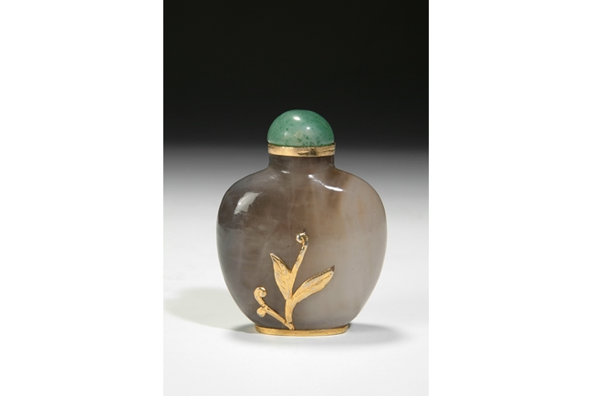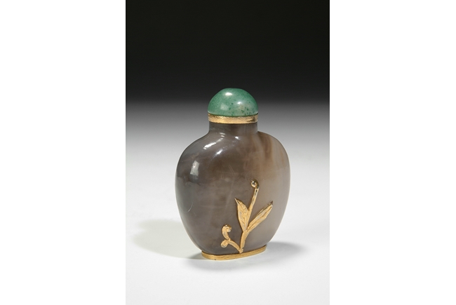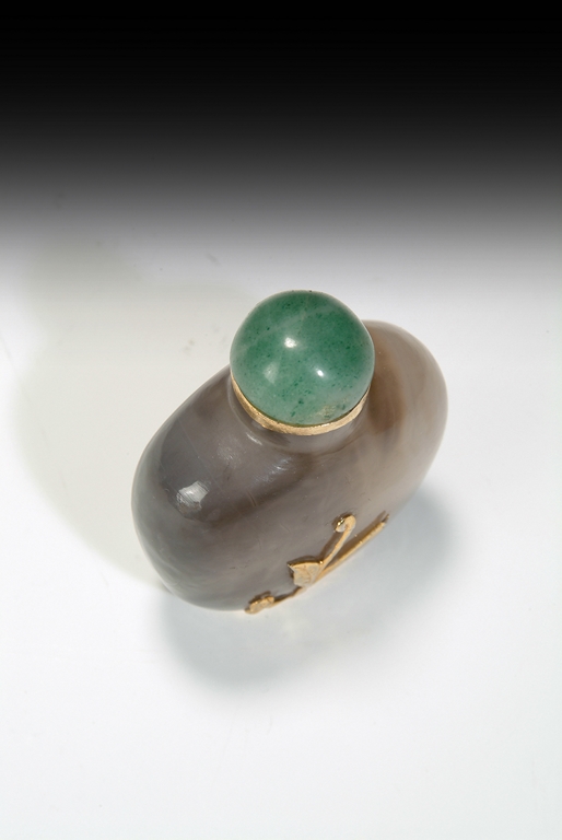 This agate snuff bottle is decorated with gilt mouth trim, base, and a flower spray on the body issuing from the base. It is topped with a hard stone stopper. Qing Dynasty period.