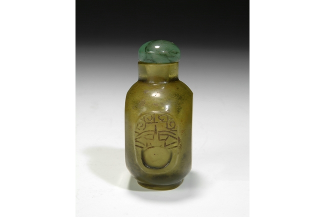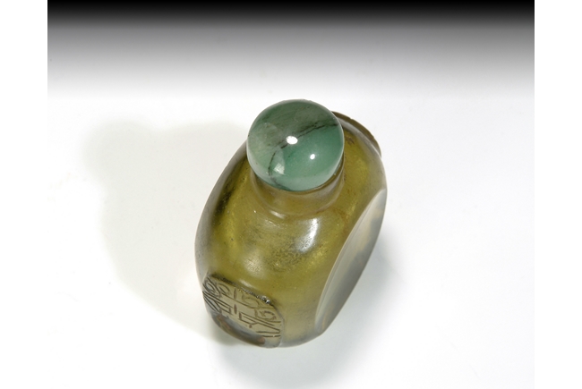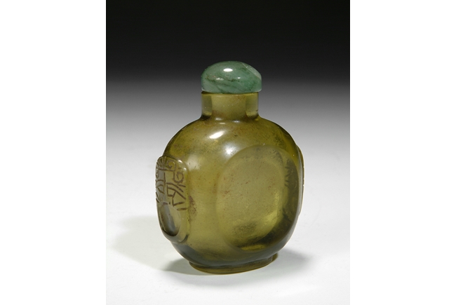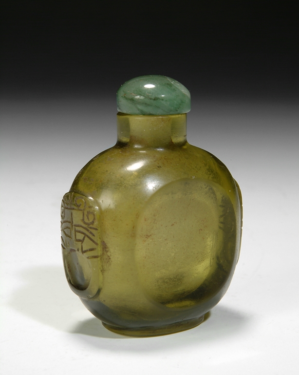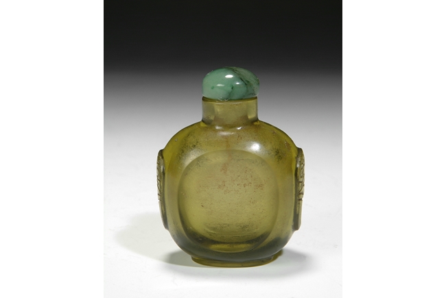 This translucent glass snuff bottle is topped with a hard stone stopper. Each side is carved in low relief of mythical best mask with ring shaped decoration. Republic period.