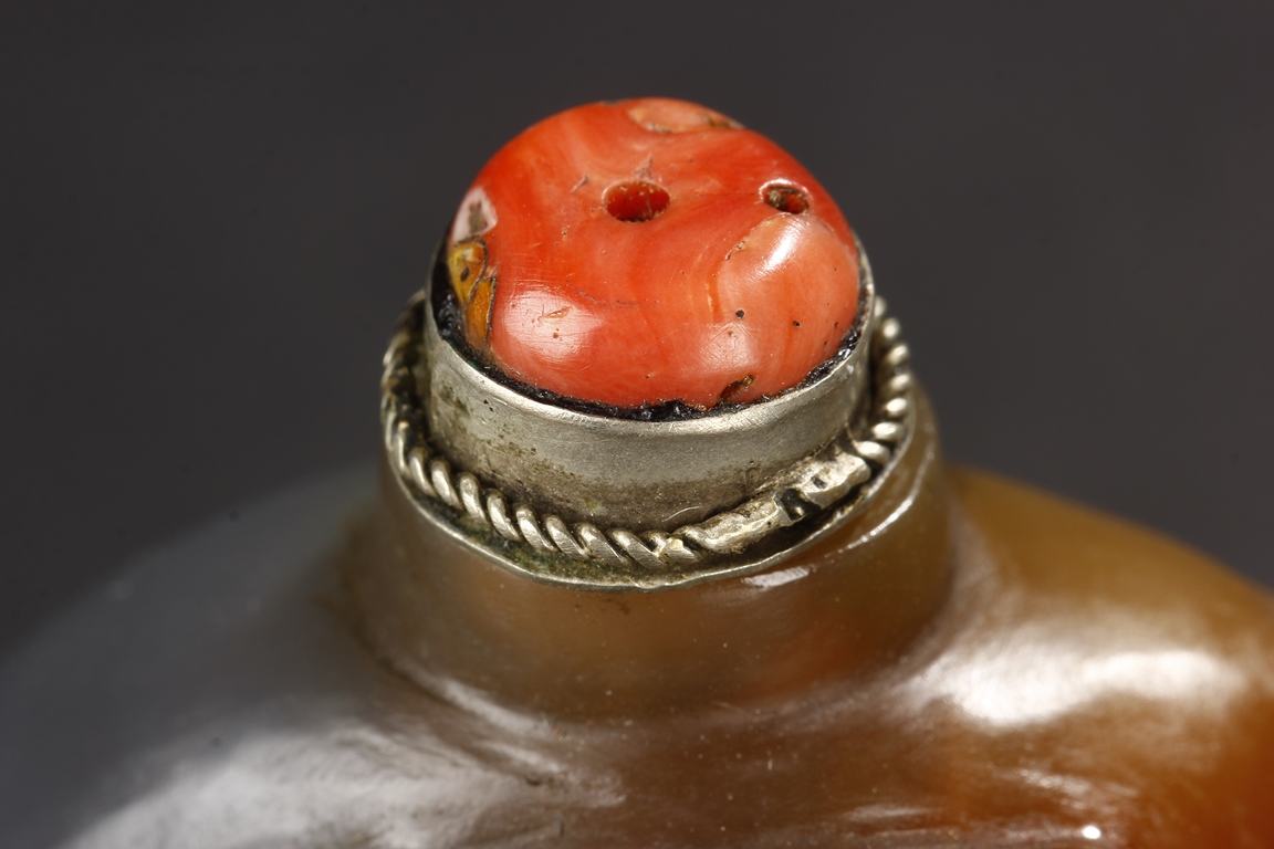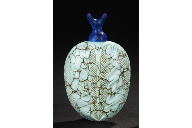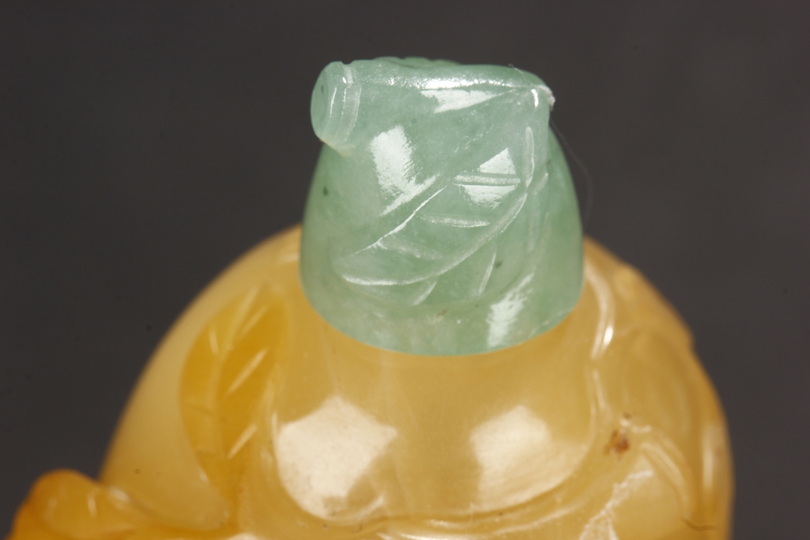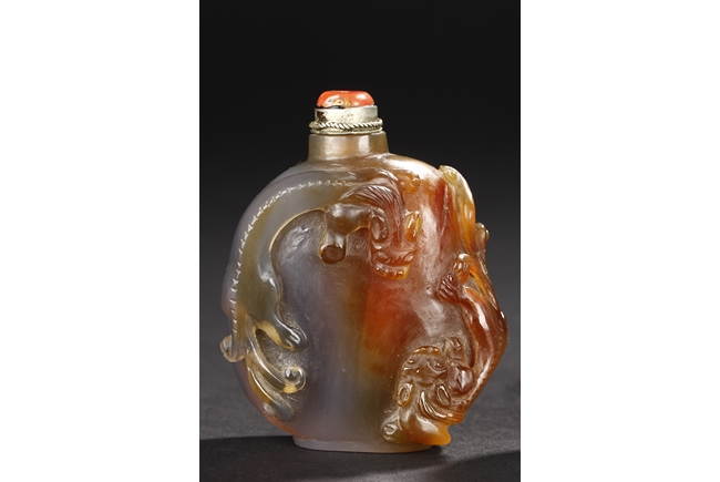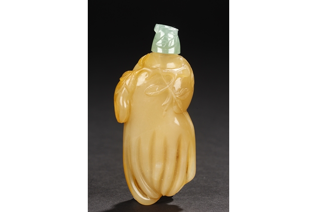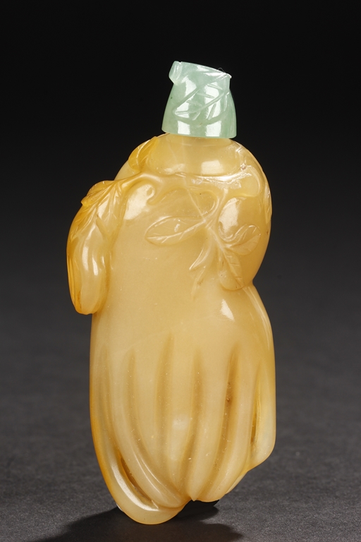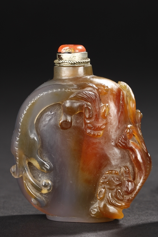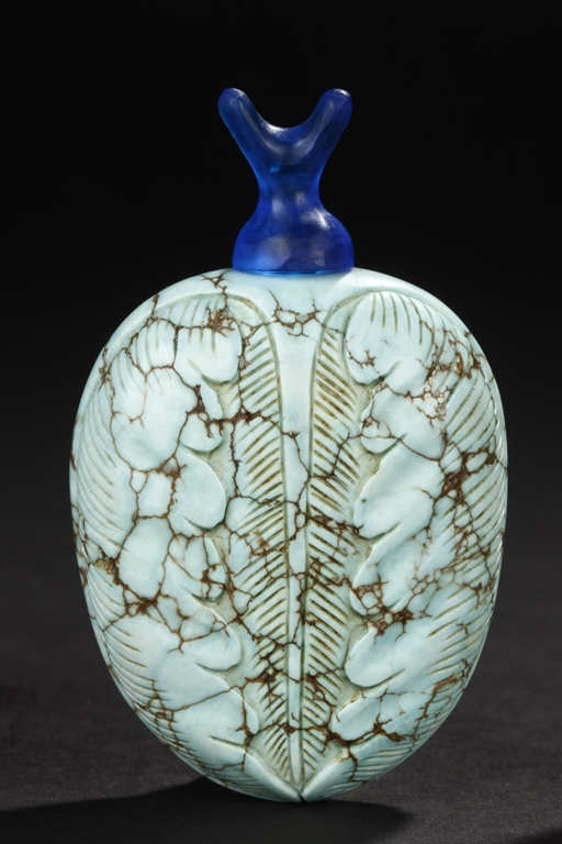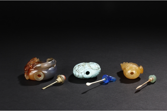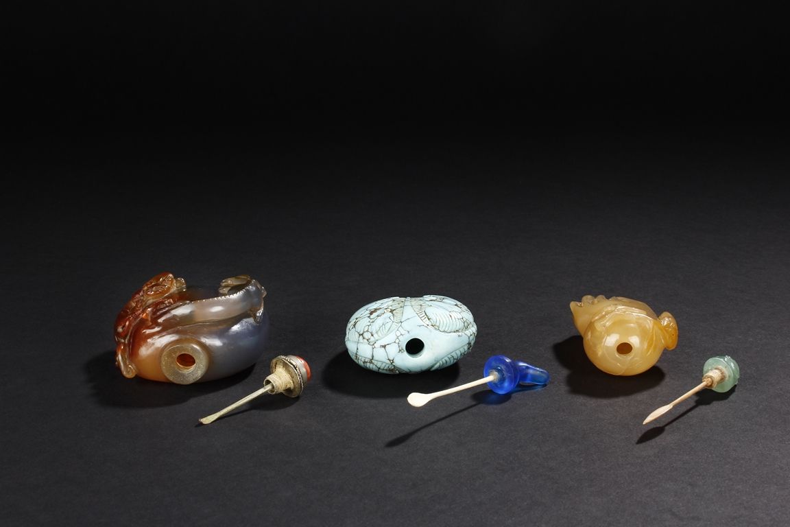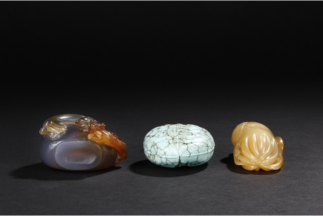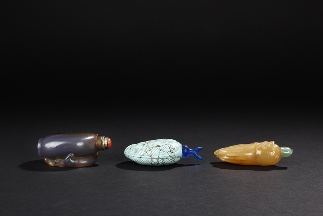 The three snuff bottles each with different design. One snuff bottle is of purplish-red color, the body carved with chilong dragons, with a coral stopper. One snuff bottle is of turquoise, the body lightly incised in the form of banana leaf fan, with a blue stopper. One snuff bottle is of brown color, the body carved in the form of fingered citron, with a teal stopper. Qing Dynasty Period.