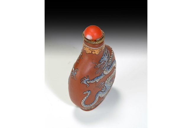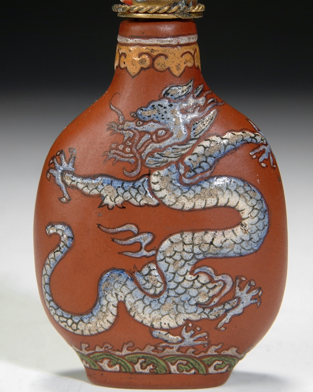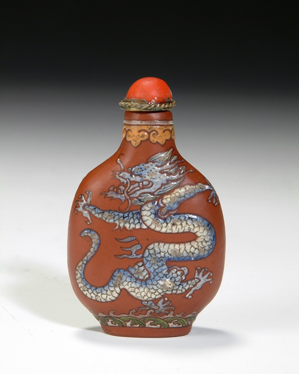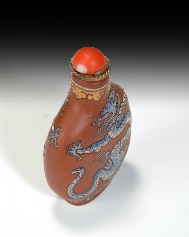 This Zisha snuff bottle is decorated with a five clawed dragon above the sea on both sides, and topped with a imitation coral stopper. Qing Dynasty Period.
