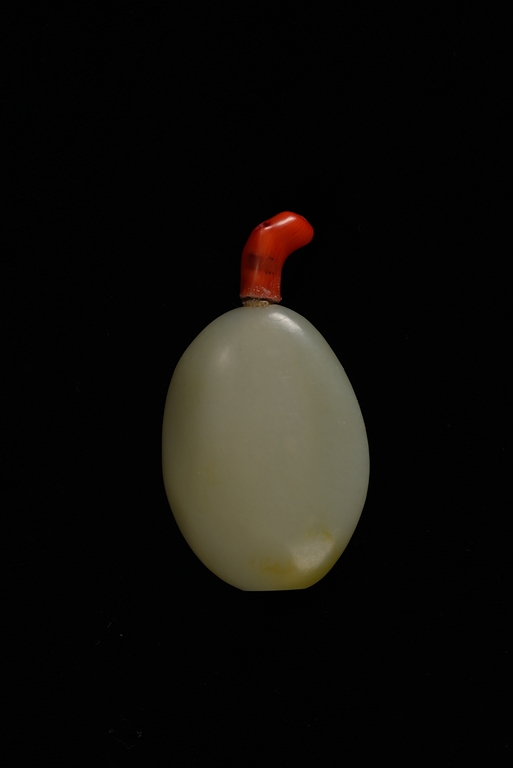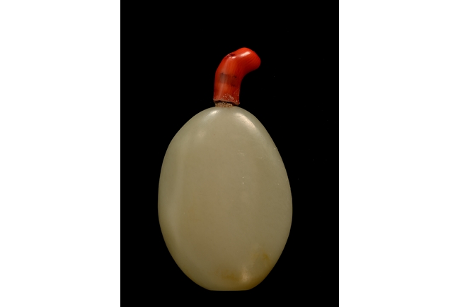 This white jade snuff bottle is carved out of a riverbed pebble 'ziyu', and it is topped with a coral stopper. Qing Dynasty period.