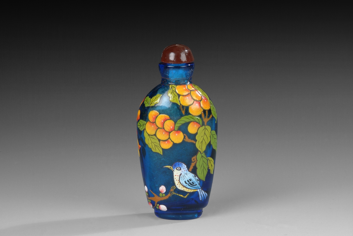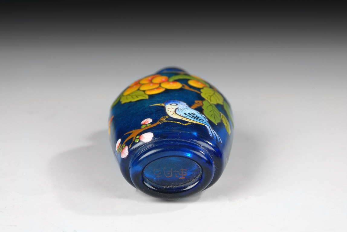 Of elongated cylindrical form, tapering down from shoulder to a round foot, the body depicts two colorful bird perched on fruit and flower trees over the blue colored glass, and is capped with brown color glass stopper. Missing spoon. Late Qing Dynast Period.