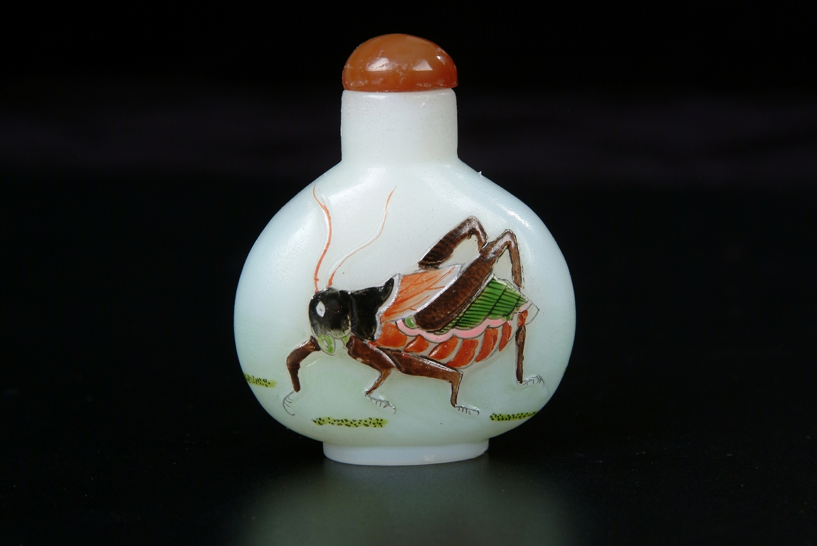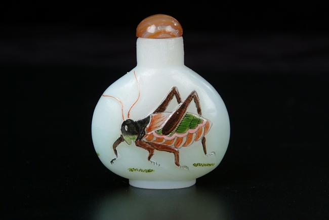 The flattened, rounded bottle of white glass snuff bottle is raised on an oval foot and enameled on each side with a large cricket, beautifully colored. Hard-stone stopper. Republic period.