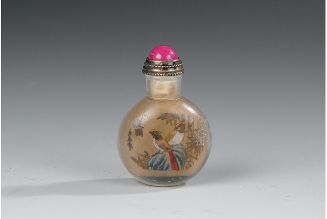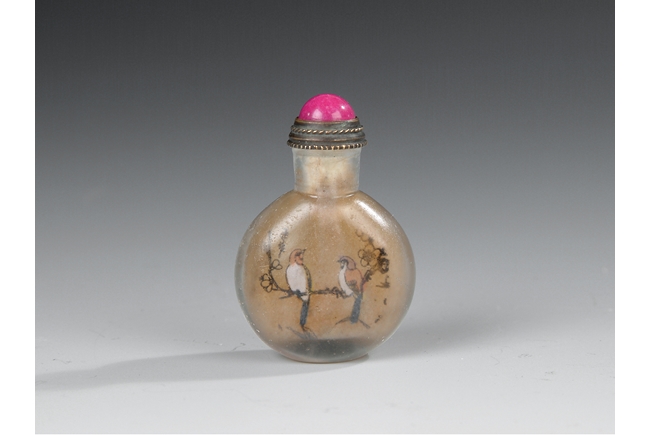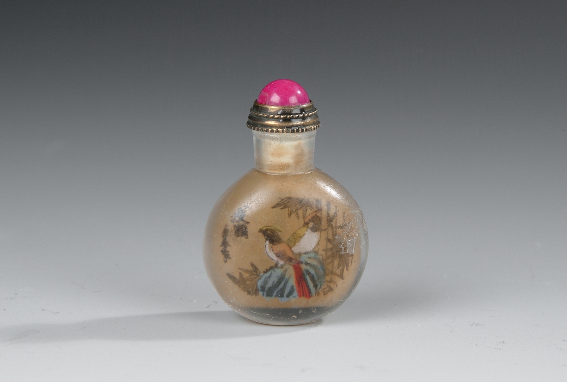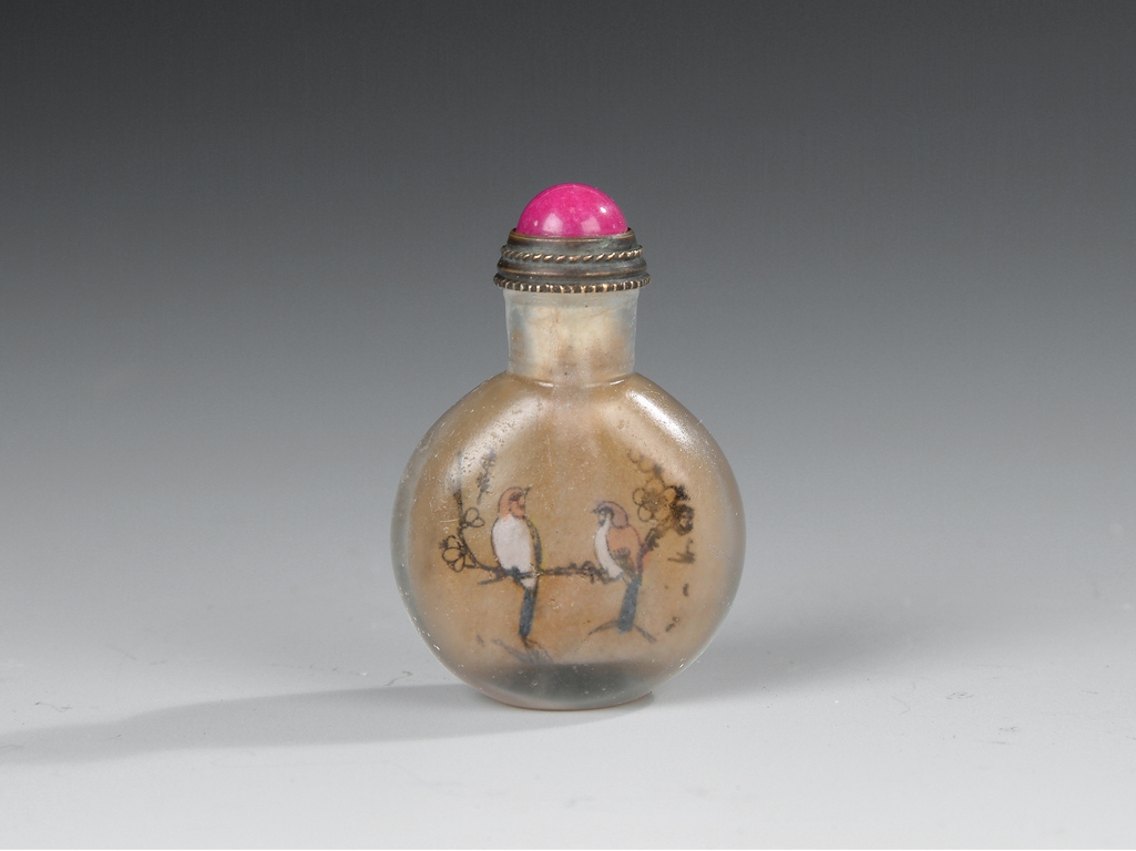 This small snuff bottle is of ovoid form and finely hollowed, inside-painted with two birds of different types perched flower branches on each side, with artist seal. Republic Period.