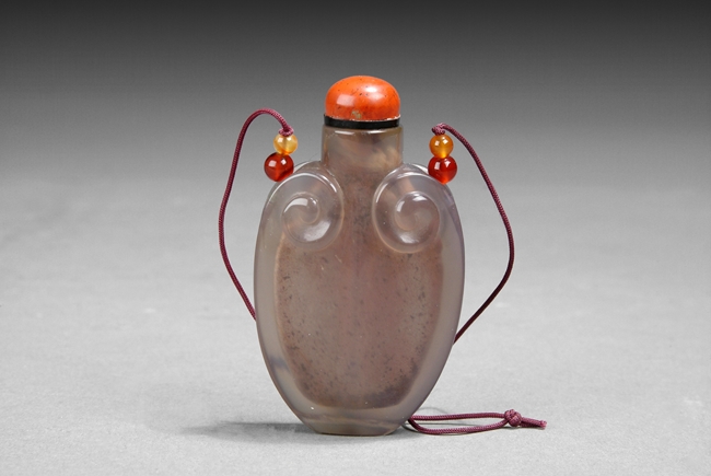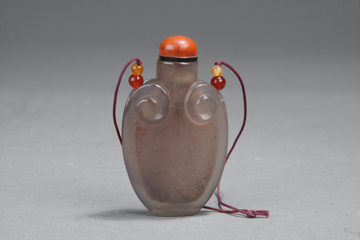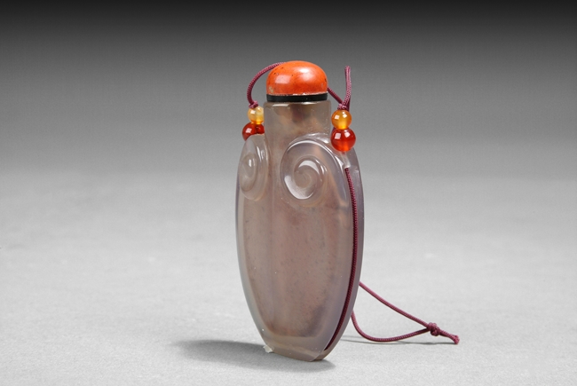 This finely carved snuff bottle is of rounded flat form with flat base, circular spiral patterns on shoulder, and with string and small beads attached through side of body. It is capped with hard stone stopper. Missing spoon. Qing Dynasty period.