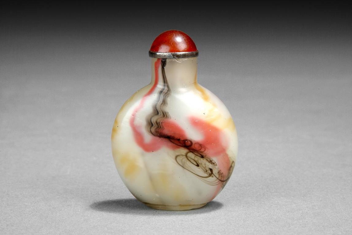 Of flattened, rounded form, the bubble-suffused glass has blackish-grey and traces of red swirls floating down the bottle, the effect suggestive of a thin veil mist. Capped with an amber stopper. Qing Dynasty period.