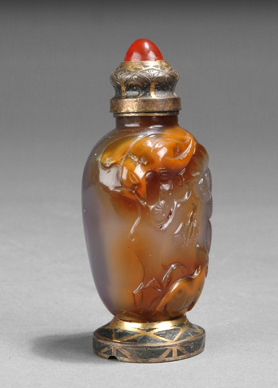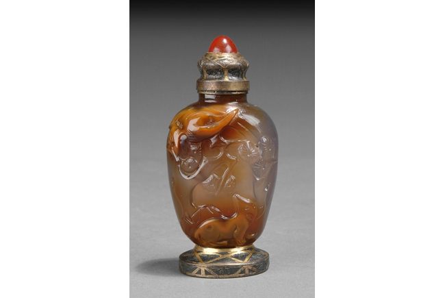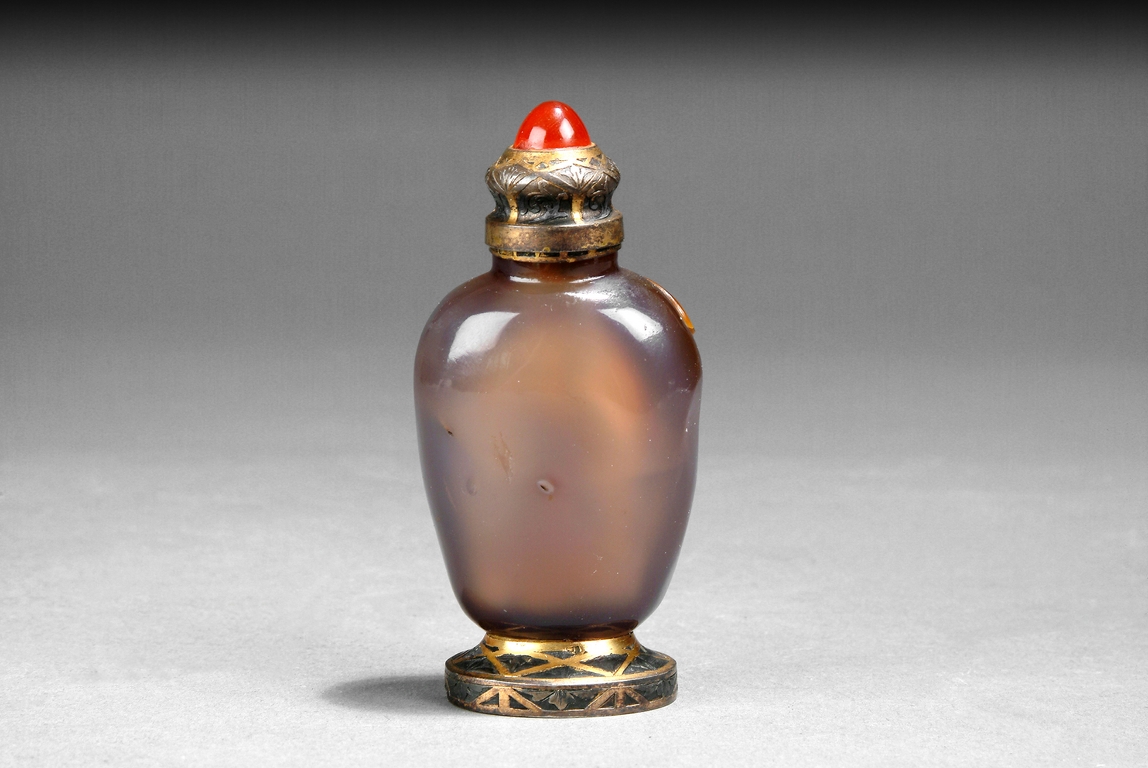 Of rounded, rectangular shape, the bottle is finely carved through with two russet-brown animals on one side, a bird and a squirrel. There is a pine tree standing between the two animals; The top and bottom are encased in bronze with triangular design. Complete with Bixi, or pink tourmaline, stopper. Qing Dynasty Period.
