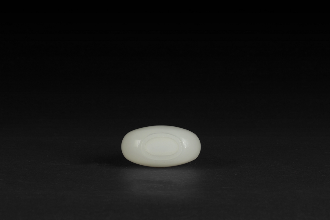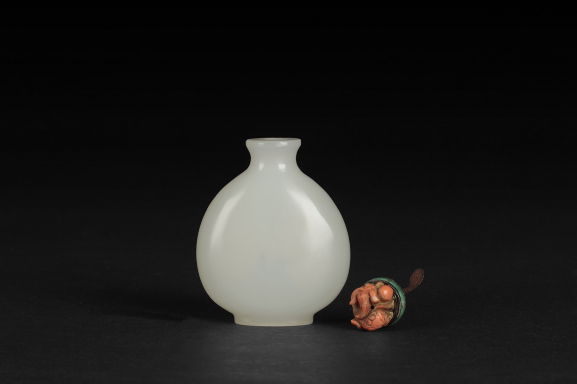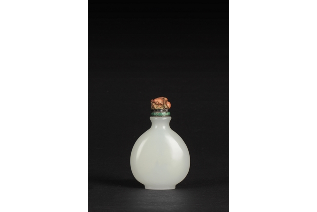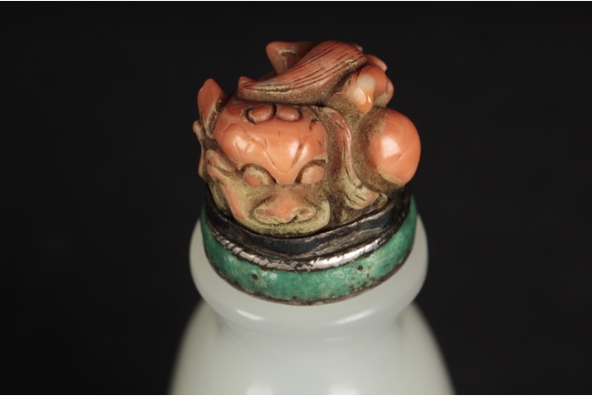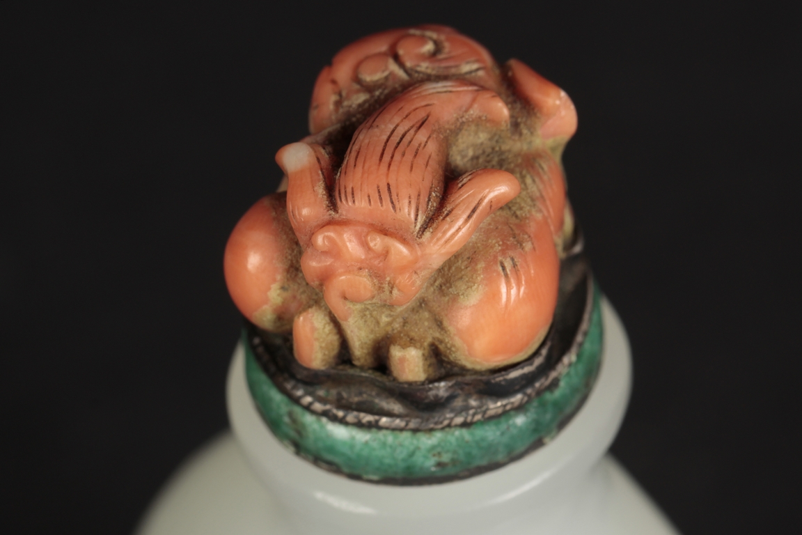 Of flattened ovoid form, the glass body is of smooth white color, and the original coral stopper is carved with a coral Buddhist lion surmounted on top. Qing Dynasty period.
