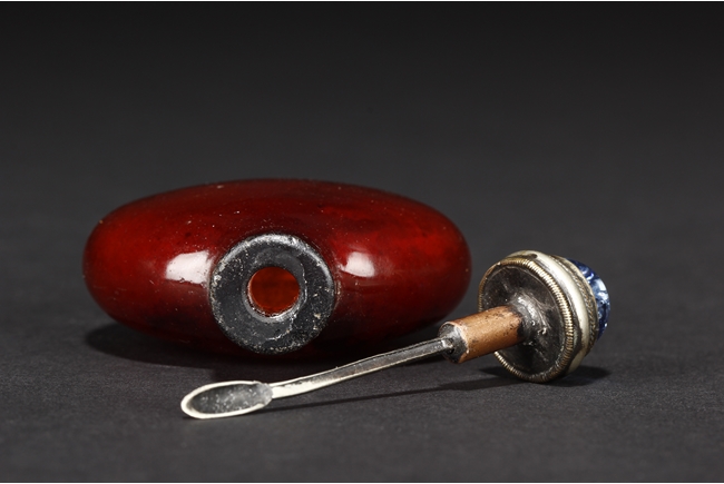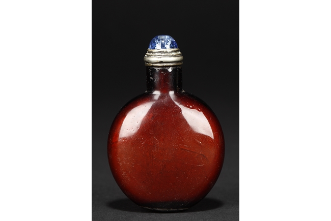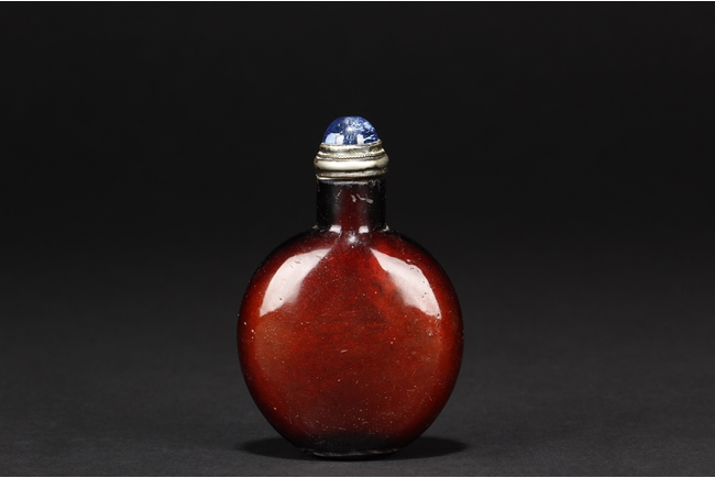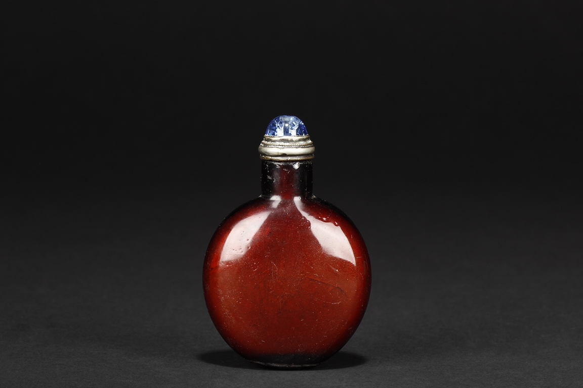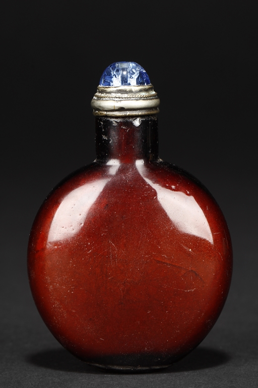 This snuff bottle is of flattened ovoid shape. The glass is of translucent tea-brown tone. The stopper is of translucent blue glass with bronze rim beneath. Qing Dynasty Period.