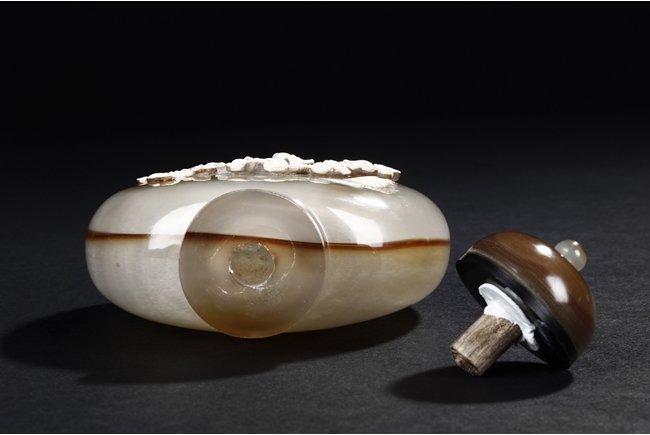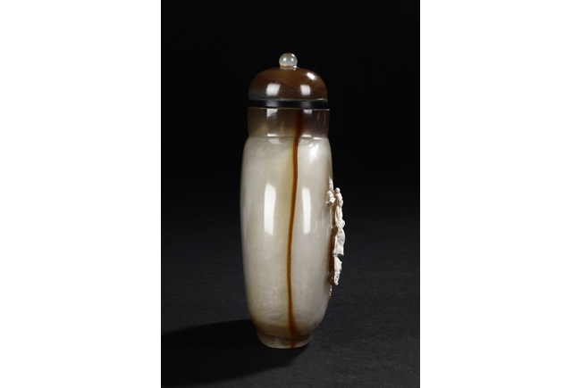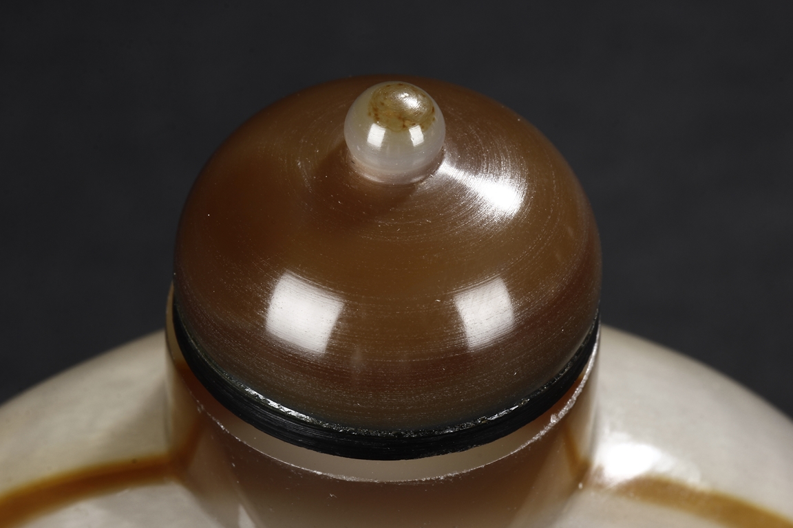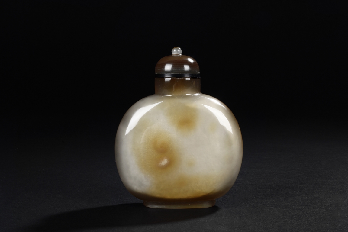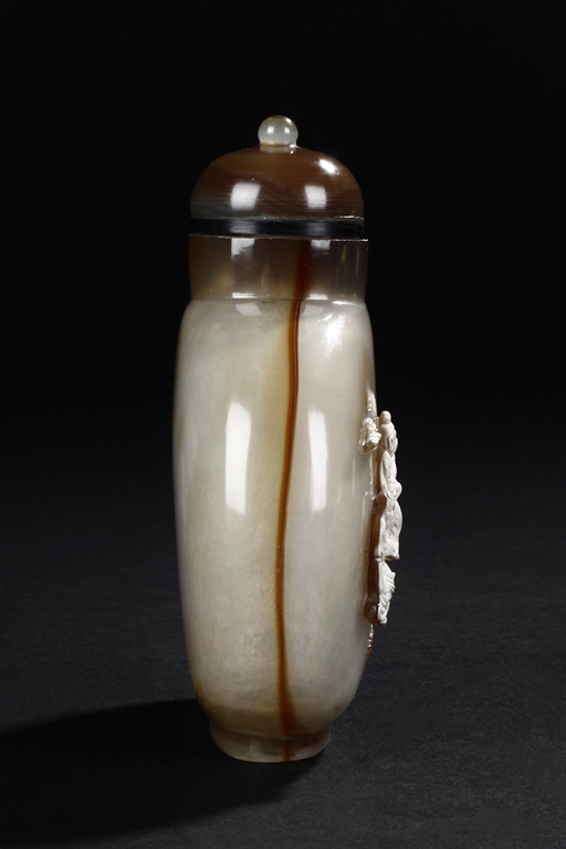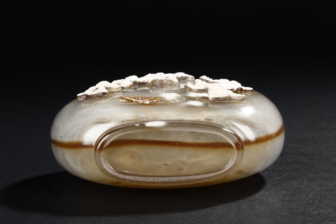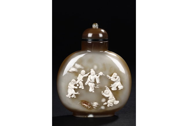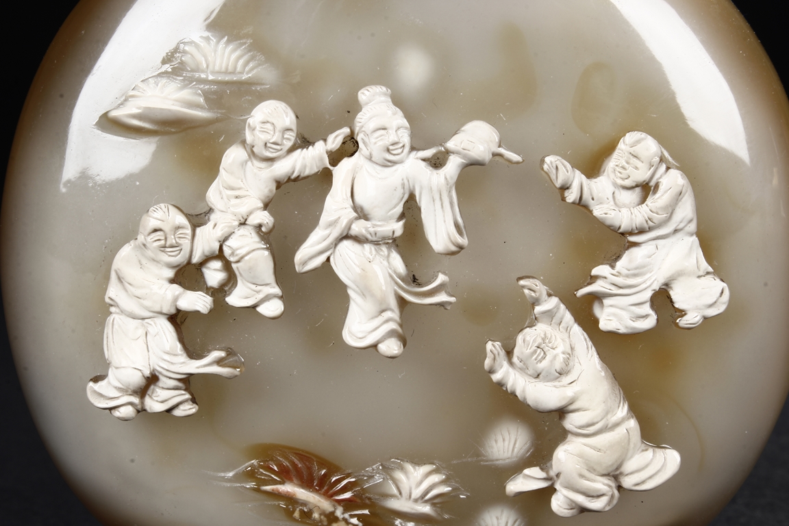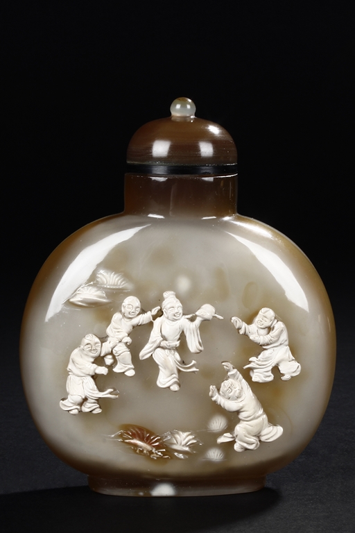 Of flattened ovoid form, the snuff bottle's front cleverly carved with five children playing together near bushes, against misty white and brown body, the reverse with russet, complete with en-suite domed stopper. Qing Dynasty period.