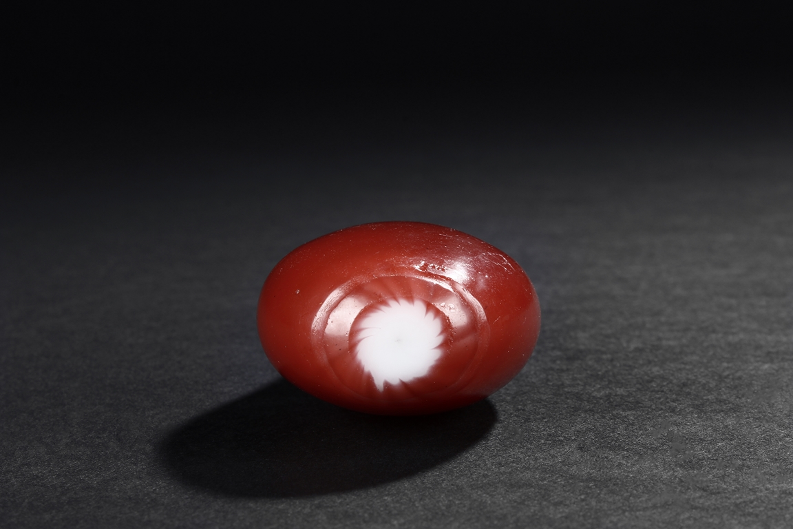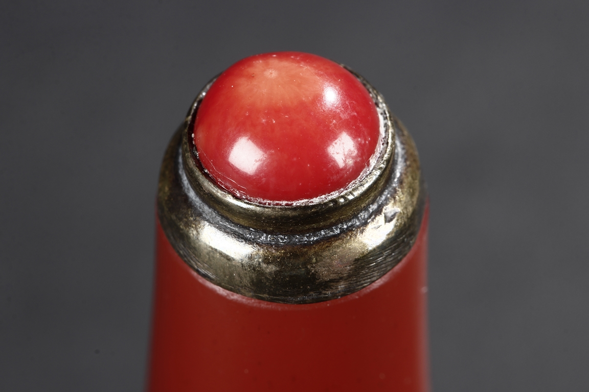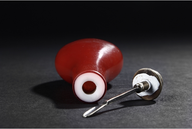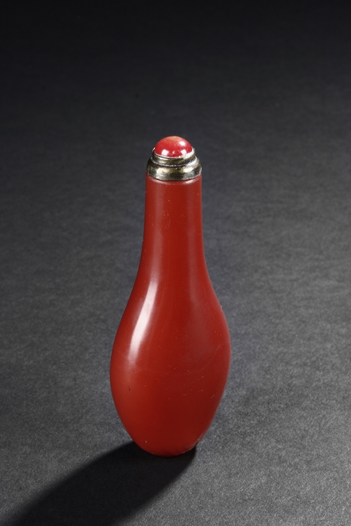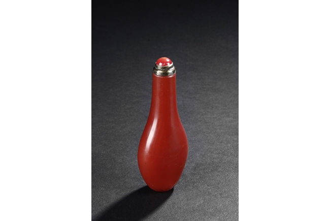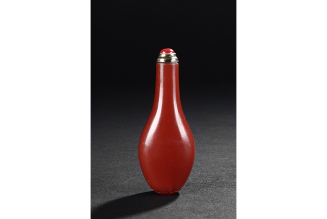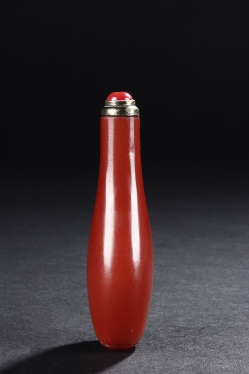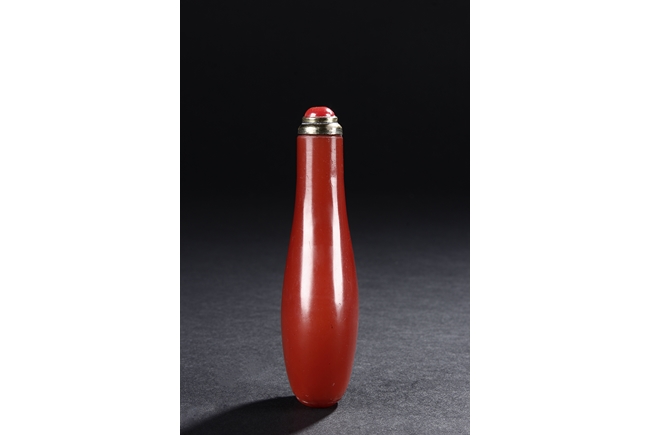 Of elongated teardrop form, the snuff bottle with uniform deep red color on the body, the bottom with a swirling white pattern, complete with metal encased coral red bead stopper. Qing Dynasty period.