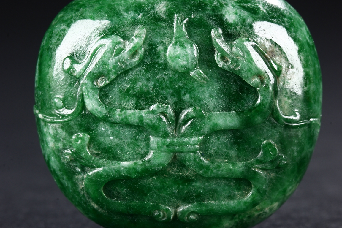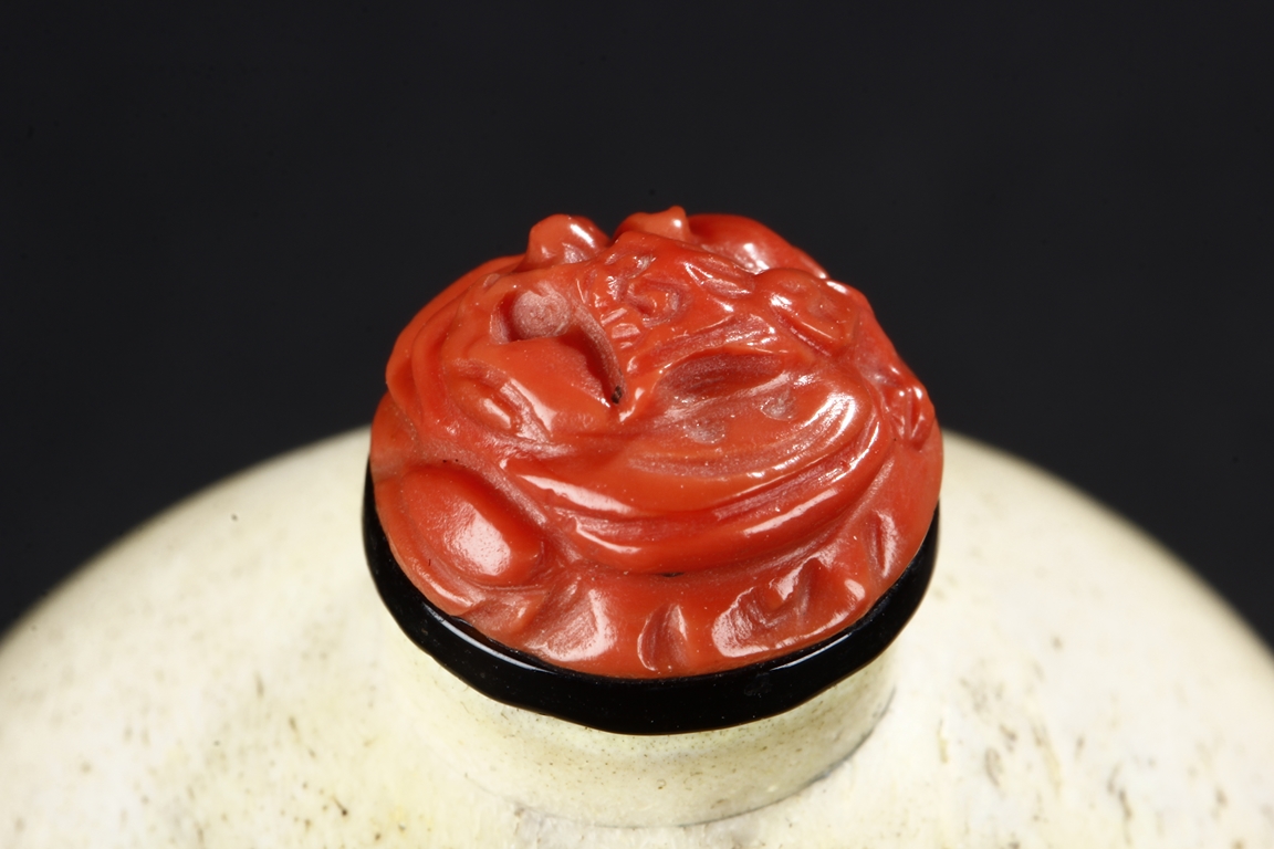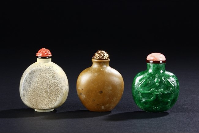 All three snuff bottles are of slightly varied flattened ovoid form. One snuff bottle made from white agate with carved coral stopper, one snuff bottle made from deer antler with golden stopper, and one snuff bottle made from nephrite carved with dragons with domed coral stopper. Qing Dynasty Period.