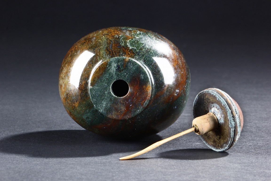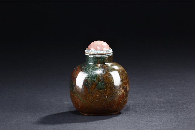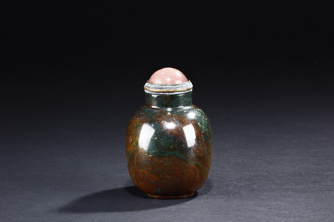 Of globular form, the snuff bottle made from agate with seaweed patterns, the color of natural mixed brown, green, and blue, complete with angel skin coral stopper. Qing Dynasty Period.