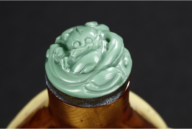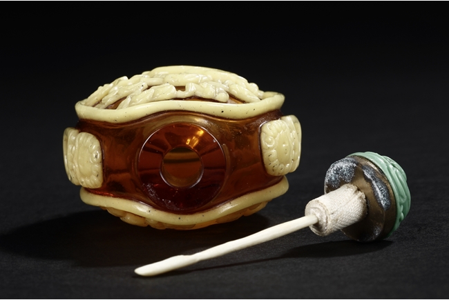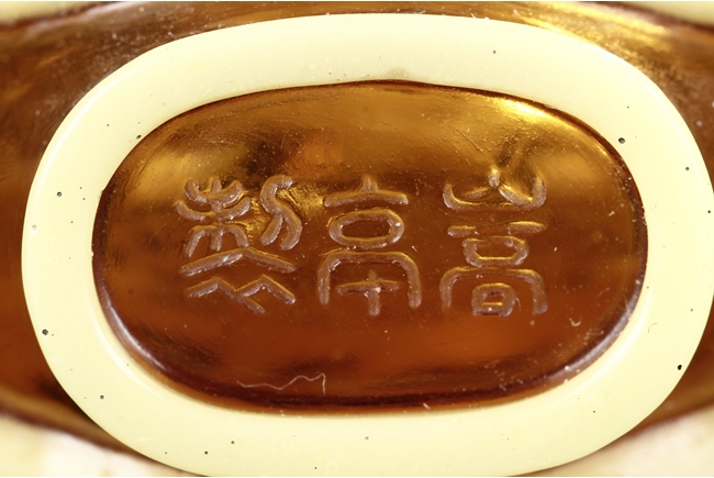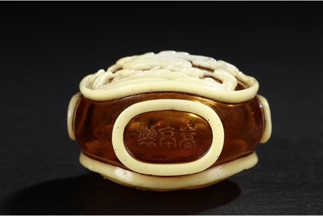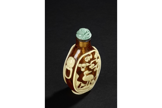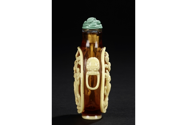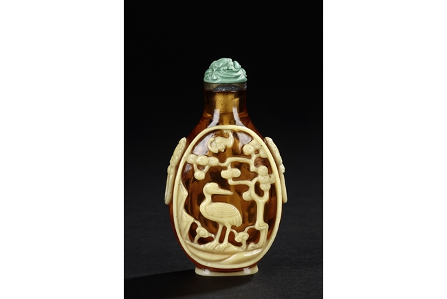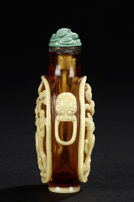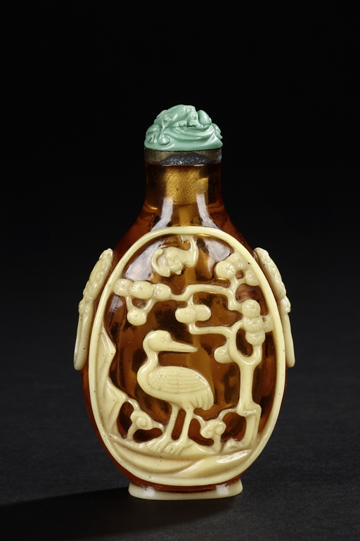 Of elongated flattened ovoid form, the ivory colored overlay depict a deer on one side, crane and bats on reverse, and beast mask loop handles on the side, signifying longevity, on top of amber colored translucent glass, complete with turquoise stopper. Qing Dynasty Period.
