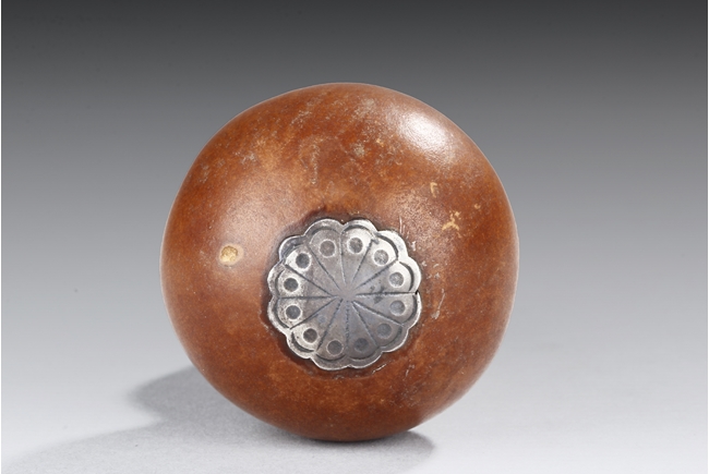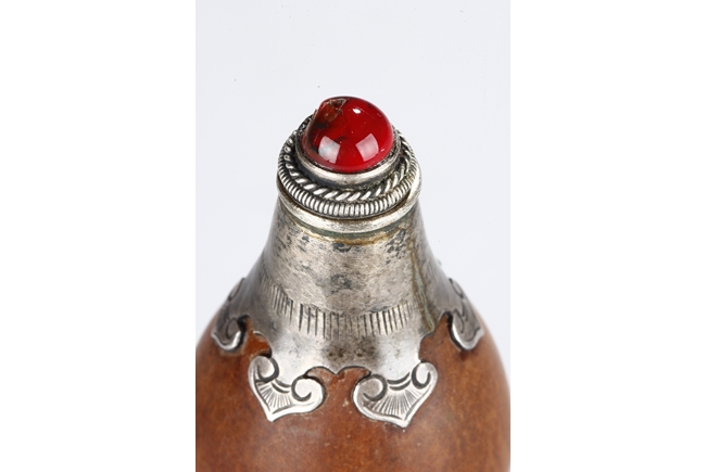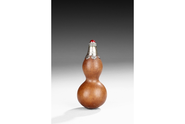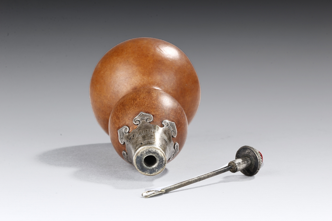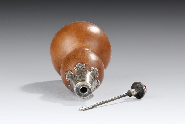 Made from natural double gourd, the snuff bottle retains the natural color and grains, the top encased in metal with ruyi cloud pattern, the bottom metal in lotus leaf form, the stopper of bright red color. Republic Period