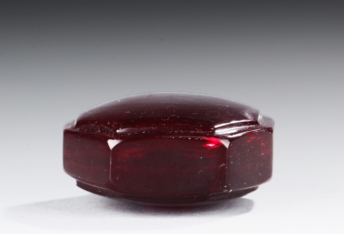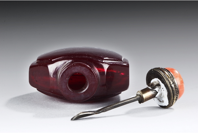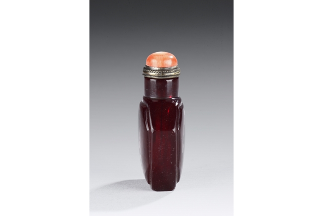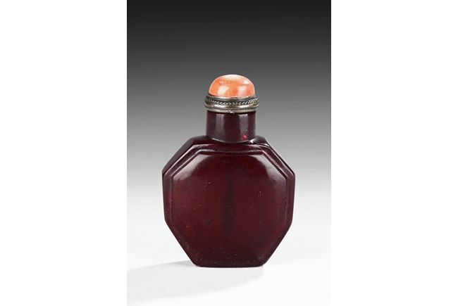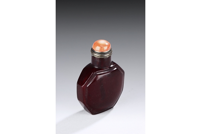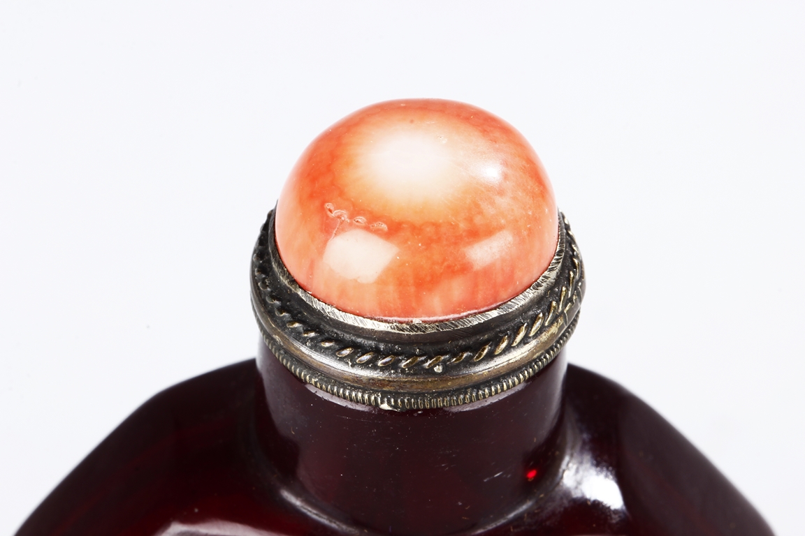 Of flattened octagonal form, the snuff bottle made from dark red glass, with cylindrical neck, coral and metal stopper. Qing Dynasty Period.