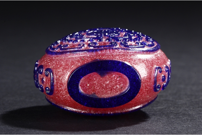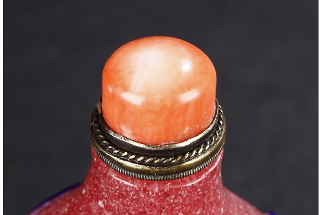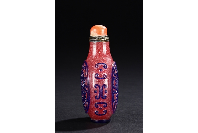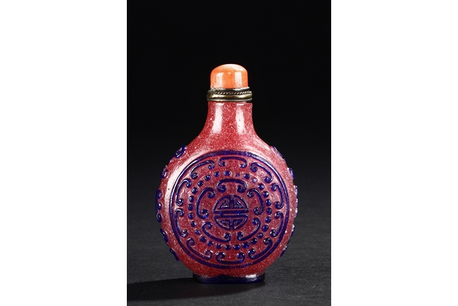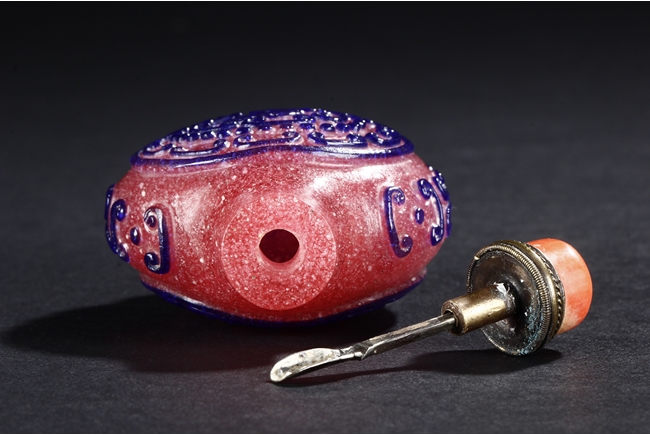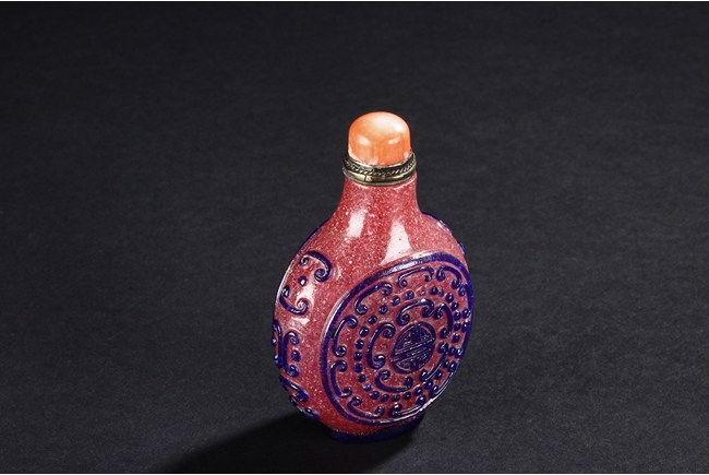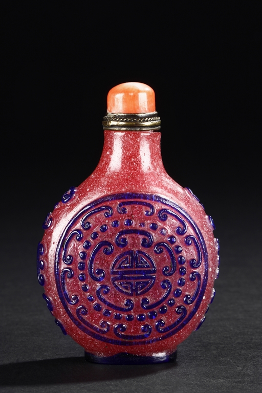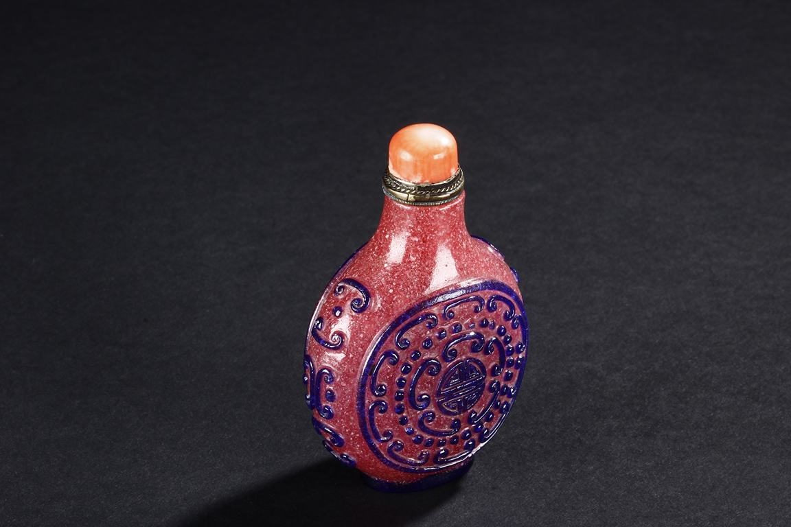 Of flattened ovoid form, the blue overlay in patterns of flower blossoms on the front, side, and back, against white dotted red glass, the rim encased in bronze, and capped with a coral stopper. Qing Dynasty Period.