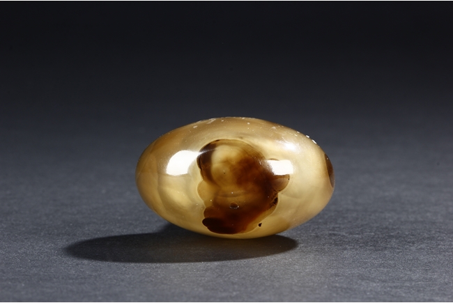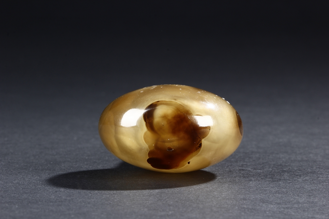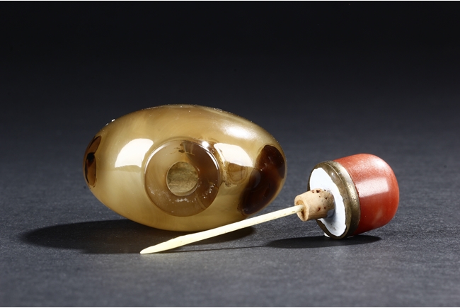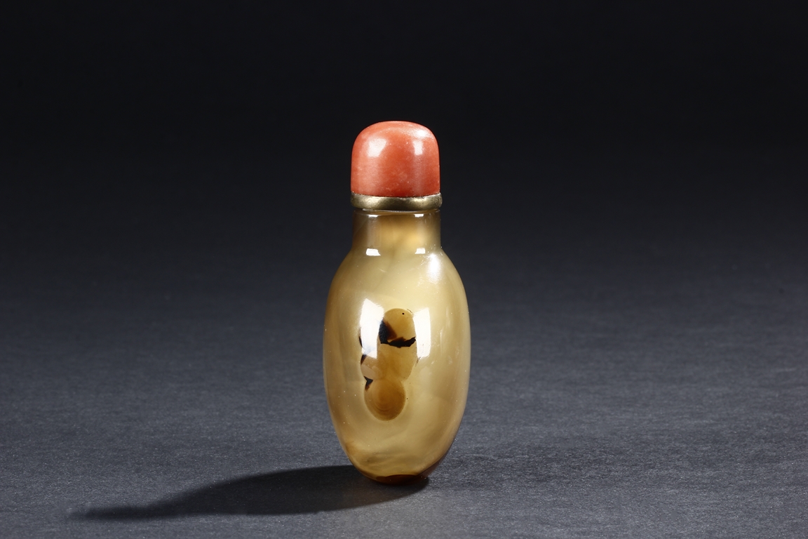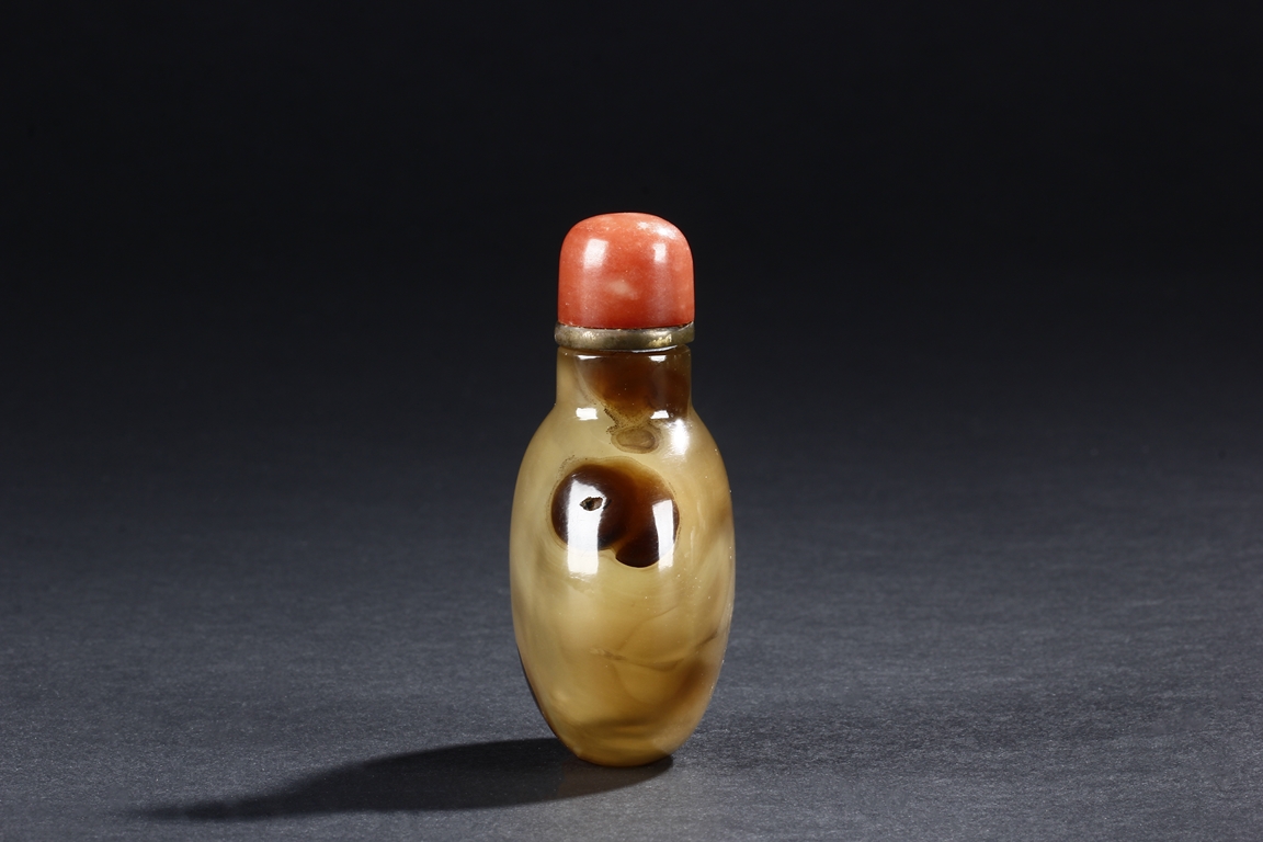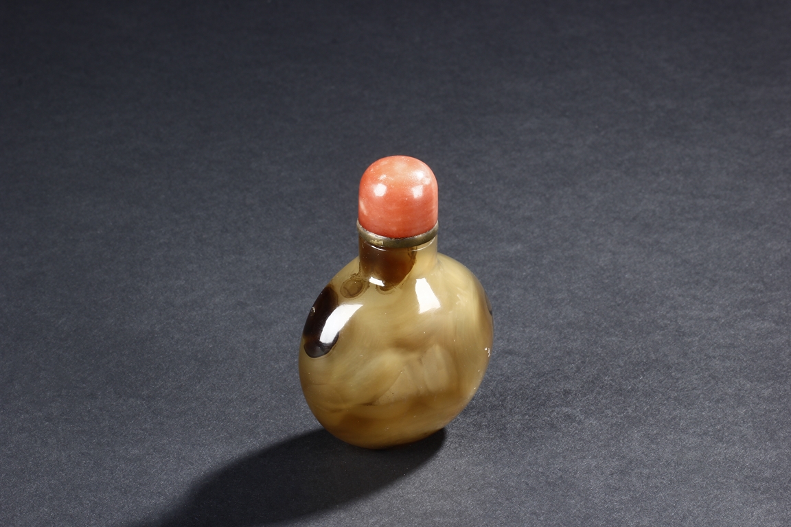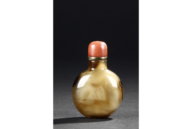 Of flattened ovoid form, the body with natural agate colors, mostly yellowish-white and patches of dark brown, with slight transparency, complete with coral stopper. Qing Dynasty Period.